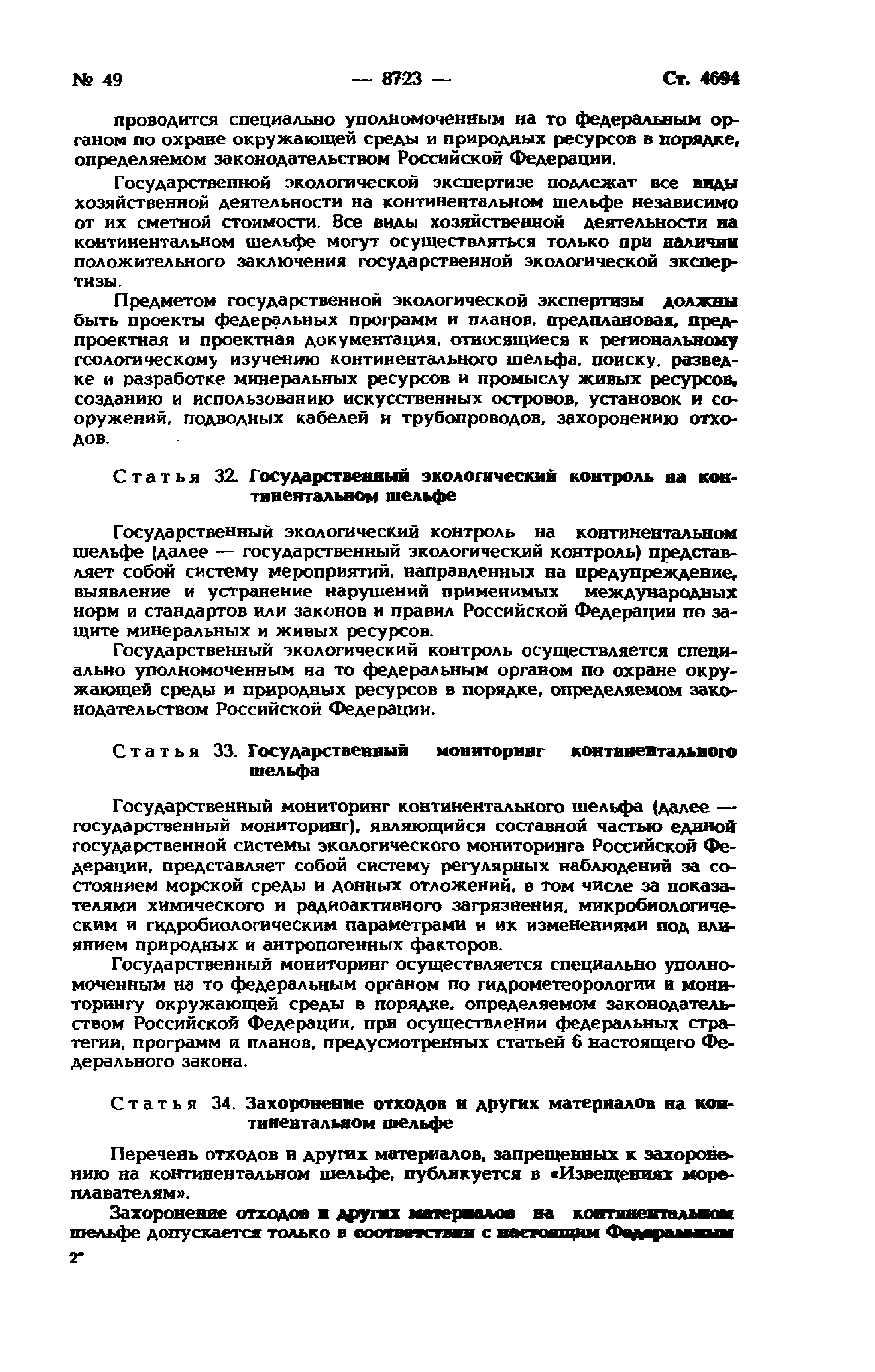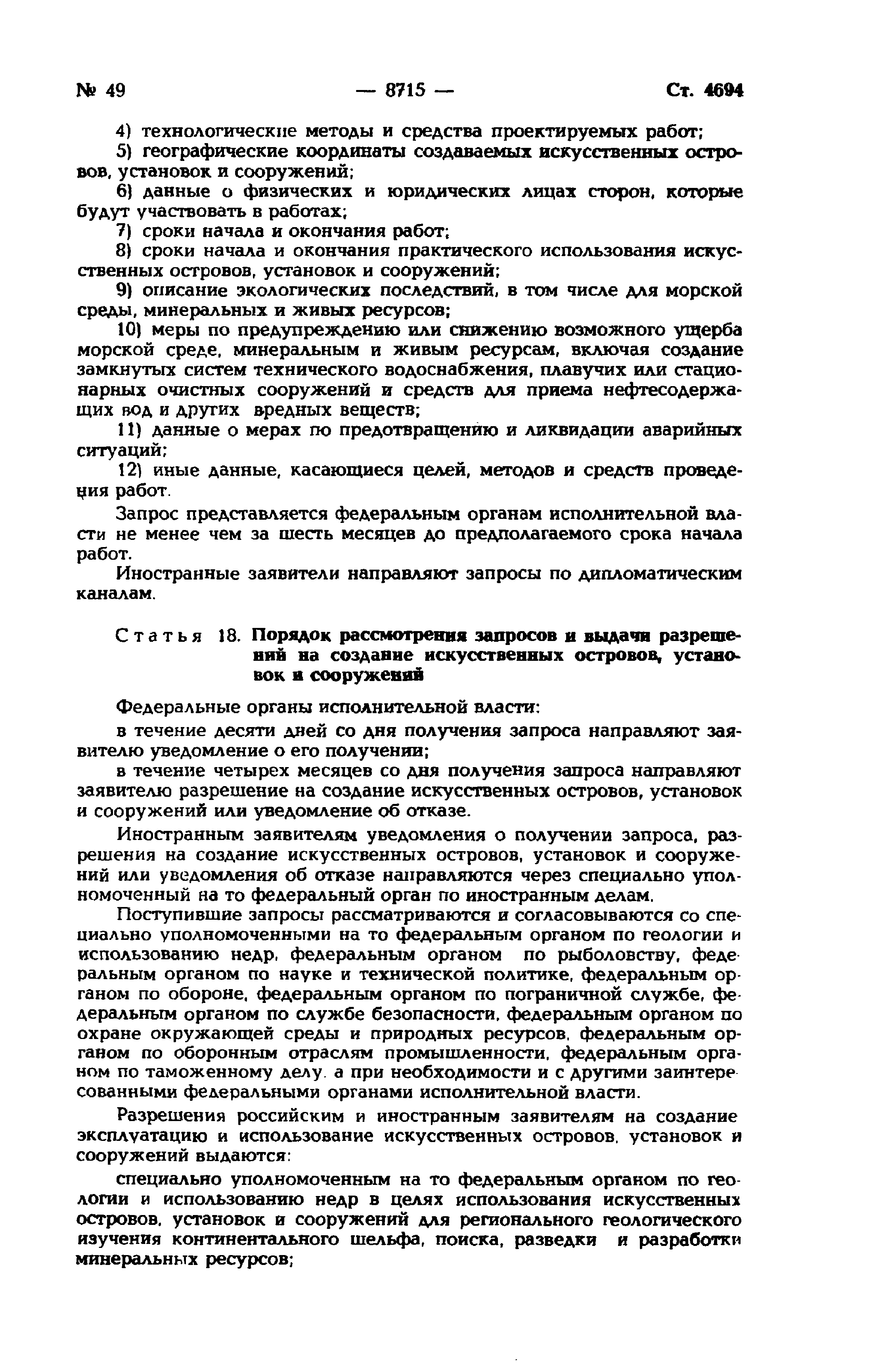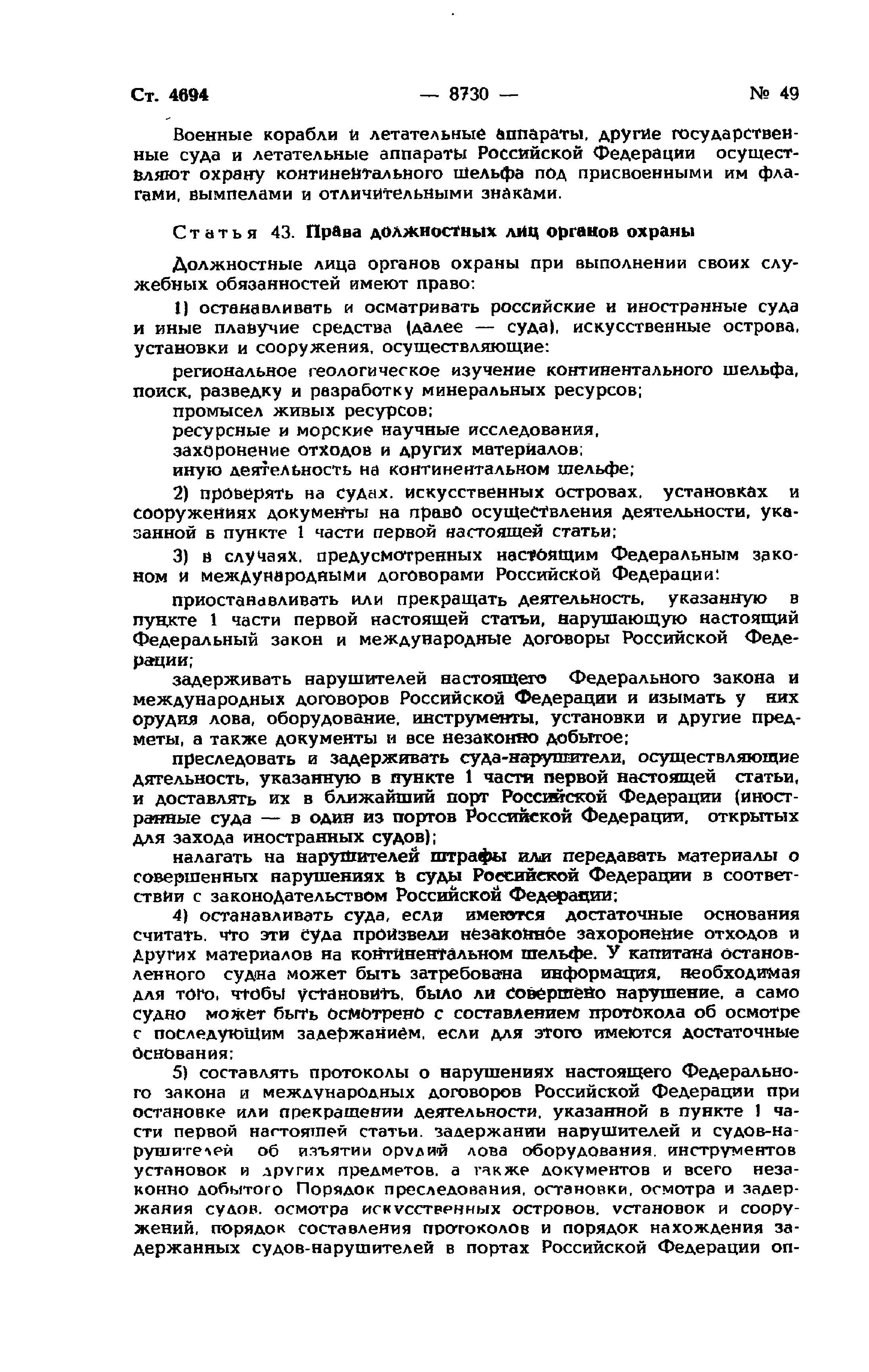 | Оглавление: | Глава I. Общие положения Глава II. Разведка континентального шельфа и разработка его минеральных ресурсов Глава III. Особенности рыболовства на континентальном шельфе Глава IV. Создание, эксплуатация, использование искусственных островов, установок, сооружений, прокладка подводных кабелей и трубопроводов на континентальном шельфе, особенности проведения указанных работ, а также буровых работ Глава V. Морские научные исследования Глава VI. Защита и сохранение морской среды, природных ресурсов континентального шельфа, захоронение отходов и других материалов Глава VII. Особенности экономических отношений при пользовании континентальным шельфом Глава VIII. Обеспечение выполнения положений настоящего Федерального закона |