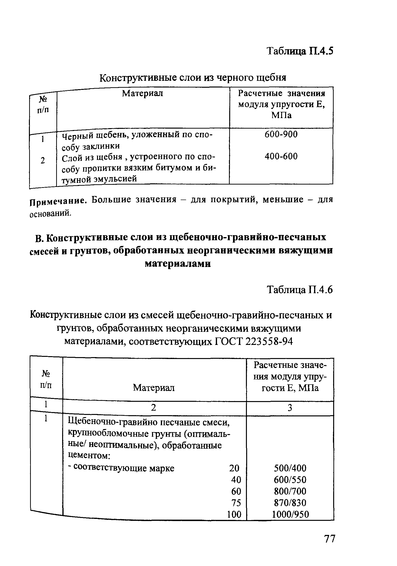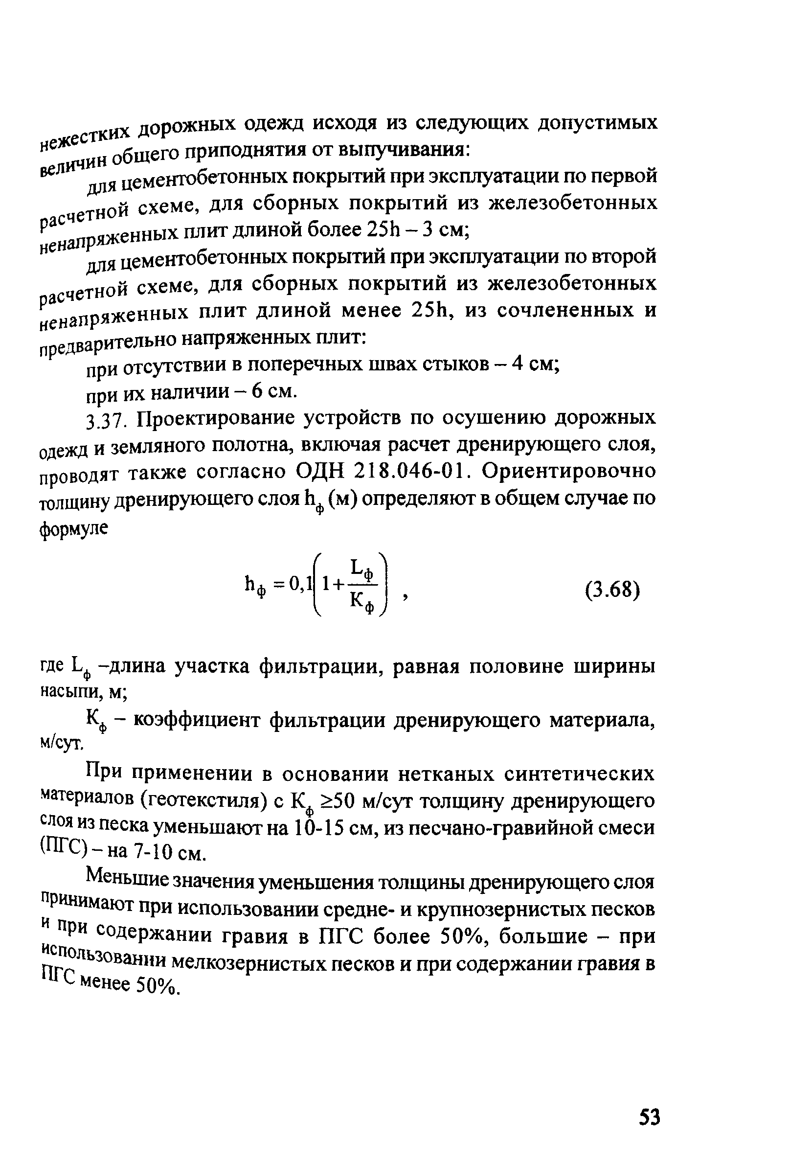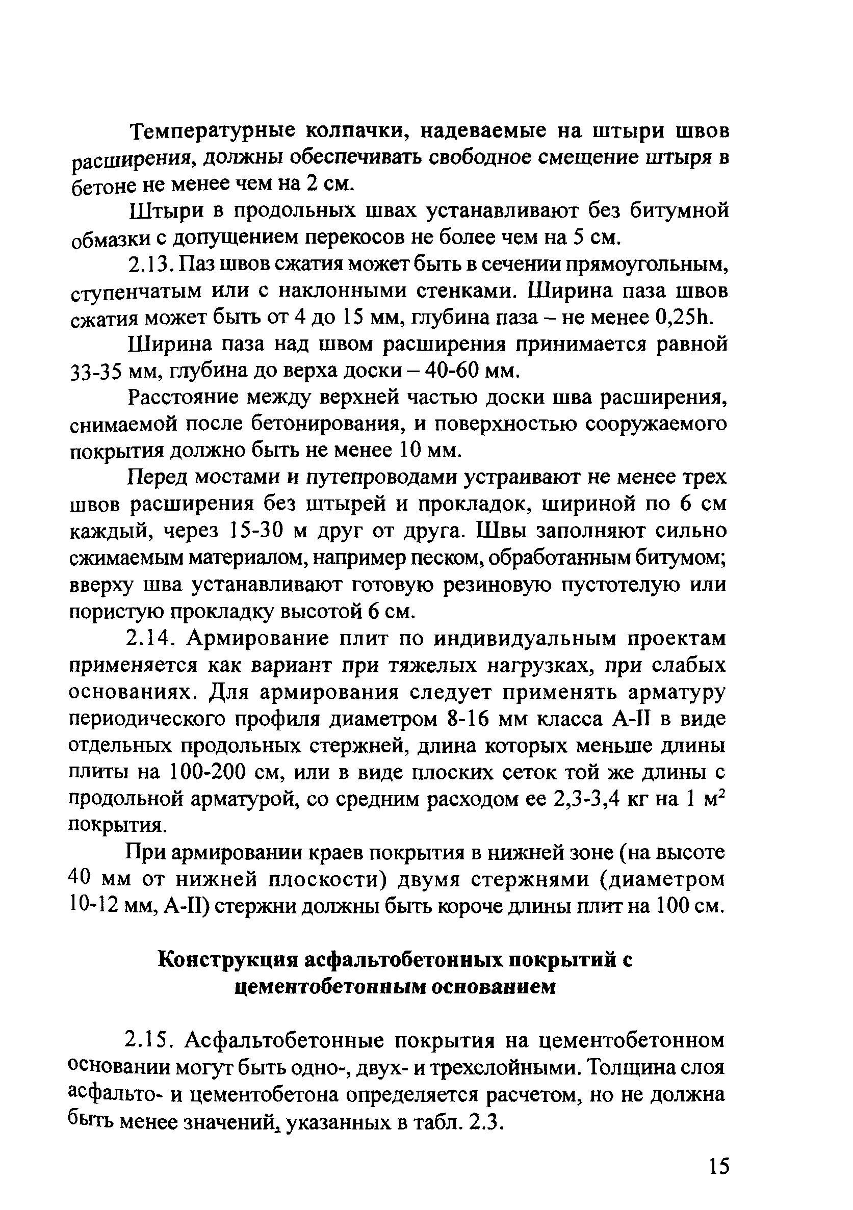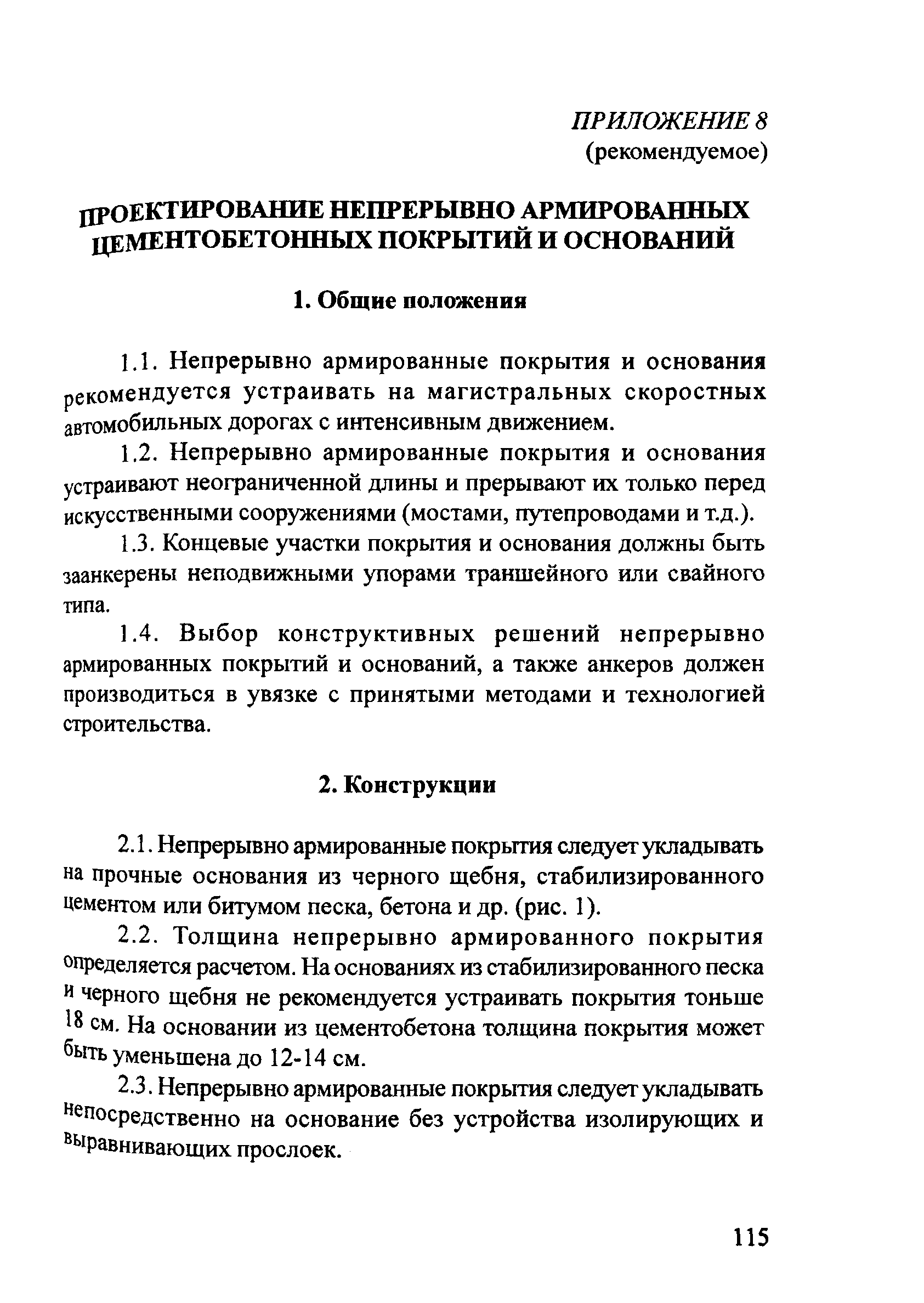 | Оглавление: | 1. Общие положения 2. Конструирование жестких дорожных одежд Конструкция монолитных цементобетонных покрытий Конструкция асфальтобетонных покрытий с цементобетонным основанием Конструкция колейных покрытий Конструкция дорожных одежд со сборными покрытиями 3. Расчет жестких дорожных одежд Расчетные параметры подвижной нагрузки Расчет монолитных цементобетонных покрытий Расчет параметров конструкций и элементов деформационных швов Обеспечение герметизации швов бетонных покрытий Расчет асфальтобетонных покрытий с цементобетонным основанием Мероприятия по замедлению развития трещин в асфальтобетонном покрытии Расчет колейных покрытий Расчет сборных покрытий из плит Расчет основания Расчет по условию сдвигоустойчивости подстилающего грунта и малосвязных конструктивных слоев Проверка дорожной конструкции на морозоустойчивость дренирующую способность Приложение 1 Нормативные и расчетные характеристики цементобетона Приложение 2 Расчетные нагрузки Приложение 3 Определение расчетных характеристик грунта рабочего слоя земляного полотна при расчете дорожной одежды на прочность Приложение 4 Таблицы нормативных и расчетных значений прочностных и деформационных характеристик конструктивных слоев из различных дорожно-строительных материалов Приложение 5 Теплофизические характеристики конструктивных слоев из различных дорожно-строительных материалов Приложение 6 Параметры для определения расчетного суммарного числа приложений нагрузки за срок службы дорожной одежды Приложение 7 Примеры расчета Приложение 8 Проектирование непрерывно армированных цементобетонных покрытий и оснований |