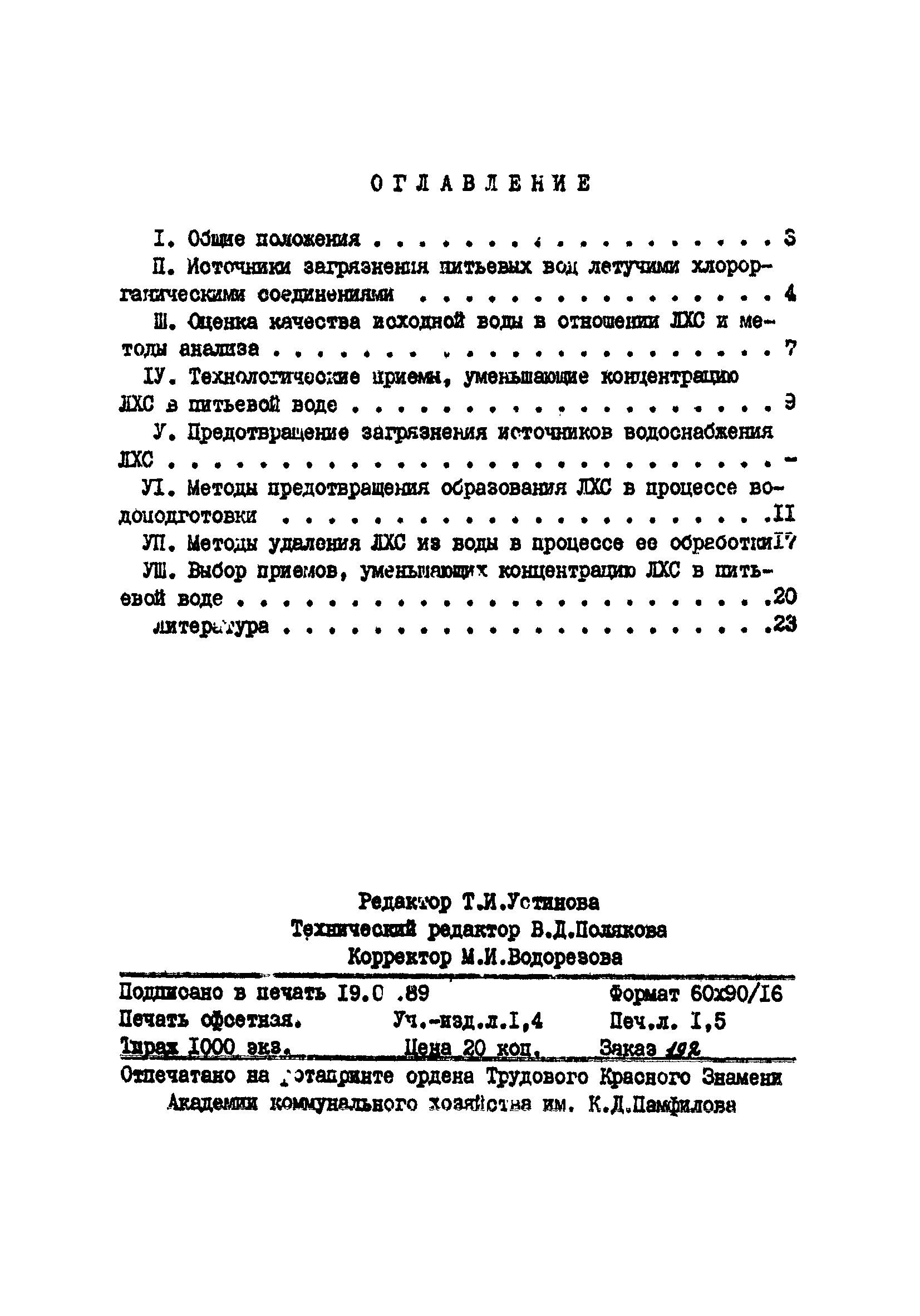 | Оглавление: | I Общие положения II Источники загрязнения питьевых вод летучими хлорорганическими соединениями III Оценка качества исходной воды в отношении ЛХС и методы анализа IV Технологические приемы, уменьшающие концентрацию ЛХС в питьевой воде V Предотвращение загрязнения источников водоснабжения ЛХС VI Методы предотвращения образования ЛХС в процессе водоподготовки VII Методы удаления ЛХС из воды в процессе ее обработки VIII Выбор приемов, уменьшающих концентрацию ЛХС в питьевой воде Литература |