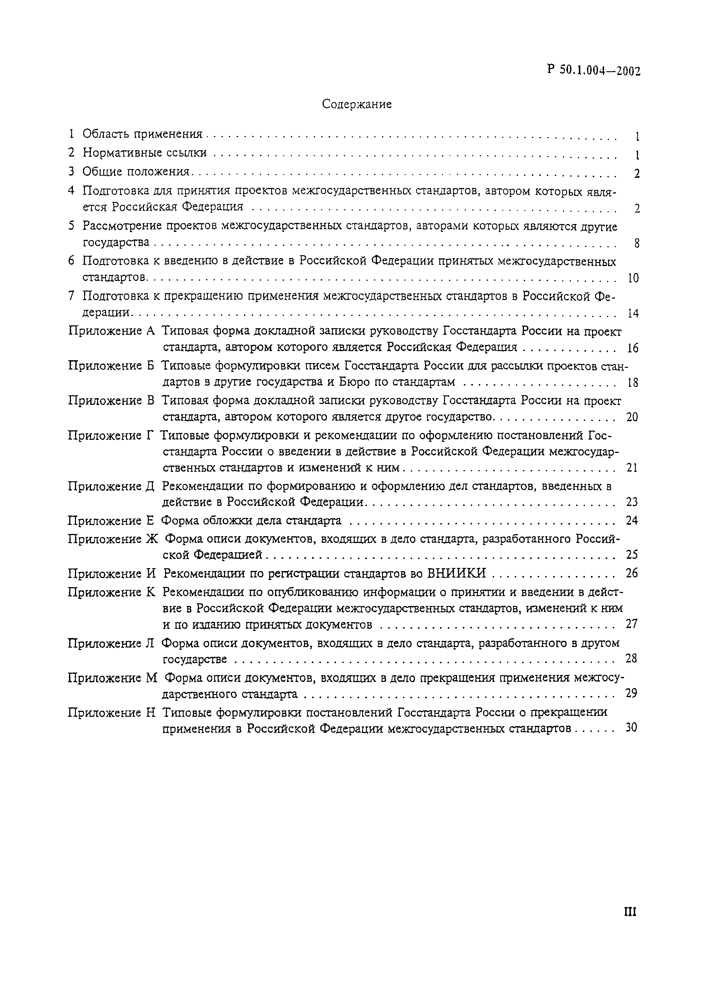 | Оглавление: | 1 Область применения 2 Нормативные ссылки 3 Общие положения 4 Подготовка для принятия проектов межгосударственных стандартов, автором которых является Российская Федерация 5 Рассмотрение проектов межгосударственных стандартов, авторами которых являются другие государства 6 Подготовка к введению в действие в Российской Федерации принятых межгосударственных стандартов 7 Подготовка к прекращению применения межгосударственных стандартов в Российской Федерации Приложение А Типовая форма докладной записки руководству Госстандарта России на проект стандарта, автором которого является Российская Федерация Приложение Б Типовые формулировки писем Госстандарта России для рассылки проектов стандартов в другие государства и Бюро по стандартам Приложение В Типовая форма докладной записки руководству Госстандарта России на проект стандарта, автором которого является другое государство Приложение Г Типовые формулировки и рекомендации по оформлению постановлений Госстандарта России о введении в действие в Российской Федерации межгосударственных стандартов и изменений к ним Приложение Д Рекомендации по формированию и оформлению дел стандартов, введенных в действие в Российской Федерации Приложение Е Форма обложки дела стандарта Приложение Ж Форма описи документов, входящих в дело стандарта, разработанного Российской Федерацией Приложение И Рекомендации по регистрации стандартов во ВНИИКИ Приложение К Рекомендации по опубликованию информации о принятии и введении в действие в Российской Федерации межгосударственных стандартов, изменений к ним и по изданию принятых документов Приложение Л Форма описи документов, входящих в дело стандарта, разработанного в другом государстве Приложение М Форма описи документов, входящих в дело прекращения применения межгосударственного стандарта Приложение Н Типовые формулировки постановлений Госстандарта России о прекращении применения в Российской Федерации межгосударственных стандартов |