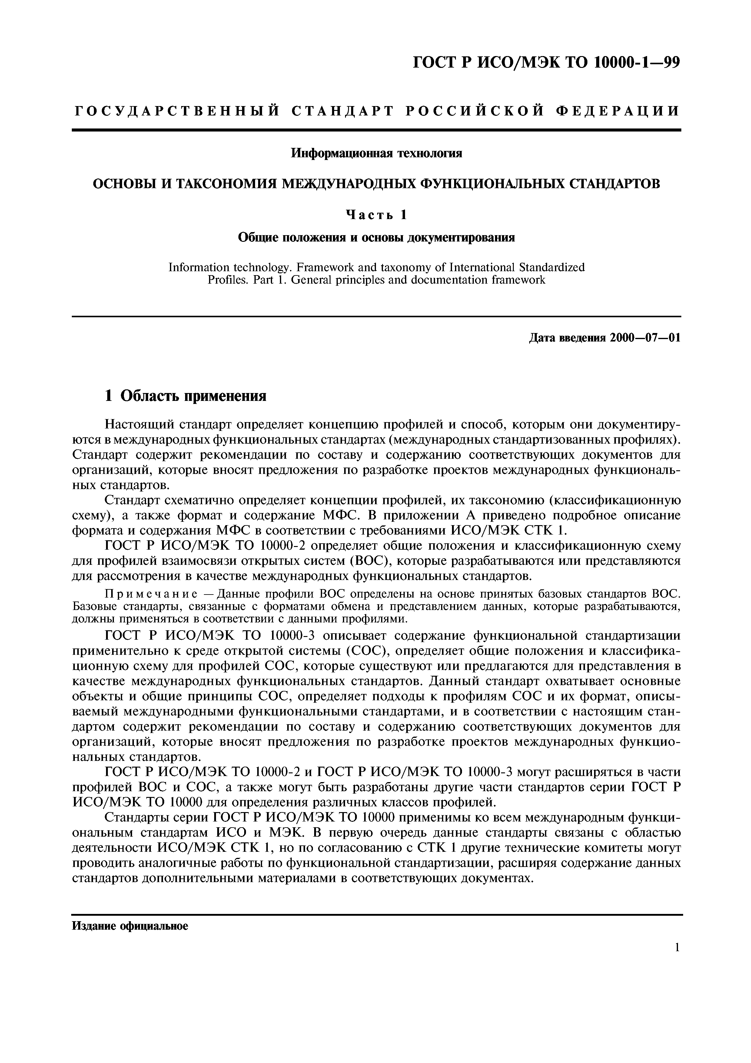| Область применения: | Стандарт определяет концепцию профилей и способ, которым они документируются в международных функциональных стандартах (международных стандартизованных профилях). |