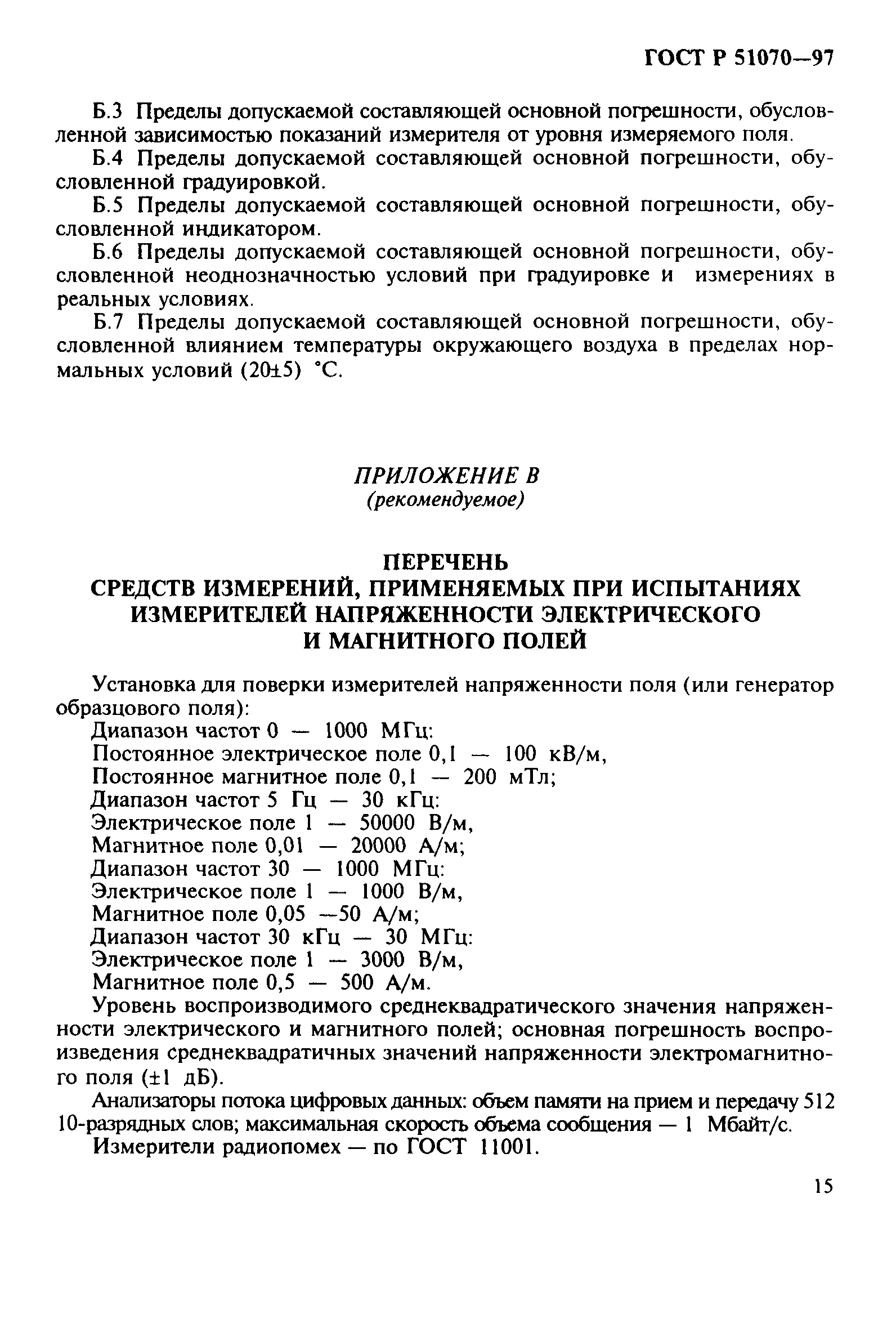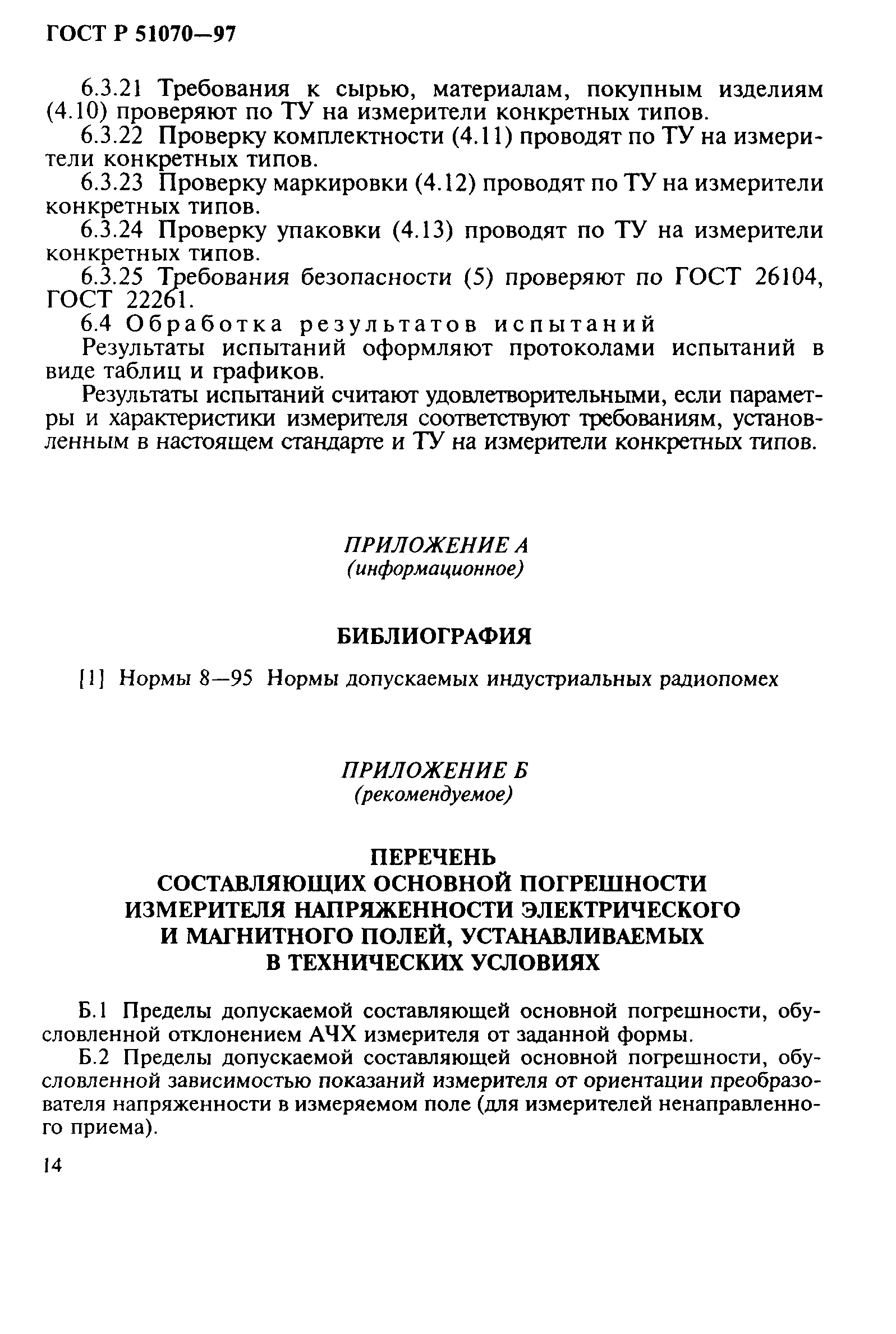 | Оглавление: | 1. Область применения 2. Нормативные ссылки 3. Определения 4. Общие технические требования 5. Требования безопасности 6. Методы испытаний Приложение А. Библиография Приложение Б. Перечень составляющих основной погрешности измерителя напряженности электрического и магнитного полей, устанавливаемых в технических условиях Приложение В. Перечень средств измерений, применяемых при испытаниях измерителей напряженности электрического и магнитного полей |