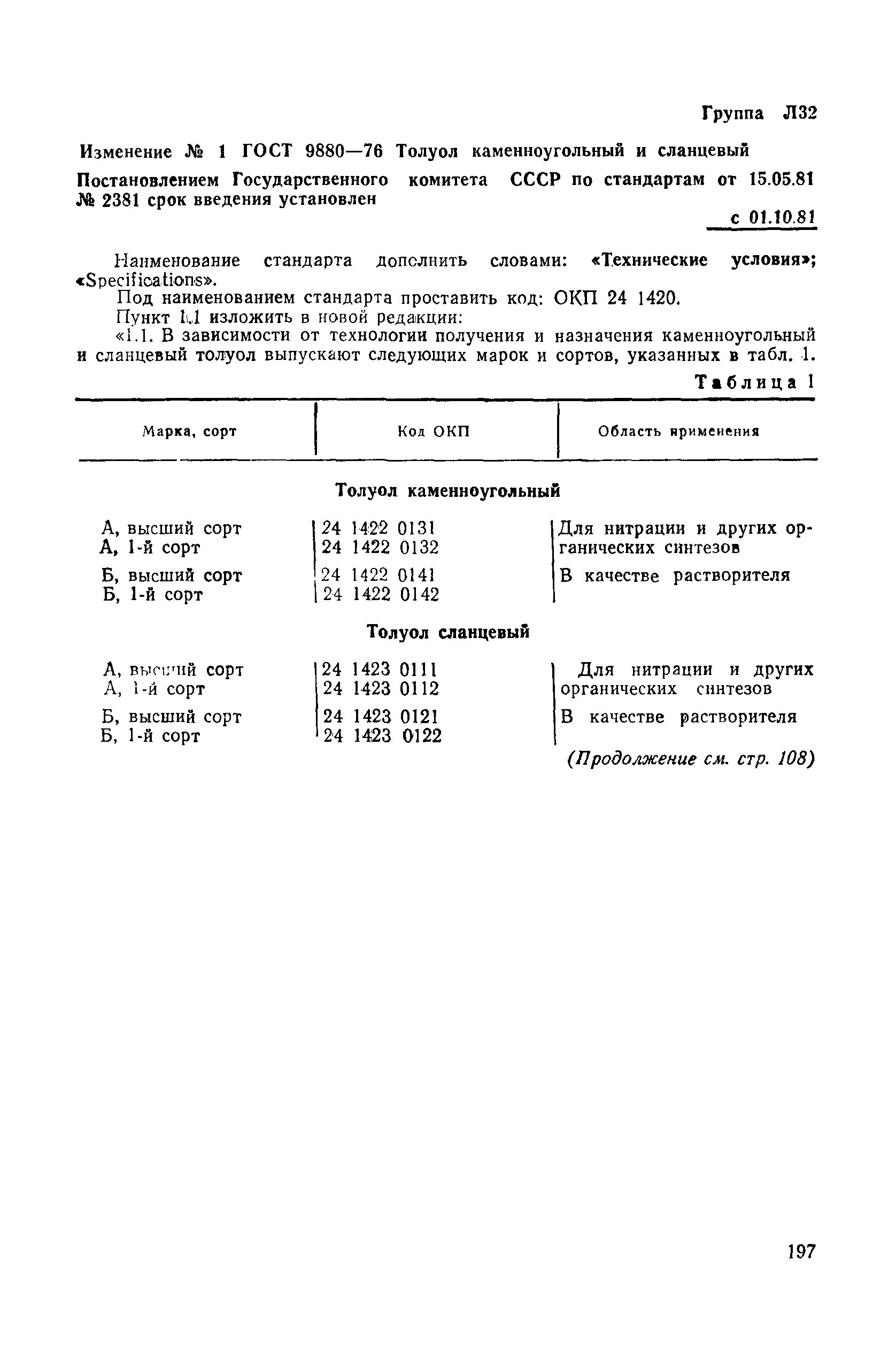 | Заменяет собой: | ГОСТ 5.1047-71 «Толуол каменноугольный. Требования к качеству аттестованной продукции» ГОСТ 9880-61 «Толуол каменноугольный» (Сведения из перечня "Указатель государственных стандартов СССР 1980 г.", Издательство стандартов 1980) |