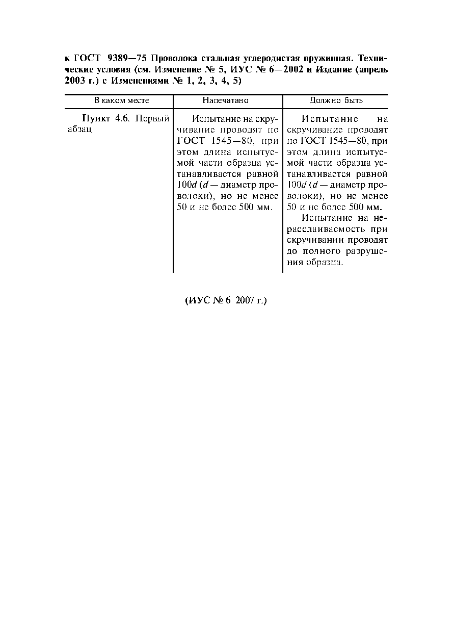 | | Список изменений: | | | Заменяет собой: | ГОСТ 9389-60 «Проволока стальная углеродистая пружинная» | | Нормативные ссылки: |   ГОСТ 1050-88 «Прокат сортовой, калиброванный, со специальной отделкой поверхности из углеродистой качественной конструкционной стали. Общие технические условия»  ГОСТ 1545-80 «Проволока. Метод испытания на скручивание»  ГОСТ 10446-80 «Проволока. Метод испытания на растяжение»  ГОСТ 10447-93 «Проволока. Метод испытания на навивание»  ГОСТ 15150-69 «Машины, приборы и другие технические изделия. Исполнения для различных климатических районов. Категории, условия эксплуатации, хранения и транспортирования в части воздействия климатических факторов внешней среды»  ГОСТ 28840-90 «Машины для испытания материалов на растяжение, сжатие и изгиб. Общие технические требования»  ГОСТ 14192-96 «Маркировка грузов»  ГОСТ 1435-99 «Прутки, полосы и мотки из инструментальной нелегированной стали. Общие технические условия»  ГОСТ 10354-82 «Пленка полиэтиленовая. Технические условия»  ГОСТ 8273-75 «Бумага оберточная. Технические условия»  ГОСТ 8828-89 «Бумага-основа и бумага двухслойная водонепроницаемая упаковочная. Технические условия»  ГОСТ 3282-74 «Проволока стальная низкоуглеродистая общего назначения. Технические условия»  ГОСТ 24597-81 «Пакеты тарно-штучных грузов. Основные параметры и размеры»  ГОСТ 21650-76 «Средства скрепления тарно-штучных грузов в транспортных пакетах. Общие требования»  ГОСТ 17308-88 «Шпагаты. Технические условия»  ГОСТ 14959-79 «Прокат из рессорно-пружинной углеродистой и легированной стали. Технические условия»  ГОСТ 9569-79 «Бумага парафинированная. Технические условия»  ГОСТ 6507-90 «Микрометры. Технические условия»  ГОСТ 22225-76 «Контейнеры универсальные массой брутто 0,625 и 1,25 т. Технические условия» ГОСТ 10396-84 «Бумага кабельная крепированная. Технические условия»  ГОСТ 10877-76 «Масло консервационное К-17. Технические условия»  ГОСТ 15102-75 «Контейнер универсальный металлический закрытый номинальной массой брутто 5,0 т. Технические условия» ГОСТ 16272-79 «Пленка поливинилхлоридная пластифицированная техническая. Технические условия»  ГОСТ 1763-68 «Сталь. Методы определения глубины обезуглероженного слоя» ГОСТ 18617-83 «Ящики деревянные для металлических изделий. Технические условия» ГОСТ 20435-75 «Контейнер универсальный металлический закрытый номинальной массой брутто 3,0 т. Технические условия» ГОСТ 4381-87 «Микрометры рычажные. Общие технические условия»  ГОСТ 15846-2002 «Продукция, отправляемая в районы Крайнего Севера и приравненные к ним местности. Упаковка, маркировка, транспортирование и хранение»