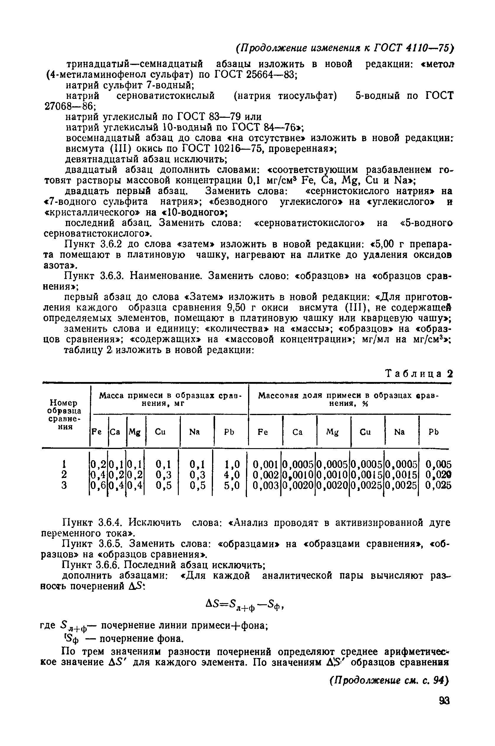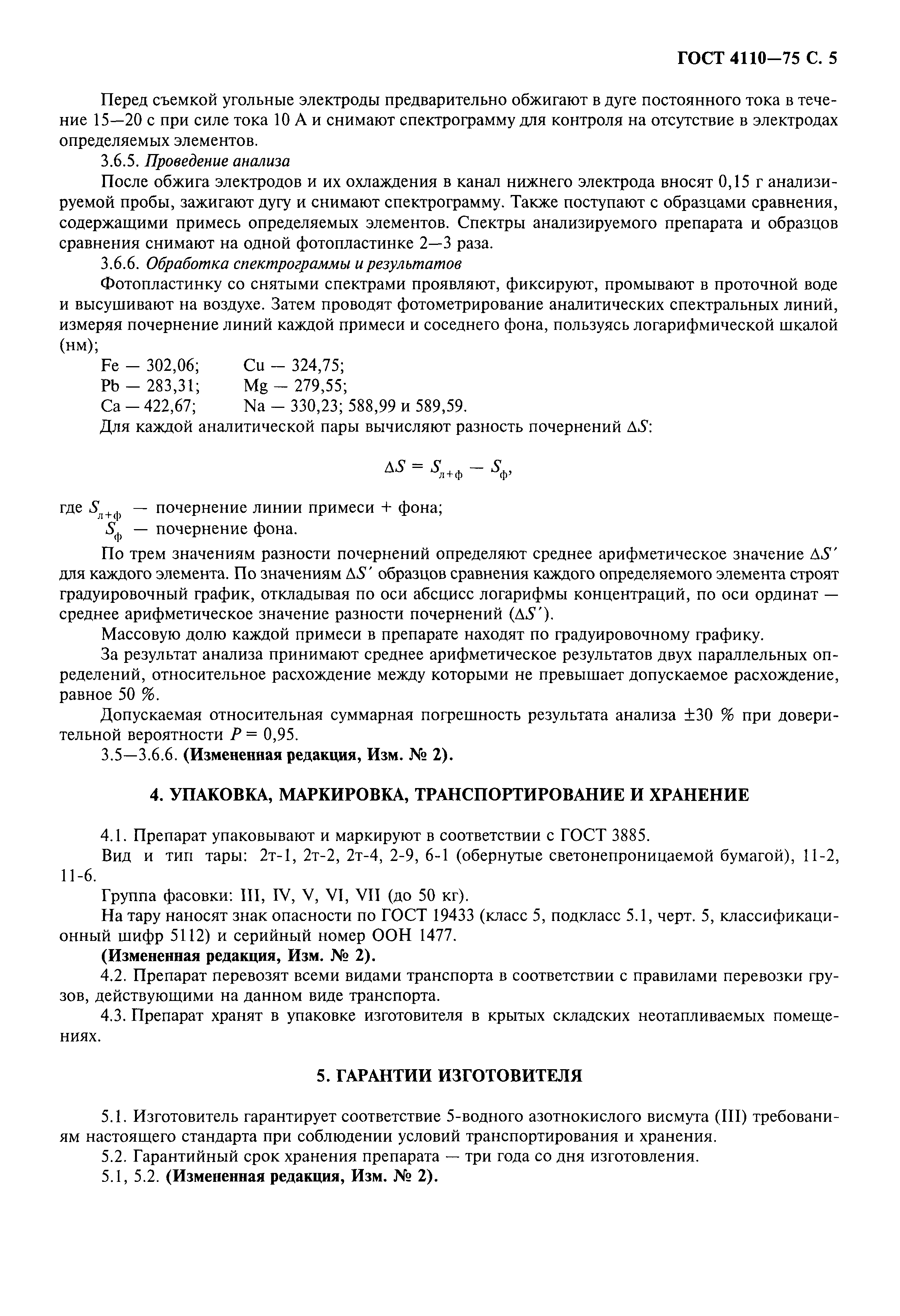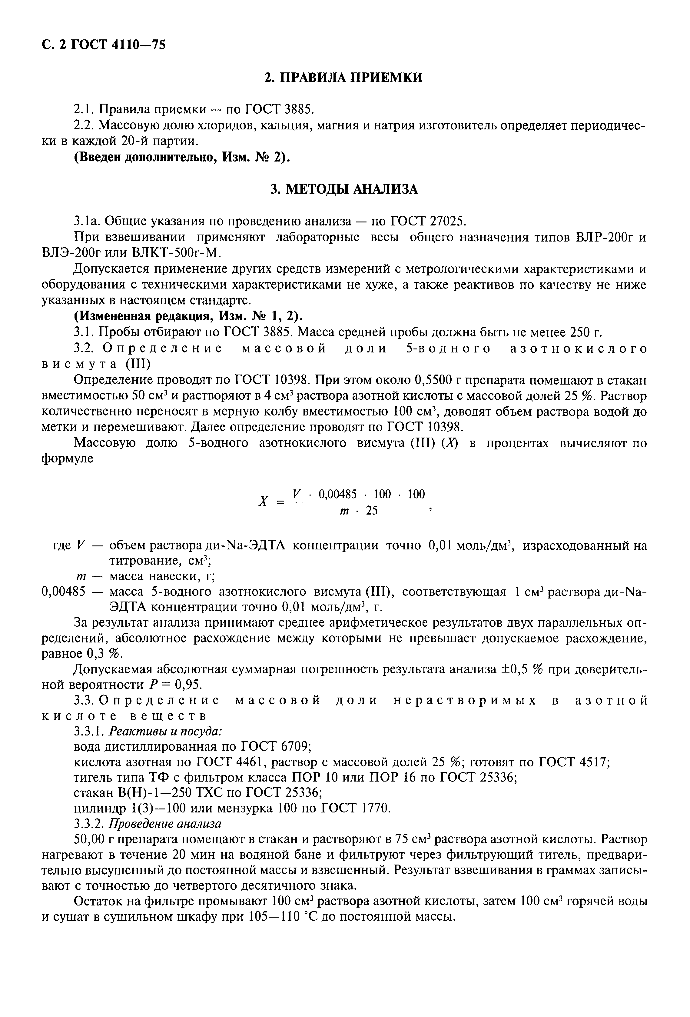 | | Список изменений: | | | Заменяет собой: | ГОСТ 4110-62 «Висмут азотнокислый» | | Нормативные ссылки: |   ГОСТ 12.1.005-88 «Система стандартов безопасности труда. Общие санитарно-гигиенические требования к воздуху рабочей зоны»  ГОСТ 6709-72 «Вода дистиллированная. Технические условия» ГОСТ 10216-75 «Реактивы. Висмута (III) окись. Технические условия» ГОСТ 10398-76 «Реактивы и особо чистые вещества. Комплексонометрический метод определения содержания основного вещества» ГОСТ 10671.7-74 «Реактивы. Методы определения примеси хлоридов» ГОСТ 1770-74 «Посуда мерная лабораторная стеклянная. Цилиндры, мензурки, колбы, пробирки. Общие технические условия»  ГОСТ 19433-88 «Грузы опасные. Классификация и маркировка» ГОСТ 19627-74 «Гидрохинон (парадиоксибензол). Технические условия» ГОСТ 19908-90 «Тигли, чаши, стаканы, колбы, воронки, пробирки и наконечники из прозрачного кварцевого стекла. Общие технические условия» ГОСТ 25336-82 «Посуда и оборудование лабораторные стеклянные. Типы, основные параметры и размеры»  ГОСТ 25664-83 «Метол (4-метиламинофенол сульфат). Технические условия»  ГОСТ 27025-86 «Реактивы. Общие указания по проведению испытаний» ГОСТ 27068-86 «Реактивы. Натрий серноватистокислый (натрия тиосульфат) 5-водный. Технические условия»  ГОСТ 29227-91 «Посуда лабораторная стеклянная. Пипетки градуированные. Часть 1. Общие требования»  ГОСТ 3118-77 «Реактивы. Кислота соляная. Технические условия» ГОСТ 3773-72 «Реактивы. Аммоний хлористый. Технические условия»  ГОСТ 3885-73 «Реактивы и особо чистые вещества. Правила приемки, отбор проб, фасовка, упаковка, маркировка, транспортирование и хранение» ГОСТ 4160-74 «Реактивы. Калий бромистый. Технические условия»  ГОСТ 4212-76 «Реактивы. Методы приготовления растворов для колориметрического и нефелометрического анализа»  ГОСТ 4461-77 «Реактивы. Кислота азотная. Технические условия»  ГОСТ 4517-87 «Реактивы. Методы приготовления вспомогательных реактивов и растворов, применяемых при анализе»  ГОСТ 6563-75 «Изделия технические из благородных металлов и сплавов. Технические условия»  ГОСТ 83-79 «Реактивы. Натрий углекислый. Технические условия» ГОСТ 84-76 «Реактивы. Натрий углекислый 10-водный. Технические условия»  ГОСТ 9147-80 «Посуда и оборудование лабораторные фарфоровые. Технические условия» ГОСТ 10671.5-74 «Реактивы. Методы определения примеси сульфатов»