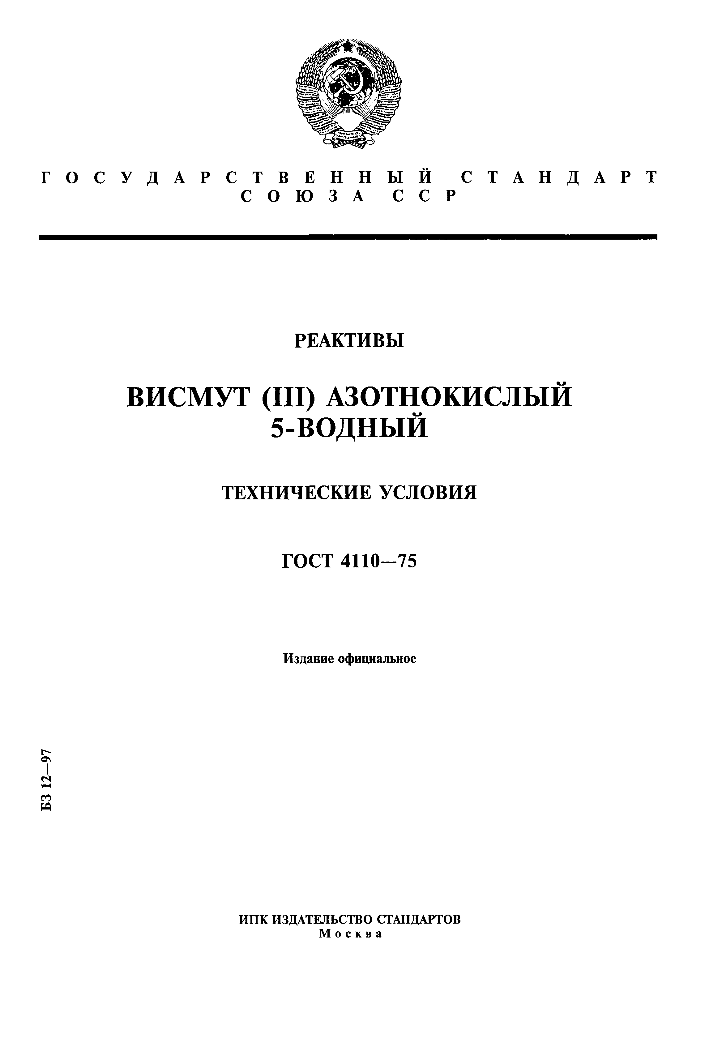 Скачать ГОСТ 4110-75 Реактивы. Висмут (III) азотнокислый 5-водный. Технические условияДата актуализации: 01.01.2021 ГОСТ 4110-75