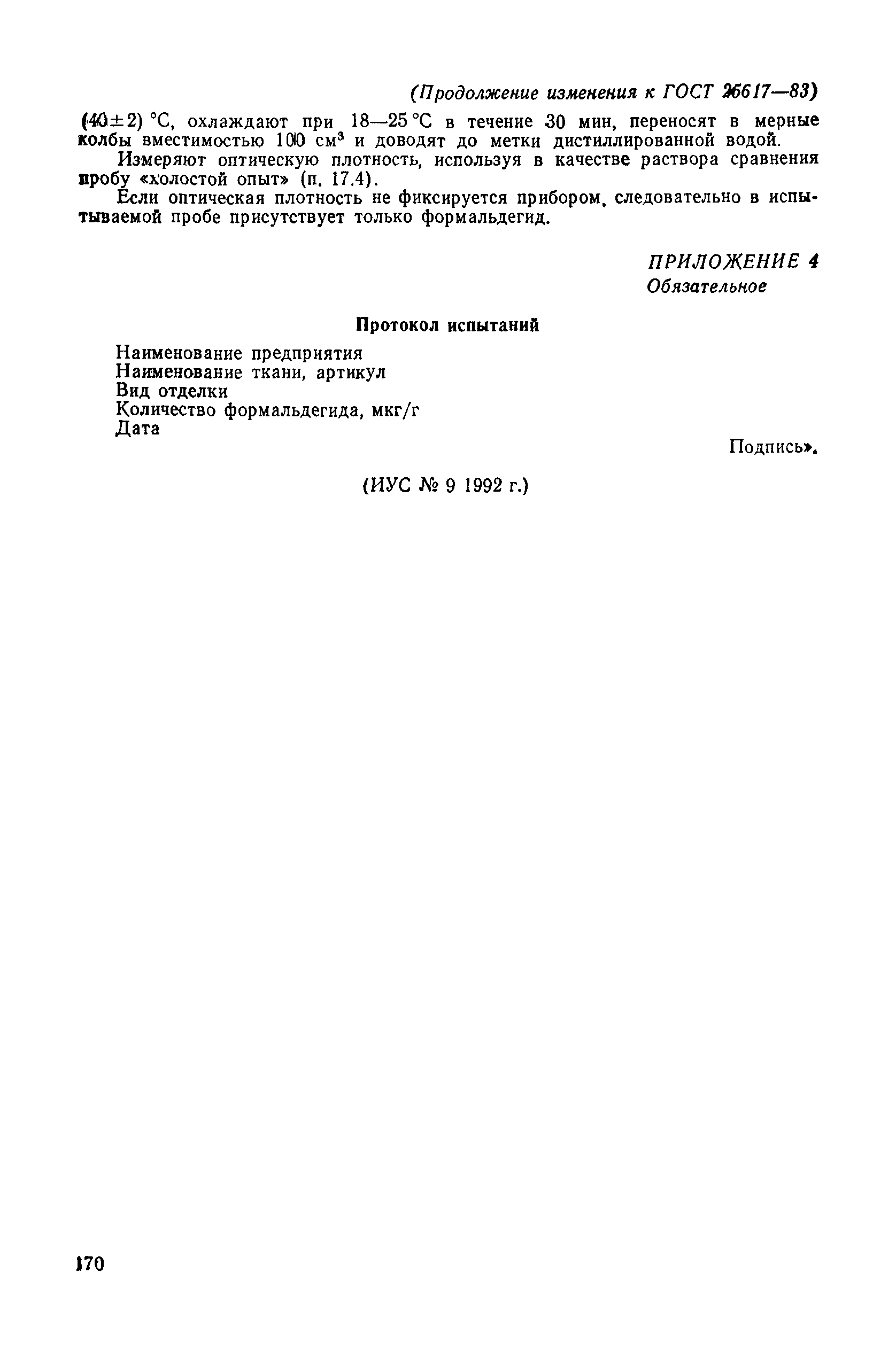 | | Список изменений: | | | Заменяет собой: | | | Нормативные ссылки: |   ГОСТ 6613-86 «Сетки проволочные тканые с квадратными ячейками. Технические условия» ГОСТ 1868-88 «Веревки технические и хозяйственные. Технические условия»  ГОСТ 427-75 «Линейки измерительные металлические. Технические условия»  ГОСТ 23932-90 «Посуда и оборудование лабораторные стеклянные. Общие технические условия»  ГОСТ 17308-88 «Шпагаты. Технические условия»  ГОСТ 28498-90 «Термометры жидкостные стеклянные. Общие технические требования. Методы испытаний»  ГОСТ 24104-2001 «Весы лабораторные. Общие технические требования»  ГОСТ 6709-72 «Вода дистиллированная. Технические условия» ГОСТ 10163-76 «Реактивы. Крахмал растворимый. Технические условия» ГОСТ 10259-78 «Реактивы. Ацетилацетон. Технические условия» ГОСТ 1027-67 «Реактивы. Свинец (II) уксуснокислый 3-водный. Технические условия» ГОСТ 10652-73 «Реактивы. Соль динатриевая этилендиамин-N,N,N',N'- тетрауксусной кислоты, 2-водная (трилон Б). Технические условия» ГОСТ 10681-75 «Материалы текстильные. Климатические условия для кондиционирования и испытания проб и методы их определения» ГОСТ 10929-76 «Реактивы. Водорода пероксид. Технические условия» ГОСТ 11827-77 «Диазоль алый К и диазоль розовый О. Технические условия»  ГОСТ 12026-76 «Бумага фильтровальная лабораторная. Технические условия» ГОСТ 1277-75 «Реактивы. Серебро азотнокислое. Технические условия» ГОСТ 14193-78 «Монохлорамин ХБ технический. Технические условия» ГОСТ 14919-83 «Электроплиты, электроплитки и жарочные электрошкафы бытовые. Общие технические условия» ГОСТ 14961-91 «Нитки льняные и льняные с химическими волокнами. Технические условия» ГОСТ 15160-69 «Ткани и изделия хлопчатобумажные технические для районов с тропическим климатом. Нормы и методы определения содержания антисептиков» ГОСТ 16218.0-93 «Изделия текстильно-галантерейные. Правила приемки и метод отбора проб» ГОСТ 1625-89 «Формалин технический. Технические условия» ГОСТ 1770-74 «Посуда мерная лабораторная стеклянная. Цилиндры, мензурки, колбы, пробирки. Общие технические условия» ГОСТ 18300-87 «Спирт этиловый ректификованный технический. Технические условия» ГОСТ 18481-81 «Ареометры и цилиндры стеклянные. Общие технические условия» ГОСТ 195-77 «Реактивы. Натрий сернистокислый. Технические условия» ГОСТ 199-78 «Реактивы. Натрий уксуснокислый 3-водный. Технические условия» ГОСТ 20288-74 «Реактивы. Углерод четыреххлористый. Технические условия» ГОСТ 20566-75 «Ткани и штучные изделия текстильные. Правила приемки и метод отбора проб»  ГОСТ 22867-77 «Реактивы. Аммоний азотнокислый. Технические условия» ГОСТ 25336-82 «Посуда и оборудование лабораторные стеклянные. Типы, основные параметры и размеры» ГОСТ 307.1-95 «Электроутюги бытовые. Технические условия» ГОСТ 307.2-95 «Электроутюги бытового и аналогичного назначения. Методы измерения рабочих характеристик» ГОСТ 3117-78 «Реактивы. Аммоний уксуснокислый. Технические условия»  ГОСТ 3118-77 «Реактивы. Кислота соляная. Технические условия» ГОСТ 3159-76 «Реактивы. Кальций уксуснокислый 1-водный. Технические условия» ГОСТ 3758-75 «Реактивы. Алюминий сернокислый 18-водный. Технические условия»  ГОСТ 3760-79 «Реактивы. Аммиак водный. Технические условия» ГОСТ 3772-74 «Реактивы. Аммоний фосфорнокислый двузамещенный. Технические условия» ГОСТ 3773-72 «Реактивы. Аммоний хлористый. Технические условия» ГОСТ 3816-81 «Полотна текстильные. Методы определения гигроскопич