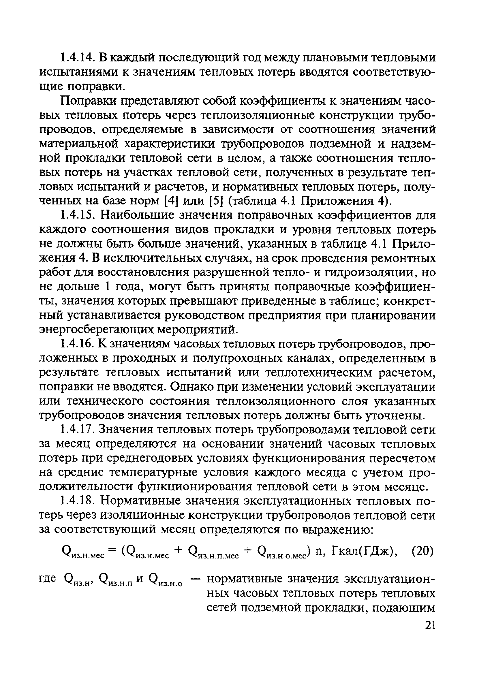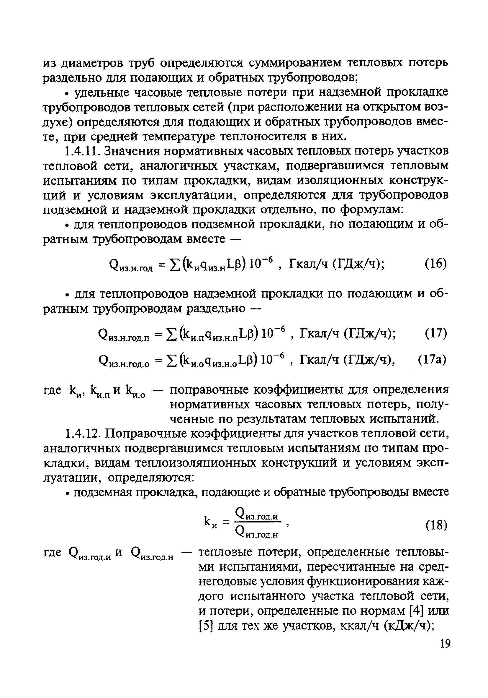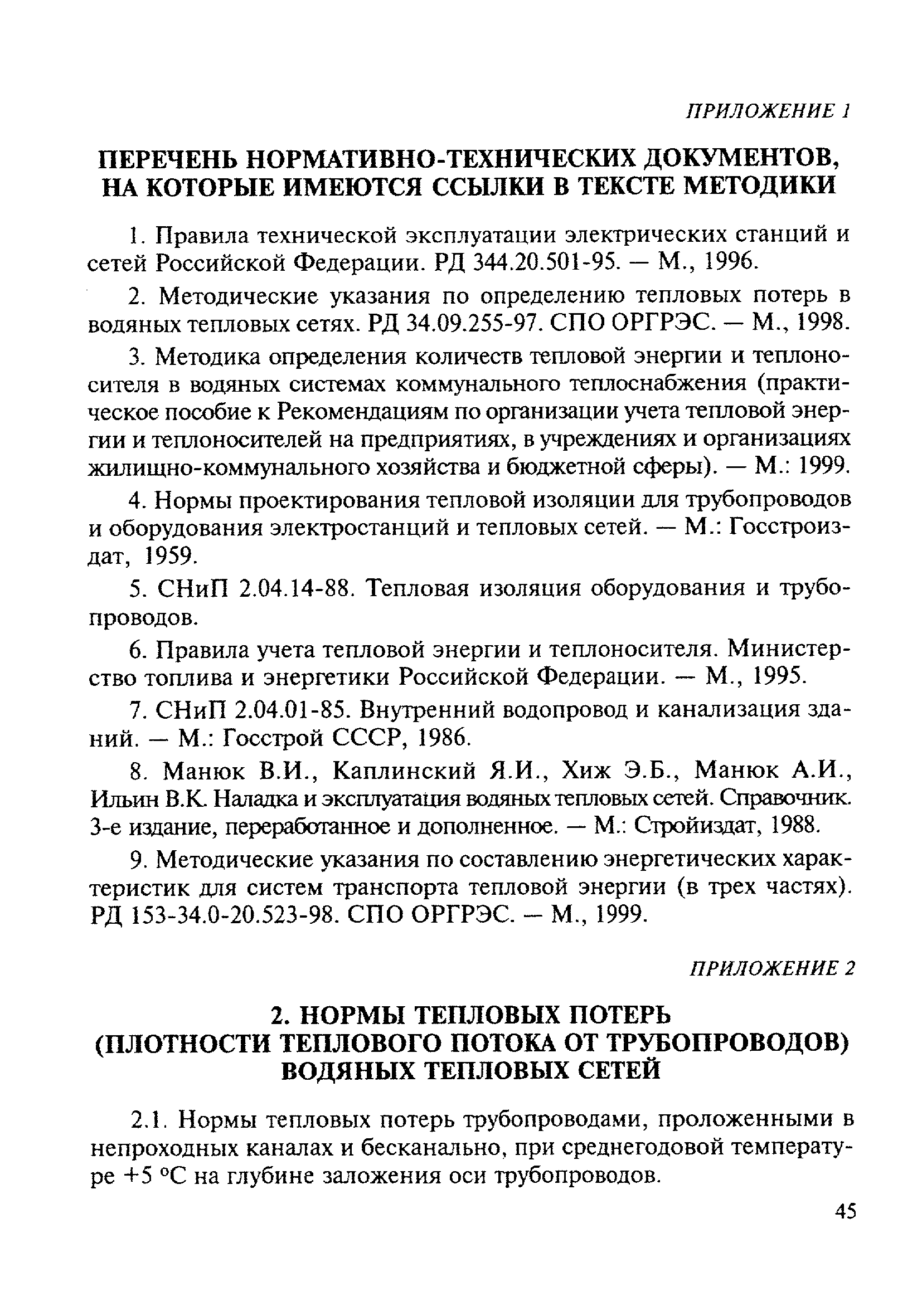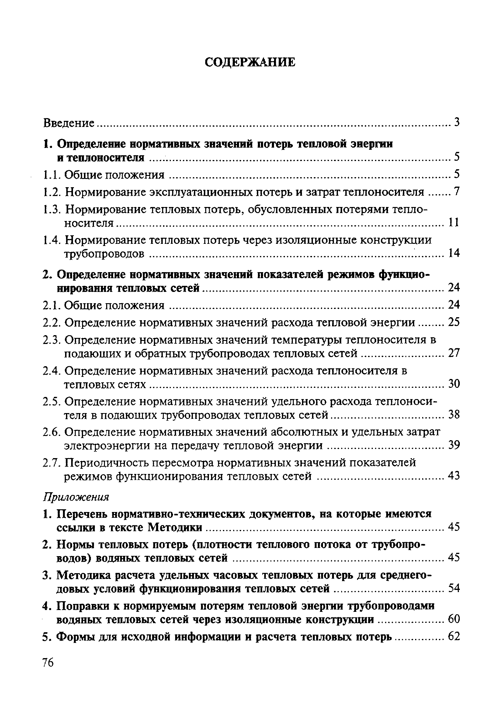 | Оглавление: | Введение 1 Определение нормативных значений потерь тепловой энергии и теплоносителя 1.1 Общие положения 1.2 Нормирование эксплуатационных потерь и затрат теплоносителя 1.3 Нормирование тепловых потерь, обусловленных потерями теплоносителя 1.4 Нормирование тепловых потерь через изоляционные конструкции трубопроводов 2 Определение нормативных значений показателей режимов функционирования тепловых сетей 2.1 Общие положения 2.2 Определение нормативных значений расхода тепловой энергии 2.3 Определение нормативных значений температуры теплоносителя в подающих и обратных трубопроводах тепловых сетей 2.4 Определение нормативных значений расхода теплоносителя в тепловых сетях 2.5 Определение нормативных значений удельного расхода теплоносителя в подающих трубопроводах тепловых сетей 2.6 Определение нормативных значений абсолютных и удельных затрат электроэнергии на передачу тепловой энергии 2.7 Периодичность пересмотра нормативных значений показателей режимов функционирования тепловых сетей Приложения: 1 Перечень нормативно-технических документов, на которые имеются ссылки в тексте Методики 2 Нормы тепловых потерь (плотности теплового потока от трубопроводов) водяных тепловых сетей 3 Методика расчета удельных часовых тепловых потерь для среднегодовых условий функционирования тепловых сетей 4 Поправки к нормируемым потерям тепловой энергии трубопроводами водяных тепловых сетей через изоляционные конструкции 5 Формы для исходной информации и расчета тепловых потерь 6 Удельный объем труб для определения объема трубопроводов тепловых сетей 7 Удельный объем систем теплопотребления 8 Формы для расчета потерь теплоносителя 9 Определение расчетных значений расхода теплоносителя по видам теплового потребления 10 Определение нормативных значений тепловых потерь трубопроводами тепловых сетей для характерных значений температуры наружного воздуха |