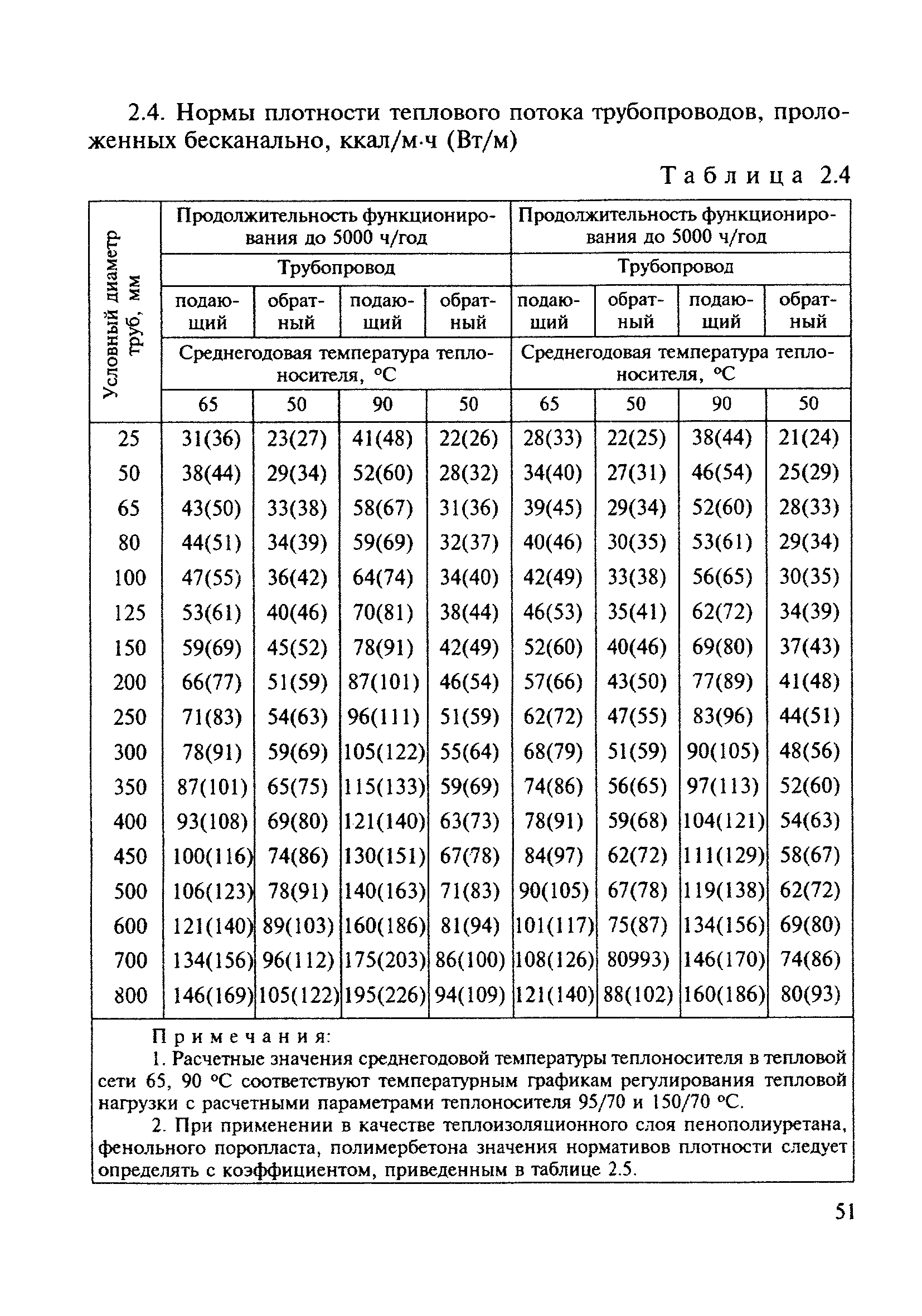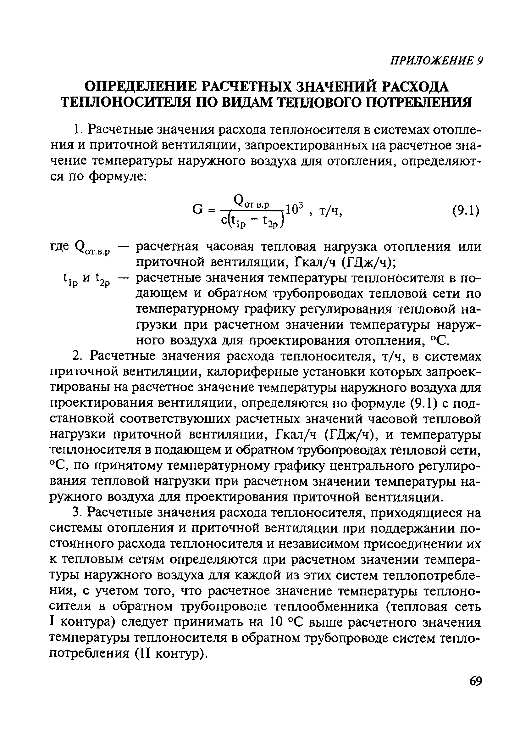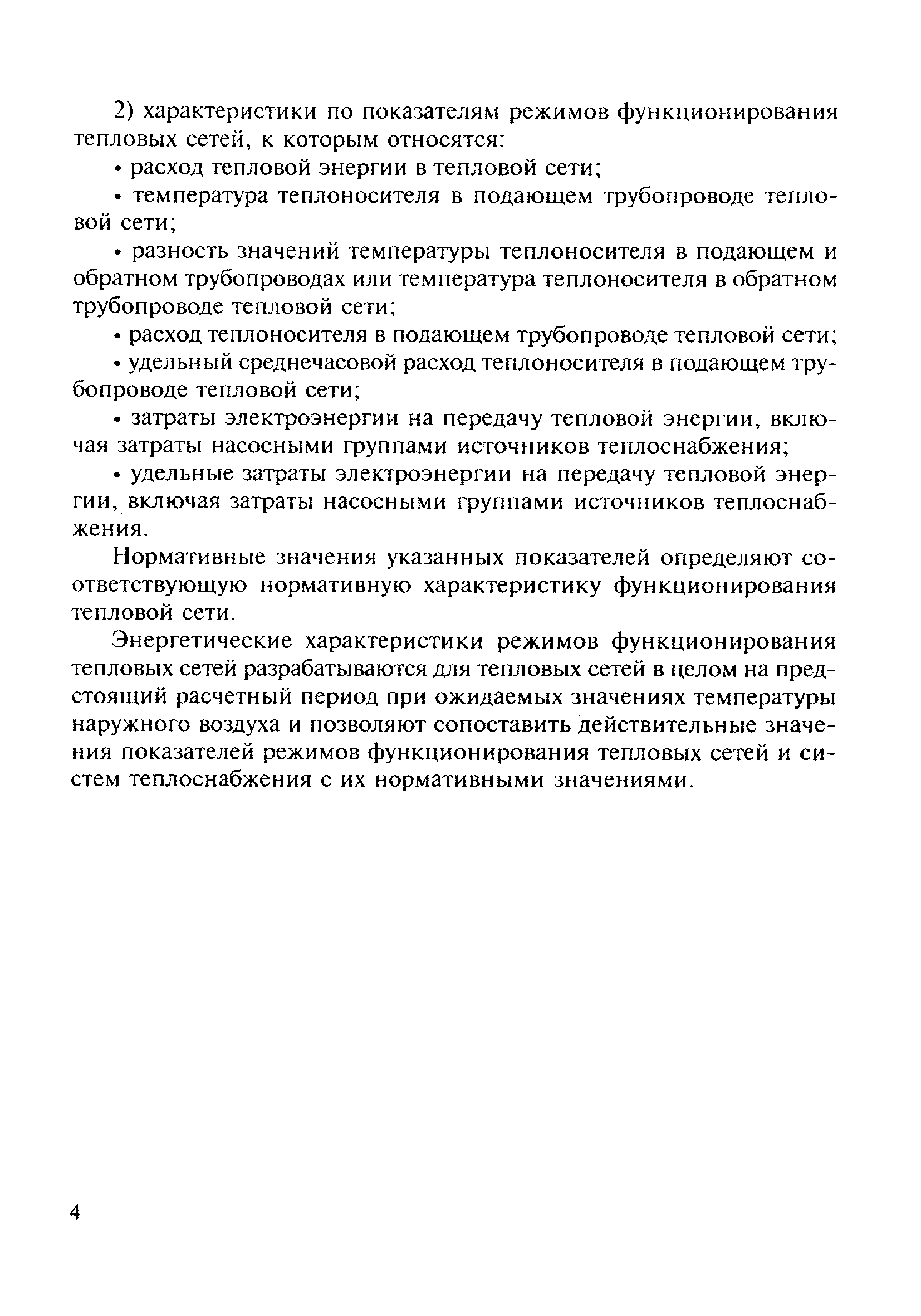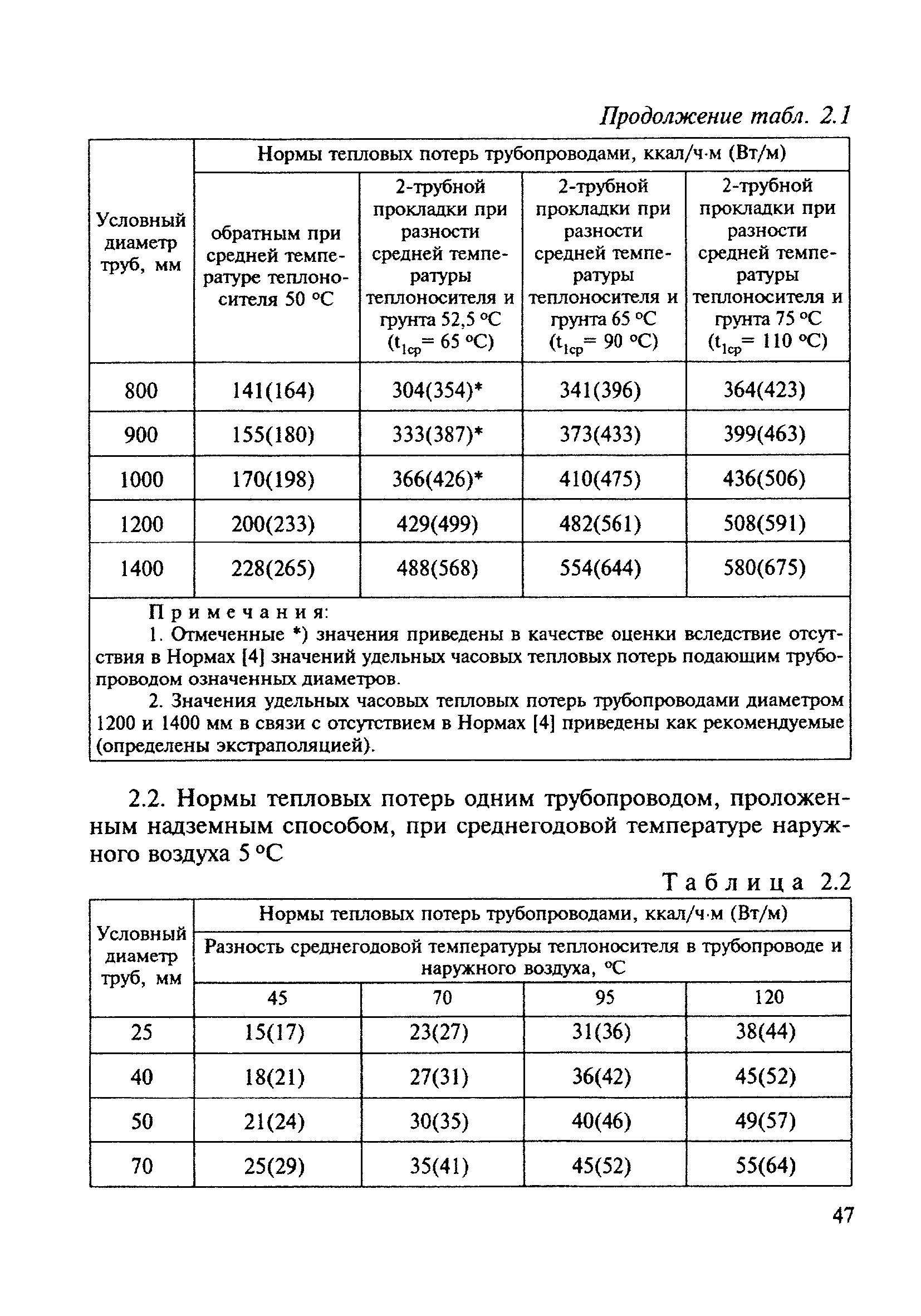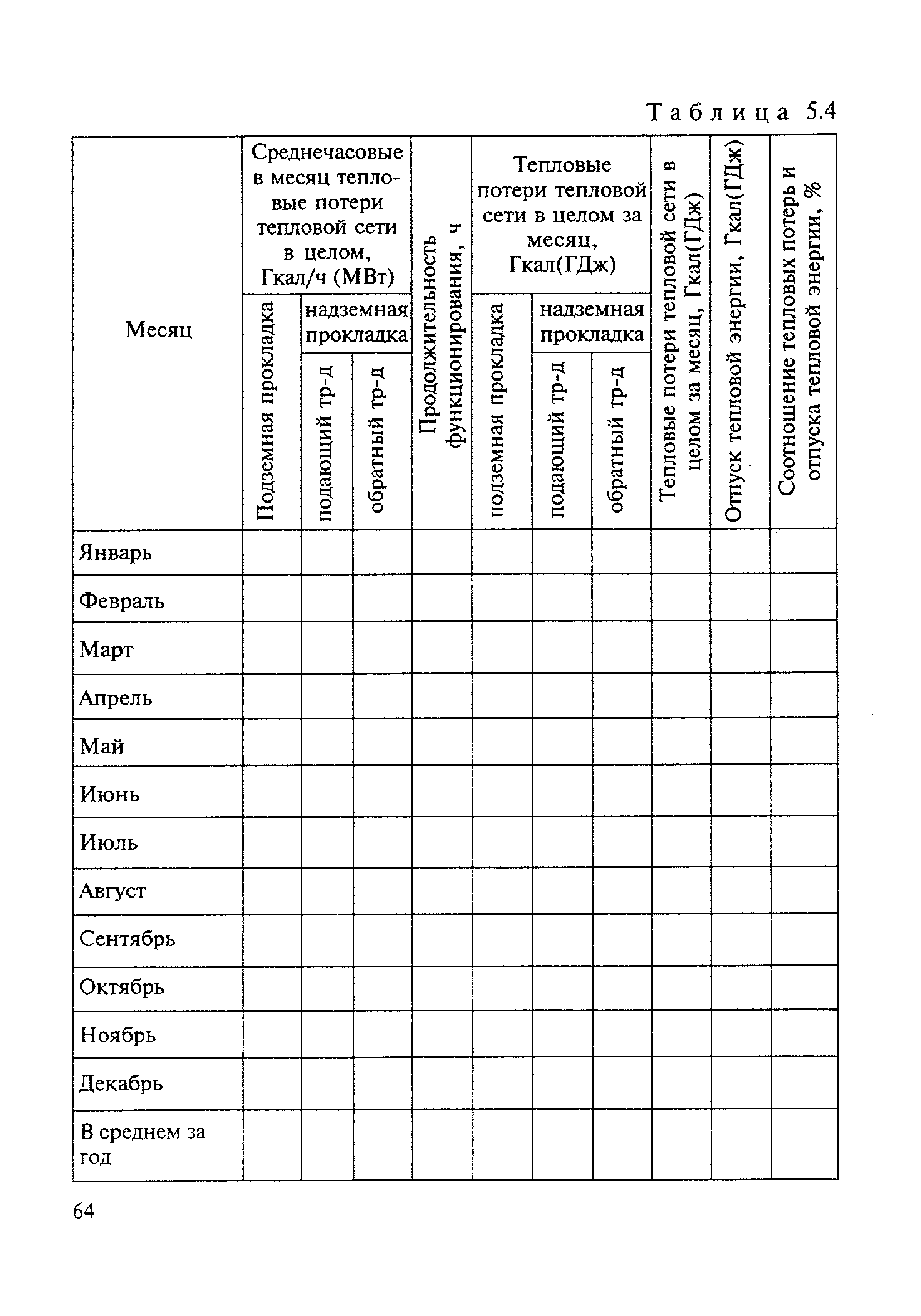 | Оглавление: | Введение 1 Определение нормативных значений потерь тепловой энергии и теплоносителя 1.1 Общие положения 1.2 Нормирование эксплуатационных потерь и затрат теплоносителя 1.3 Нормирование тепловых потерь, обусловленных потерями теплоносителя 1.4 Нормирование тепловых потерь через изоляционные конструкции трубопроводов 2 Определение нормативных значений показателей режимов функционирования тепловых сетей 2.1 Общие положения 2.2 Определение нормативных значений расхода тепловой энергии 2.3 Определение нормативных значений температуры теплоносителя в подающих и обратных трубопроводах тепловых сетей 2.4 Определение нормативных значений расхода теплоносителя в тепловых сетях 2.5 Определение нормативных значений удельного расхода теплоносителя в подающих трубопроводах тепловых сетей 2.6 Определение нормативных значений абсолютных и удельных затрат электроэнергии на передачу тепловой энергии 2.7 Периодичность пересмотра нормативных значений показателей режимов функционирования тепловых сетей Приложения: 1 Перечень нормативно-технических документов, на которые имеются ссылки в тексте Методики 2 Нормы тепловых потерь (плотности теплового потока от трубопроводов) водяных тепловых сетей 3 Методика расчета удельных часовых тепловых потерь для среднегодовых условий функционирования тепловых сетей 4 Поправки к нормируемым потерям тепловой энергии трубопроводами водяных тепловых сетей через изоляционные конструкции 5 Формы для исходной информации и расчета тепловых потерь 6 Удельный объем труб для определения объема трубопроводов тепловых сетей 7 Удельный объем систем теплопотребления 8 Формы для расчета потерь теплоносителя 9 Определение расчетных значений расхода теплоносителя по видам теплового потребления 10 Определение нормативных значений тепловых потерь трубопроводами тепловых сетей для характерных значений температуры наружного воздуха |