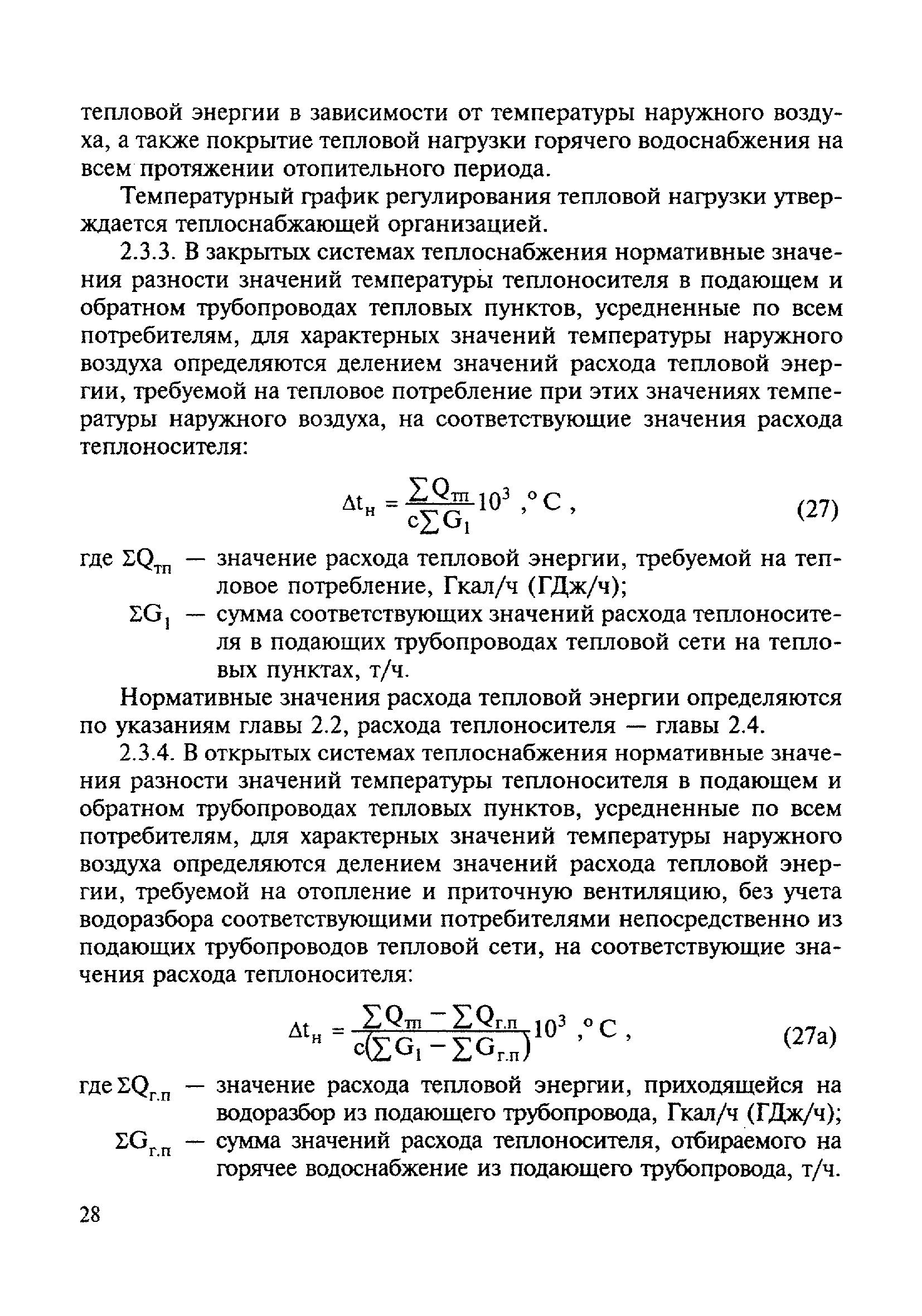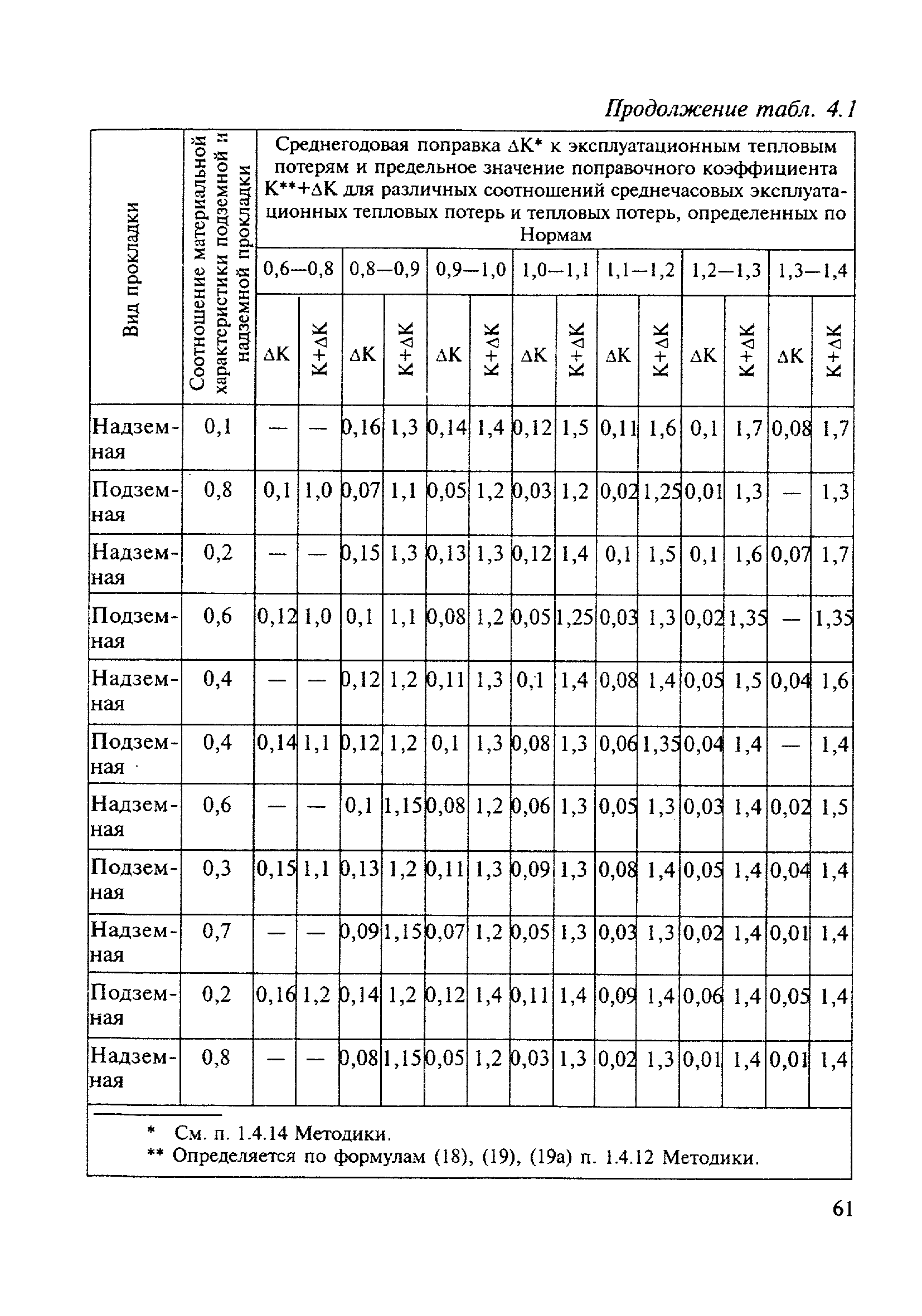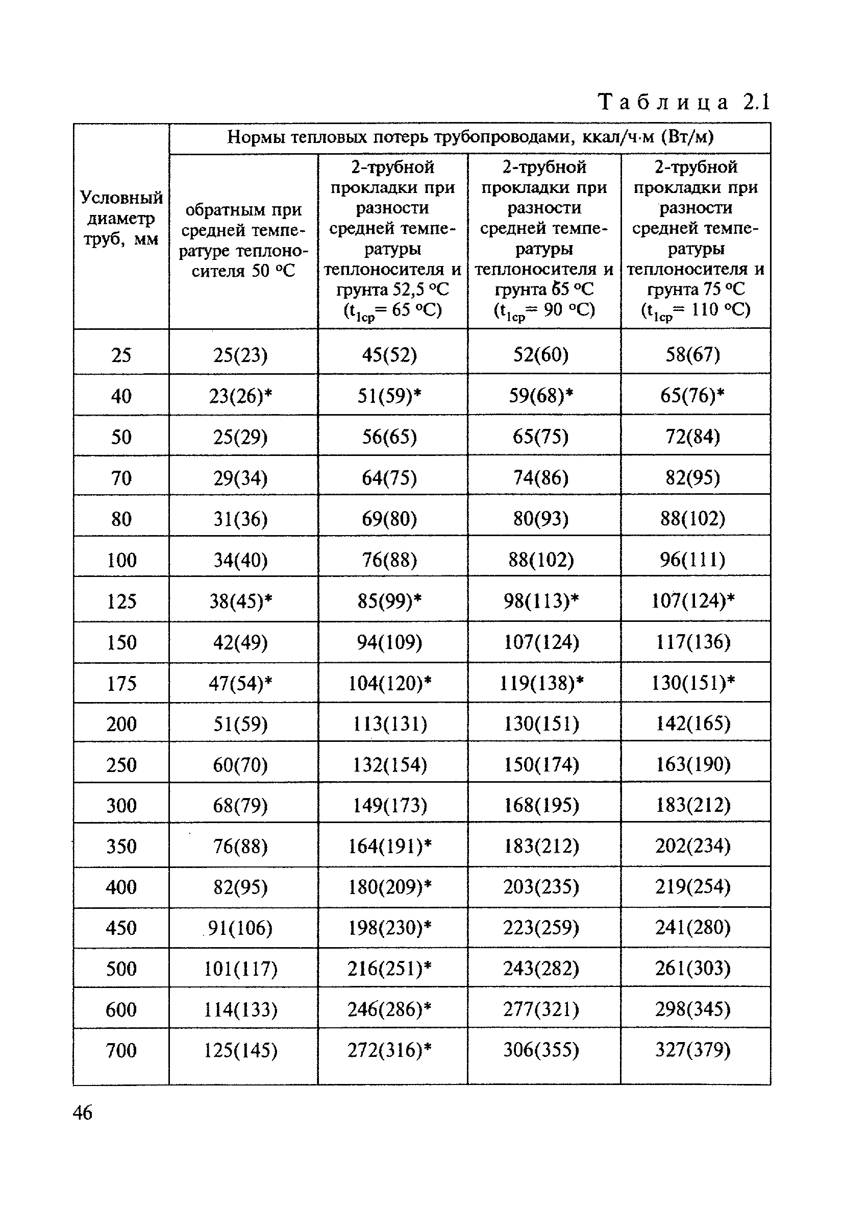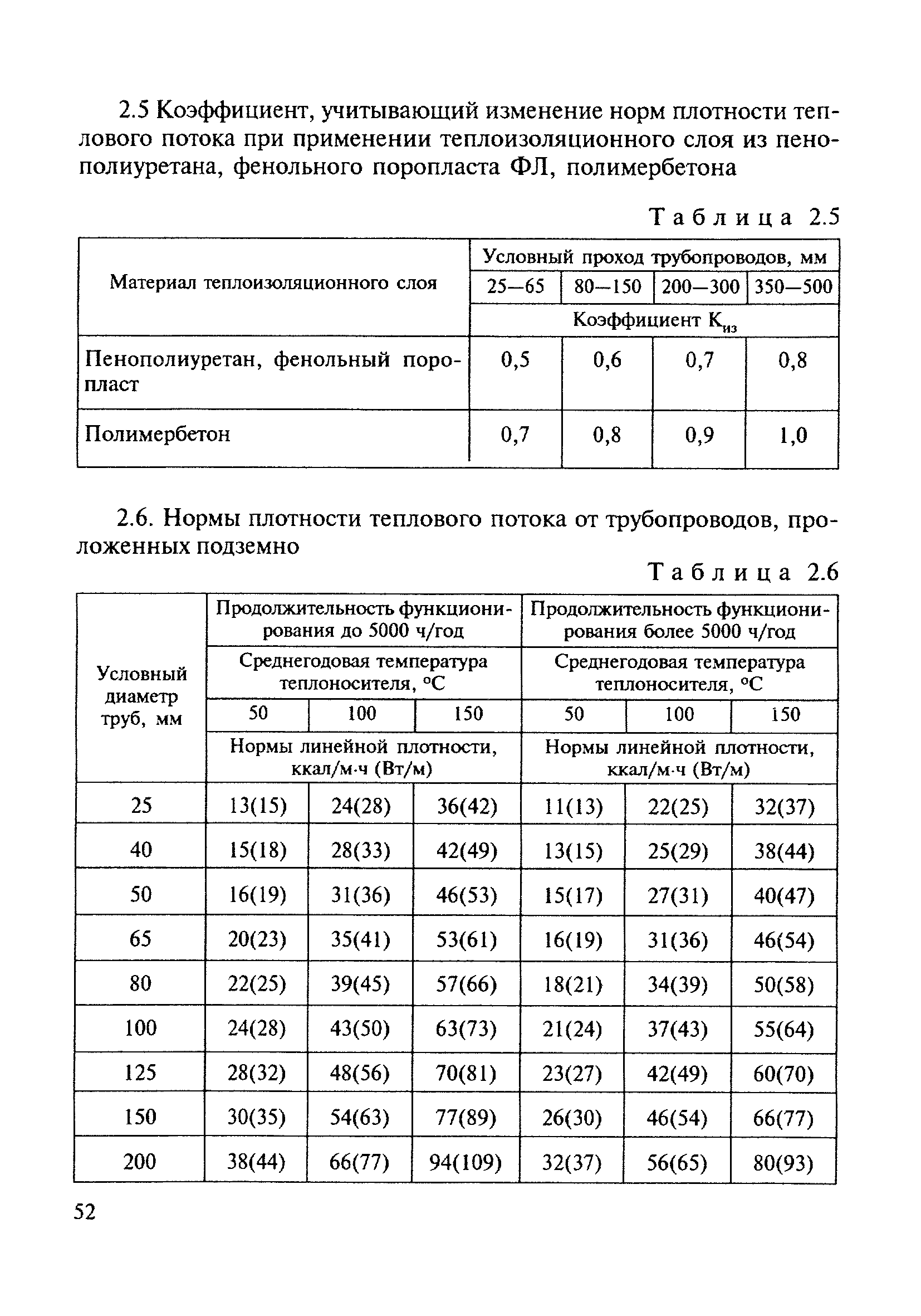 | Оглавление: | Введение 1 Определение нормативных значений потерь тепловой энергии и теплоносителя 1.1 Общие положения 1.2 Нормирование эксплуатационных потерь и затрат теплоносителя 1.3 Нормирование тепловых потерь, обусловленных потерями теплоносителя 1.4 Нормирование тепловых потерь через изоляционные конструкции трубопроводов 2 Определение нормативных значений показателей режимов функционирования тепловых сетей 2.1 Общие положения 2.2 Определение нормативных значений расхода тепловой энергии 2.3 Определение нормативных значений температуры теплоносителя в подающих и обратных трубопроводах тепловых сетей 2.4 Определение нормативных значений расхода теплоносителя в тепловых сетях 2.5 Определение нормативных значений удельного расхода теплоносителя в подающих трубопроводах тепловых сетей 2.6 Определение нормативных значений абсолютных и удельных затрат электроэнергии на передачу тепловой энергии 2.7 Периодичность пересмотра нормативных значений показателей режимов функционирования тепловых сетей Приложения: 1 Перечень нормативно-технических документов, на которые имеются ссылки в тексте Методики 2 Нормы тепловых потерь (плотности теплового потока от трубопроводов) водяных тепловых сетей 3 Методика расчета удельных часовых тепловых потерь для среднегодовых условий функционирования тепловых сетей 4 Поправки к нормируемым потерям тепловой энергии трубопроводами водяных тепловых сетей через изоляционные конструкции 5 Формы для исходной информации и расчета тепловых потерь 6 Удельный объем труб для определения объема трубопроводов тепловых сетей 7 Удельный объем систем теплопотребления 8 Формы для расчета потерь теплоносителя 9 Определение расчетных значений расхода теплоносителя по видам теплового потребления 10 Определение нормативных значений тепловых потерь трубопроводами тепловых сетей для характерных значений температуры наружного воздуха |
