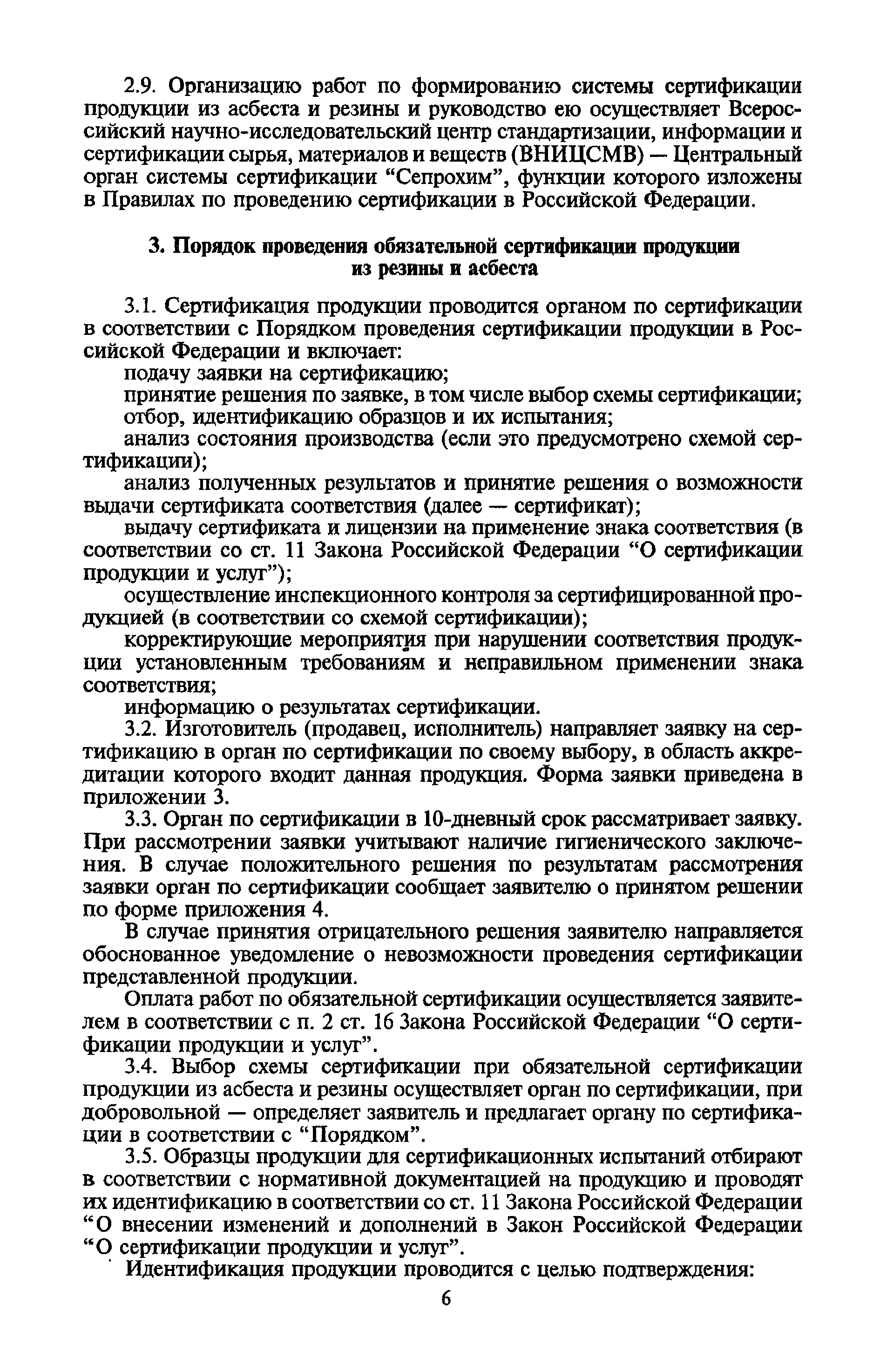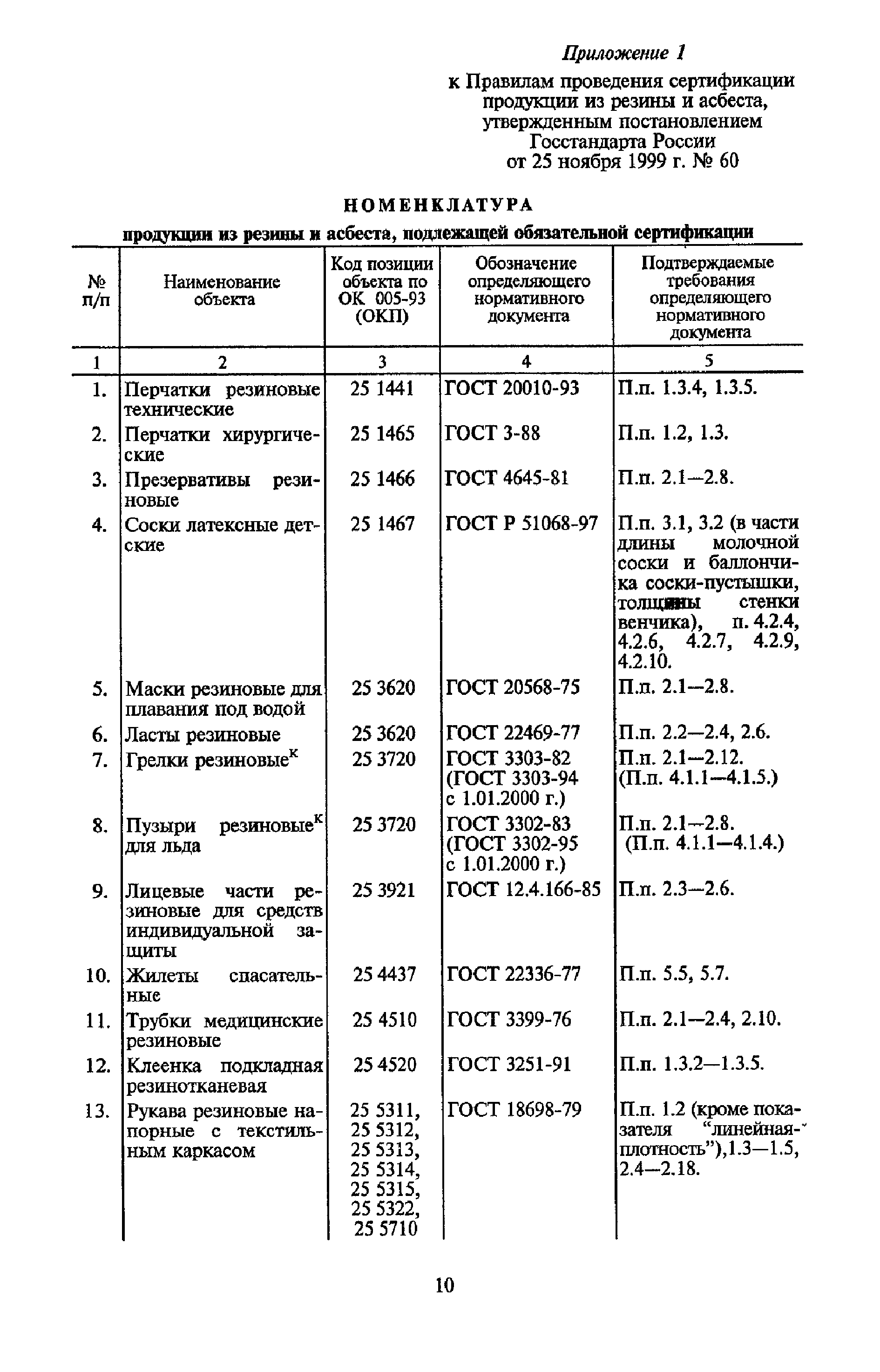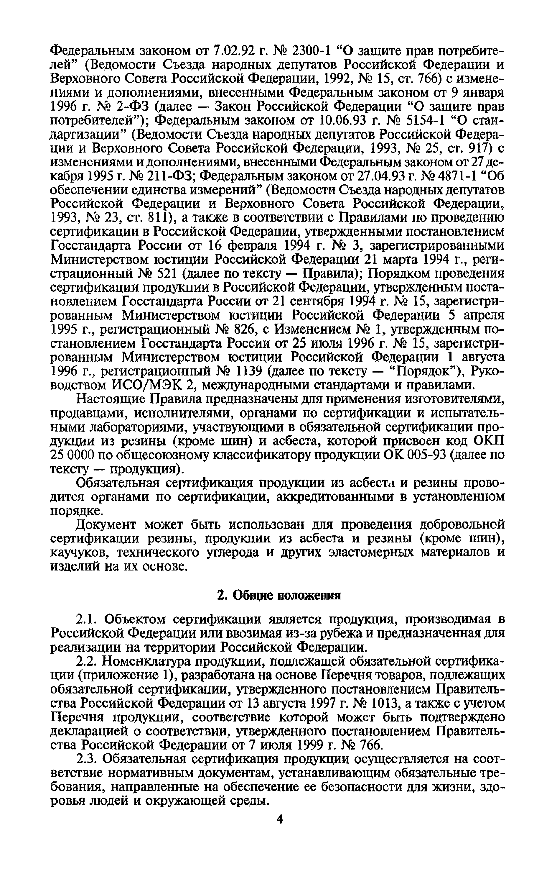 | Оглавление: | 1. Область применения 2. Общие положения 3. Порядок проведения обязательной сертификации продукции из резины и асбеста 4. Рассмотрение апелляций Приложение 1. Номенклатура продукции из резины и асбеста, подлежащей обязательной сертификации Приложение 2. Схемы сертификации Приложение 3. Заявка на проведение сертификации продукции в Системе сертификации ГОСТ Р Приложение 4. Решение Органа по сертификации по заявке на проведение сертификации Приложение 5. Акт отбора образцов для испытания продукции по показателям безопасности Приложение 6. Протокол испытаний при проведении сертификации продукции из резины и асбеста |
