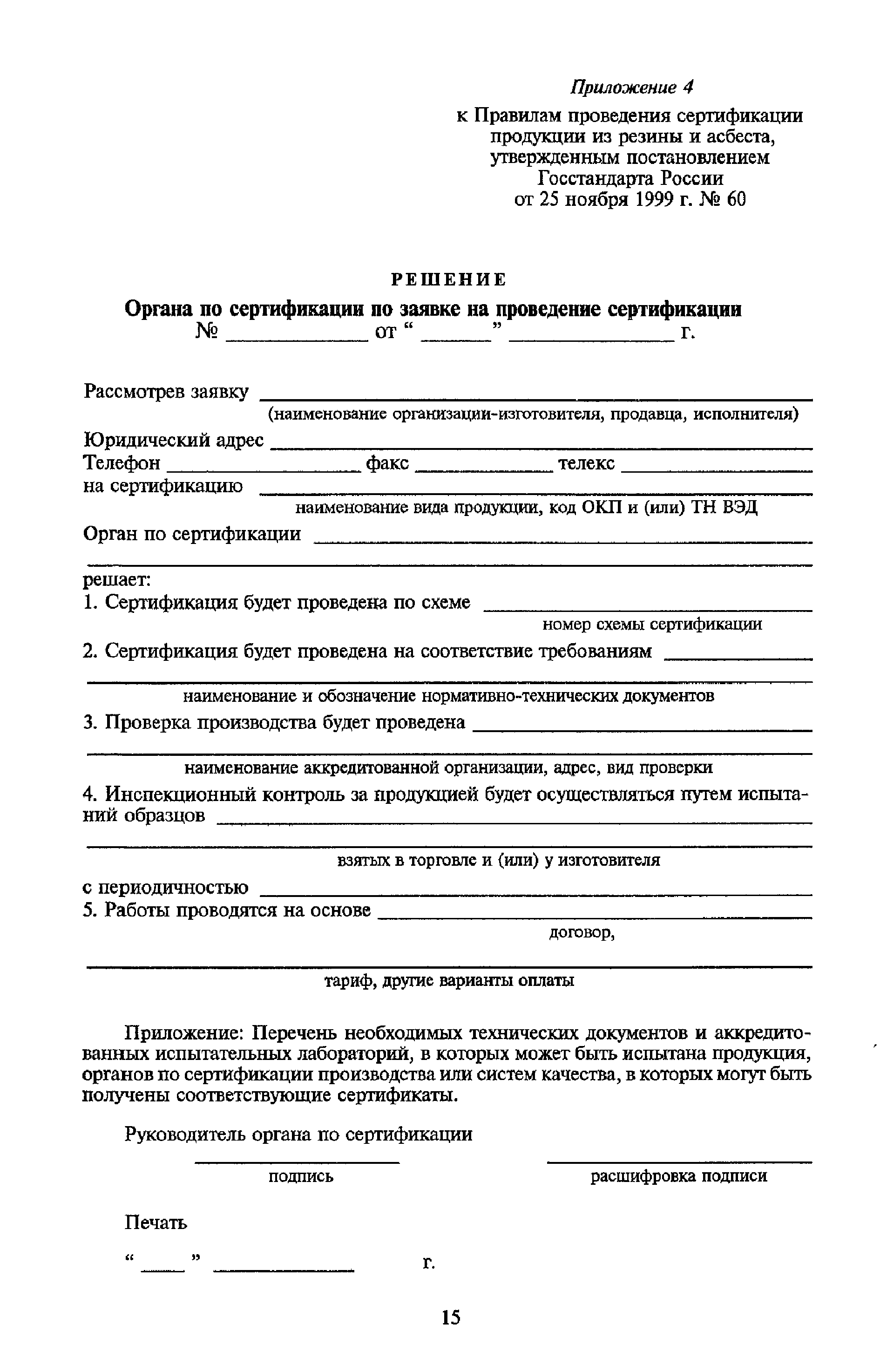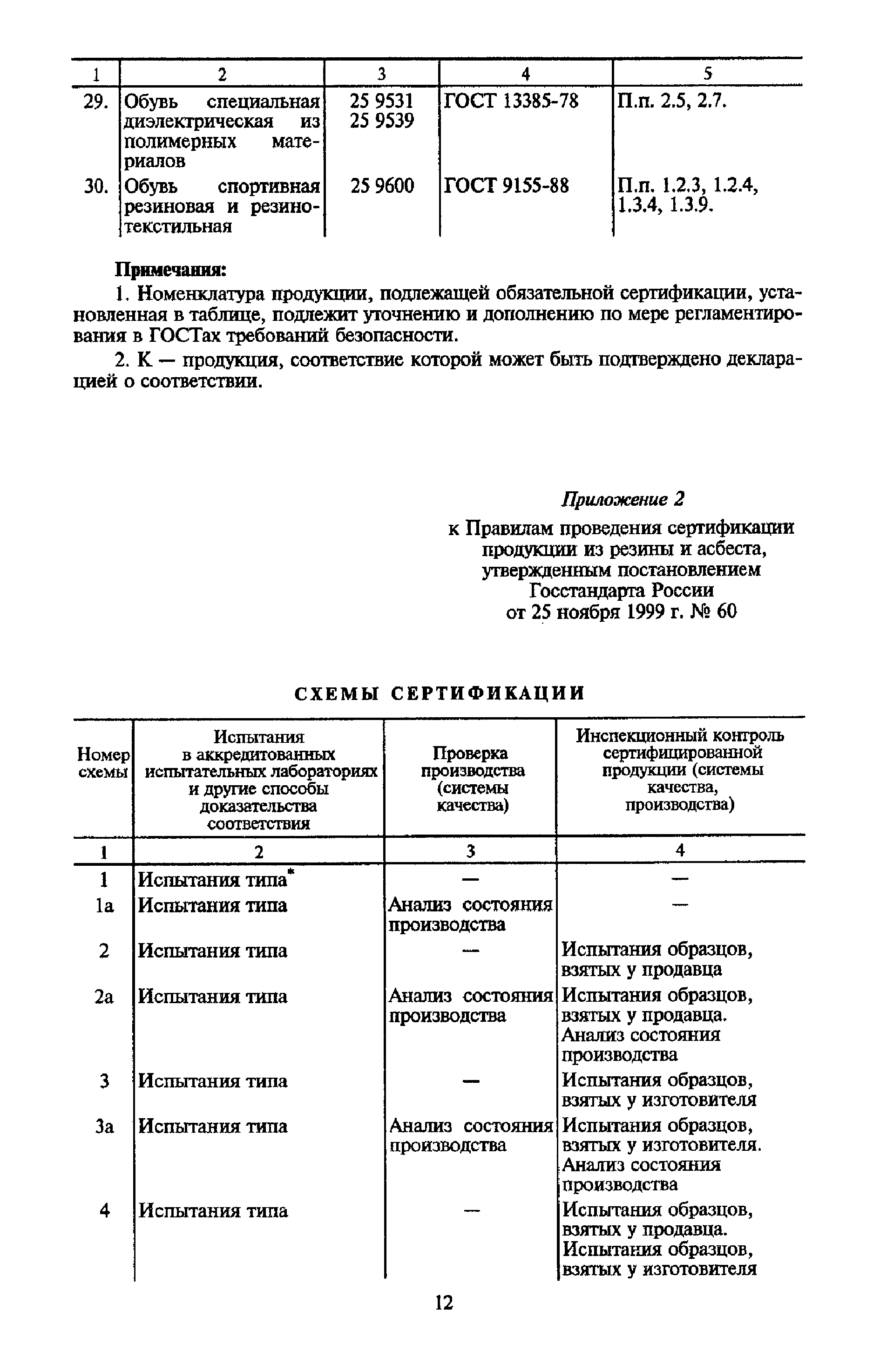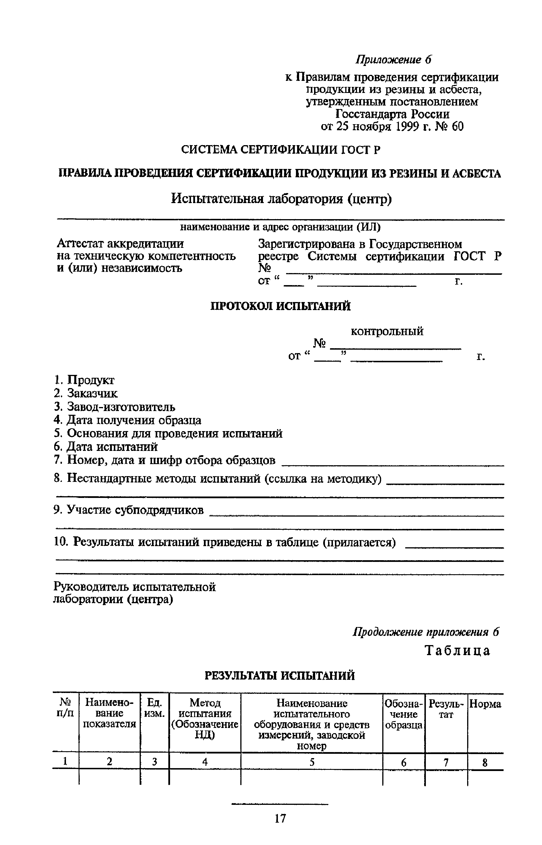 | Оглавление: | 1. Область применения 2. Общие положения 3. Порядок проведения обязательной сертификации продукции из резины и асбеста 4. Рассмотрение апелляций Приложение 1. Номенклатура продукции из резины и асбеста, подлежащей обязательной сертификации Приложение 2. Схемы сертификации Приложение 3. Заявка на проведение сертификации продукции в Системе сертификации ГОСТ Р Приложение 4. Решение Органа по сертификации по заявке на проведение сертификации Приложение 5. Акт отбора образцов для испытания продукции по показателям безопасности Приложение 6. Протокол испытаний при проведении сертификации продукции из резины и асбеста |