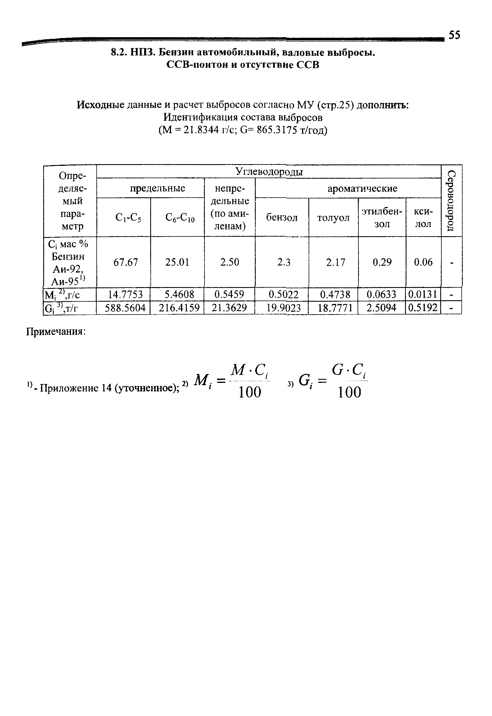 | Оглавление: | Введение 1 Ссылки на нормативные документы 2 Основные обозначения 3 Термины и определения 4 Общие положения 5 Выбросы загрязняющих веществ в атмосферу из резервуаров перерабатывающих, нефтедобывающих предприятий и магистральных нефтепроводов 5.1 Исходные данные для расчета выбросов 5.1.1 Данные предприятия 5.1.2 Инструментальные измерения 5.1.3 Расчет давления насыщенных паров индивидуальных жидкостей 5.1.4 Расчет давления газов над их водными растворами 5.1.5 Определение молекулярной массы паров жидкостей 5.1.6 Определение опытных значений коэффициентов Kt 5.1.7 Определение опытных значений коэффициентов Kp 5.1.8 Определение значений коэффициентов Кв 5.1.9 Определение опытных значений коэффициентов Коб 5.2 Выбросы паров нефтей и бензинов 5.3 Выбросы паров индивидуальных веществ 5.4 Выбросы паров многокомпонентных жидких смесей известного состава 5.5 Выбросы газов из водных растворов 5.6 Выбросы паров нефтепродуктов (кроме бензинов) 6 Выбросы паров нефтепродуктов в атмосферу из резервуаров нефтебаз, ТЭЦ, котельных, складов ГСМ 6.1 Исходные данные для расчета выбросов 6.2 Выбросы паров нефтепродуктов 7 Выбросы паров нефтепродуктов в атмосферу из резервуаров автозаправочных станций 7.1 Исходные данные для расчета выбросов 7.2 Выбросы паров нефтепродуктов 8 Примеры расчета выбросов загрязняющих веществ в атмосферу 8.1 НПЗ. бензин-катализат. Валовые выбросы 8.2 НПЗ. бензин автомобильный. Валовые выбросы. ССВ - понтон и отсутствие ССВ 8.3 НПЗ бензин автомобильный. Идентификация выбросов 8.4 НПЗ керосин технический 8.5 Растворитель № 646. Выбросы компонентов 8.6 Нефтебаза. Бензин автомобильный. Валовые выбросы 8.7 АЗС. Бензин автомобильный. Валовые выбросы 8.8 ТЭЦ. Мазут топочный (резервуар с нижним боковым подогревом) 8.9 ТЭЦ. Мазут топочный (резервуар без обогрева) Используемая литература Приложение 1 Предельно допустимые концентрации (ПДК) и ориентировочные безопасные уровни воздействия (ОБУВ) загрязняющих веществ в атмосферном воздухе населенных мест Приложение 2 Физико-химические свойства некоторых газов и жидкостей Приложение 3 Константы уравнения Антуана некоторых веществ Приложение 4 Значения постоянной Кг для водных растворов некоторых газов (в таблице даны значения Кг х1/1000000000 в мм рт.ст.) Приложение 5 Значения молекулярной массы паров (м) нефтей и бензинов Приложение 6 Атомные массы некоторых элементов Приложение 7 Значения опытных коэффициентов Кt Приложение 8 Значения опытных коэффициентов Кр Приложение 9 Значения коэффициентов Кв Приложение 10 Значения опытных коэффициентов Коб Приложение 11 Компонентный состав растворителей, лаков, красок и т.д. (Сi % массовый) Приложение 12 Значения концентраций паров нефтепродуктов в резервуаре с„ удельных выбросов У2, У3 и опытных коэффициентов Кнп Приложение 13 Количество выделяющихся паров бензинов автомобильных при хранении в одном резервуаре Gхр, т/год Приложение 14 Концентрация загрязняющих веществ (% масс) в парах различных нефтепродуктов [12] Приложение 15 Концентрации паров нефтепродуктов (С, г/м?) в выбросах паровоздушной смеси при заполнении резервуаров и баков автомашин Приложение 16 Давление насыщенных паров углеводородов, Па 9 Дополнение к «Методическим указаниям по определению выбросов загрязняющих веществ в атмосферу из резервуаров» Введение 1 Применение критериев качества атмосфе