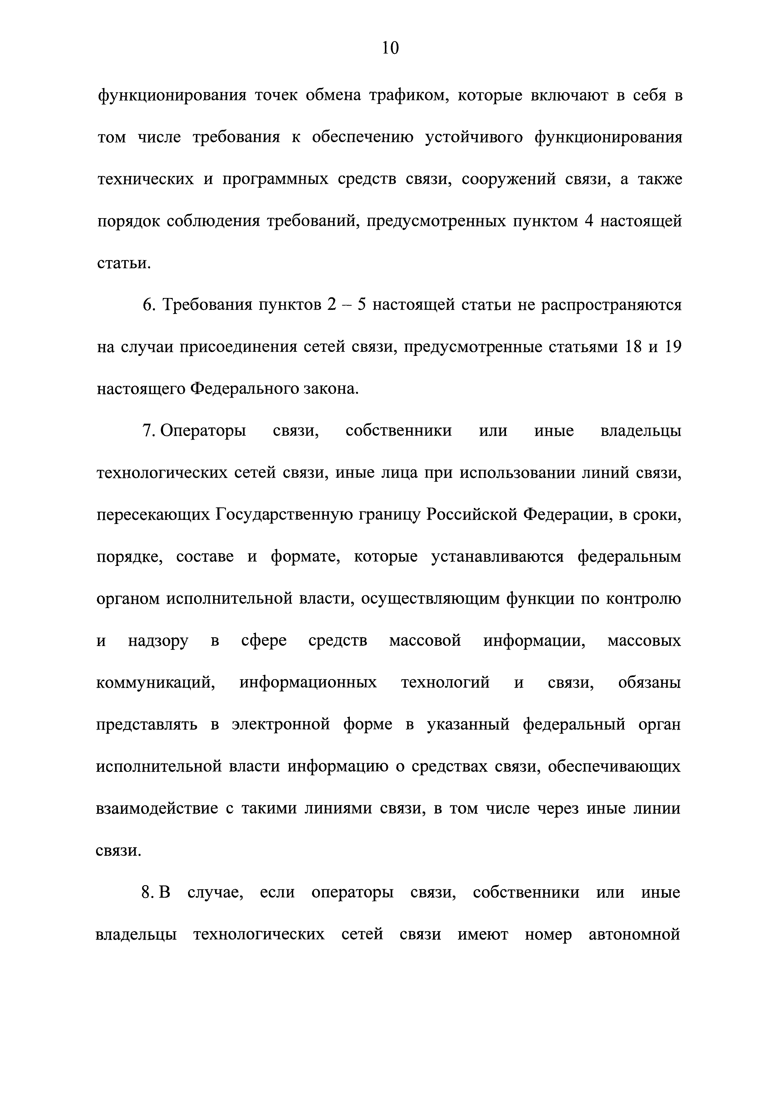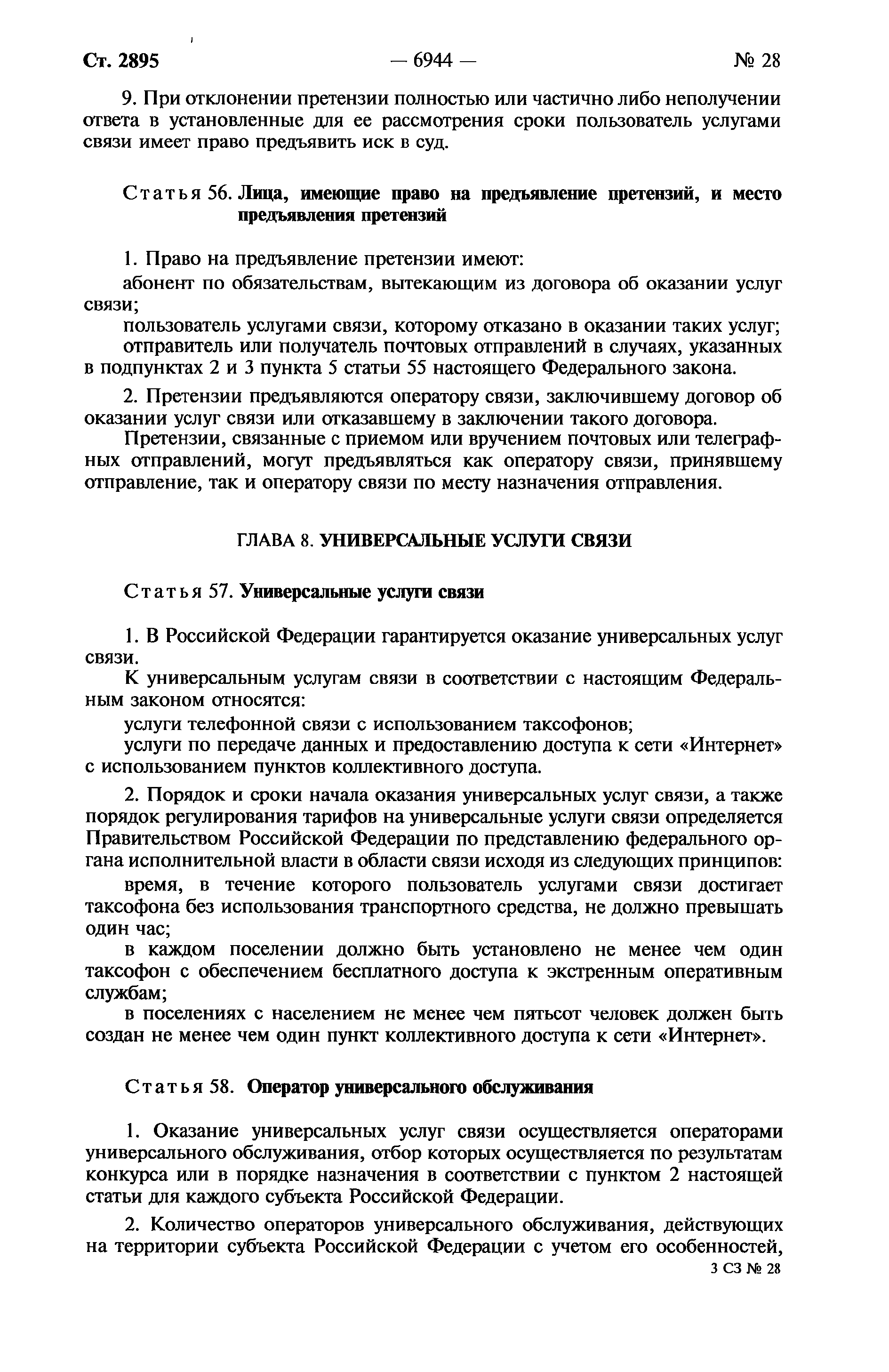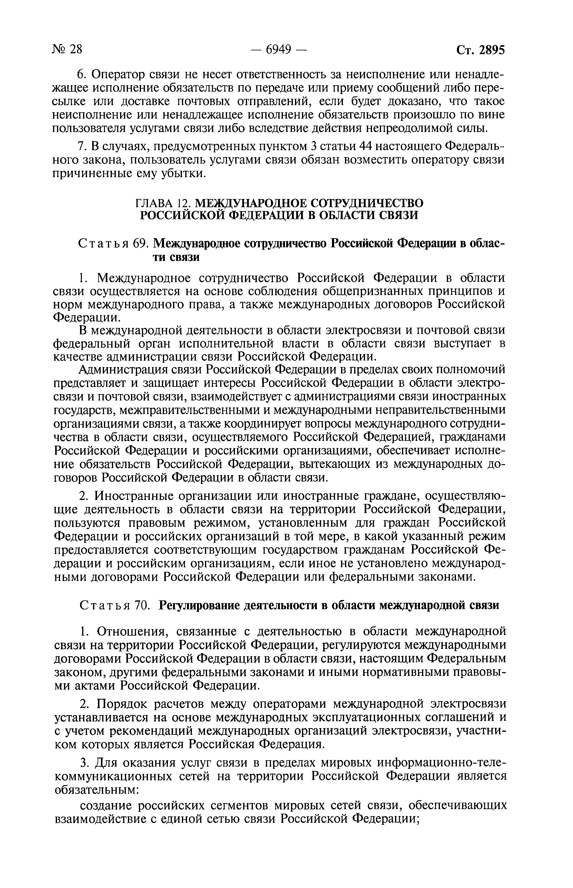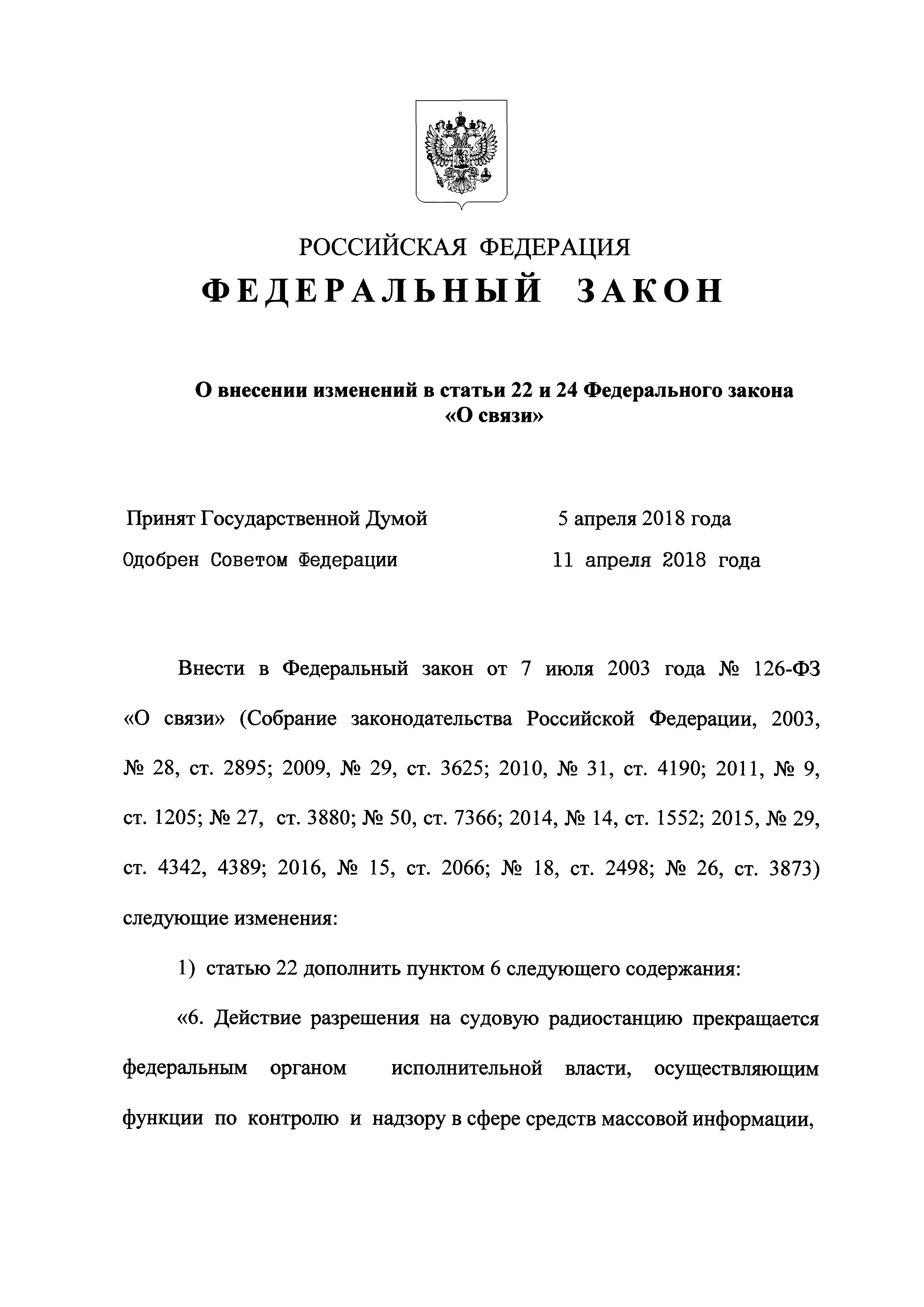 О связи| Обозначение: | Федеральный закон 126-ФЗ | | Обозначение англ: | Federal Law 126-ФЗ | | Статус: | действует | | Название рус.: | О связи | | Название англ.: | Communications | | Дата добавления в базу: | 01.09.2013 | | Дата актуализации: | 01.01.2021 | | Дата введения: | 01.01.2004 | | Область применения: | Федеральный закон устанавливает правовые основы деятельности в области связи на территории Российской Федерации и на находящихся под юрисдикцией Российской Федерации территориях, определяет полномочия органов государственной власти в области связи, а также права и обязанности лиц, участвующих в указанной деятельности или пользующихся услугами связи | | Оглавление: | Глава 1. Общие положения Глава 2. Основы деятельности в области связи Глава 3. Сети связи Глава 4. Присоединение сетей электросвязи и их взаимодействие Глава 5. Государственное регулирование деятельности в области связи Глава 6. Лицензирование деятельности в области оказания услуг связи и оценка соответствия в области связи Глава 7. Услуги связи Глава 7.1. Обеспечение устойчивого, безопасного и целостного функционирования на территории Российской Федерации информационно-телекоммуникационной сети "Интернет" Глава 8. Универсальные услуги cвязи Глава 9. Защита прав пользователей услугами связи Глава 10. Управление сетями связи в отдельных случаях Глава 11. Ответственность за нарушение законодательства Российской Федерации в области связи Глава 12. Международное сотрудничество Российской Федерации в области связи Глава 13. Заключительные и переходные положения | | Утверждён: | 07.07.2003 Государственная Дума (126-ФЗ)