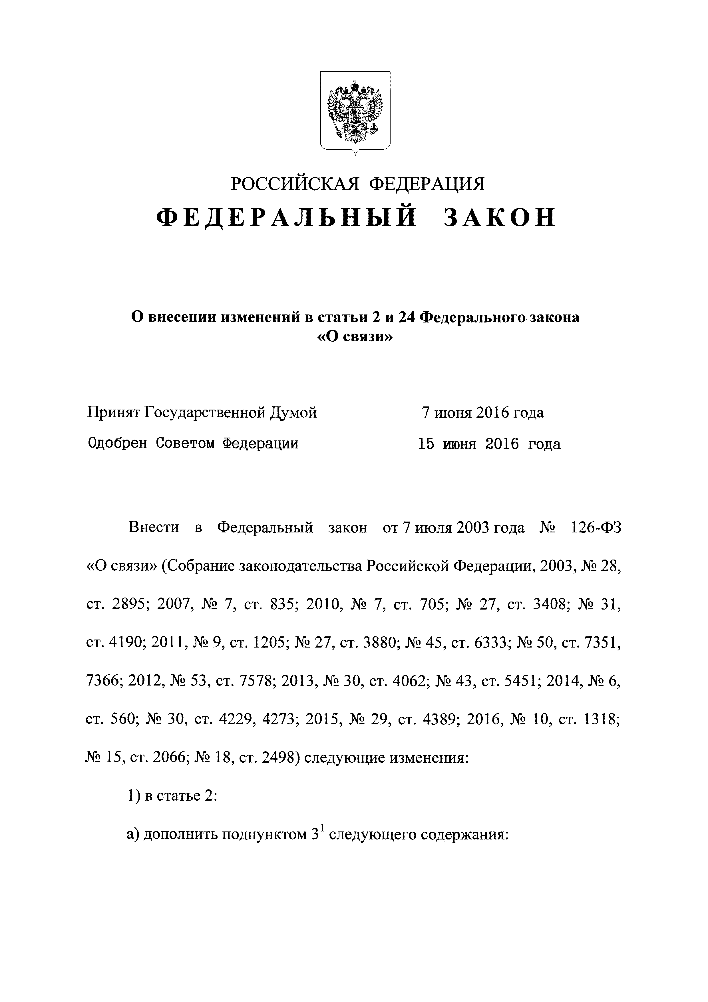 | | Заменяет собой: | - Федеральный закон № 15-ФЗ от 16.02.1995 г. «О связи»