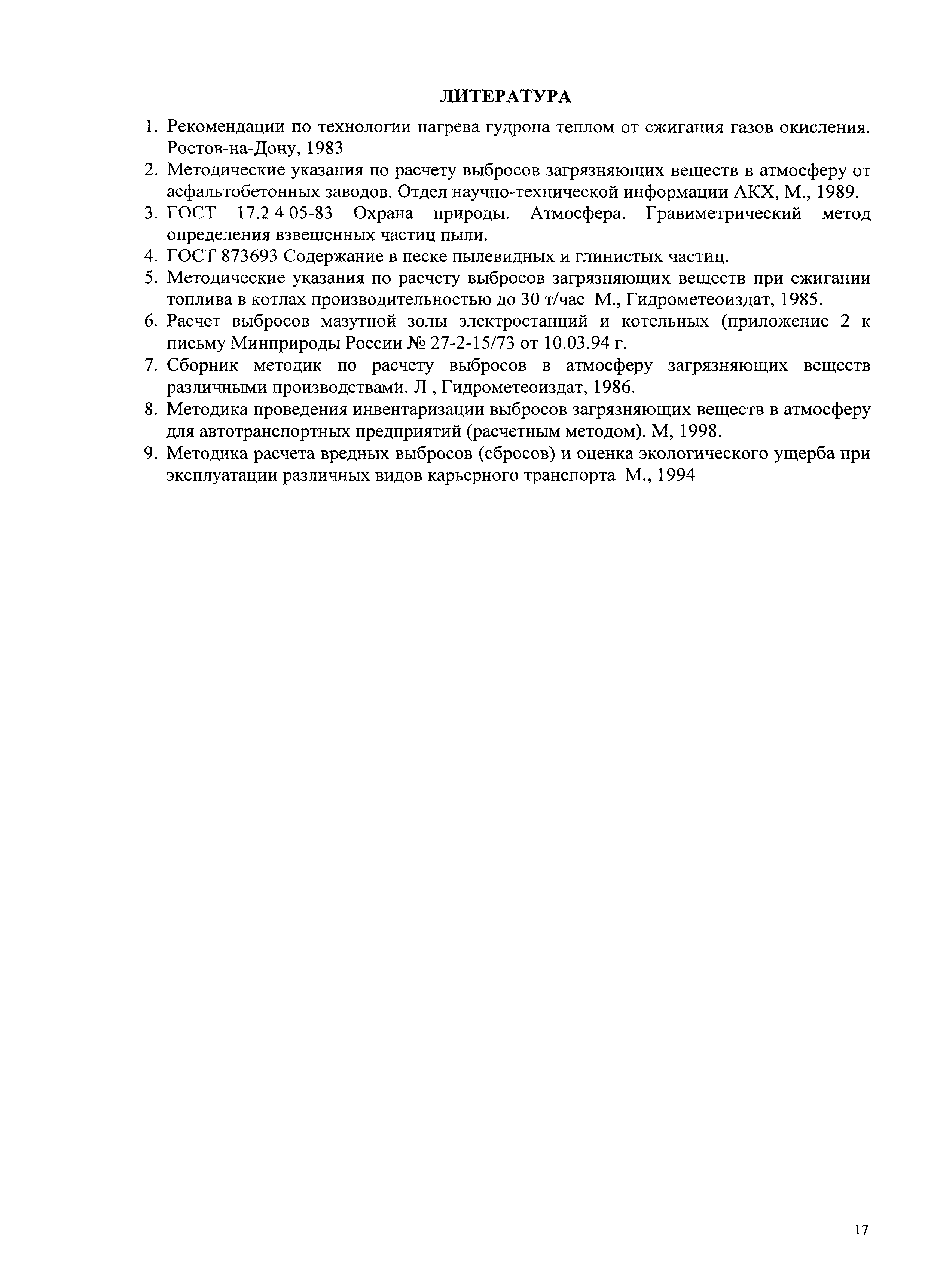 | Оглавление: | Введение 1 Общие положения 2 Источники выделения загрязняющих веществ на асфальтобетонных заводах 3 Расчет выбросов загрязняющих веществ 3.1 Расчет валовых выбросов пыли [2] 3.2 Расчет валовых выбросов твердых частиц при сжигании топлива 5 3.3 Расчет валовых выбросов ангидрида сернистого (серы диоксид) 51 3.4 Расчет валовых выбросов оксидов азота 5 3.5 Расчет валовых выбросов углерода азота 5 3.6 Расчет валовых выбросов мазутной золы 6 3.7 Расчет валовых выбросов углеводородов 3.8 Расчет валовых выбросов пыли на камнедробильно-сортировочных установках 7 3.9 Расчет валовых выбросов загрязняющих веществ на реакторных установках по приготовлению битума и в эмульсионных цехах 3.10 Расчет валовых выбросов загрязняющих веществ в цехах по приготовлению укрепленных грунтов 3.11 Расчет валовых выбросов загрязняющих веществ при сжигании топлива в котлоагрегатах котельной 3.12 Расчет валовых выбросов загрязняющих веществ от передвижных источников 3.13 Расчет валовых выбросов загрязняющих веществ в карьерах 3.13.1 Выбросы при выемочно-погрузочных работах 3.13.2 Выбросы загрязняющих веществ при буровых работах Литература |