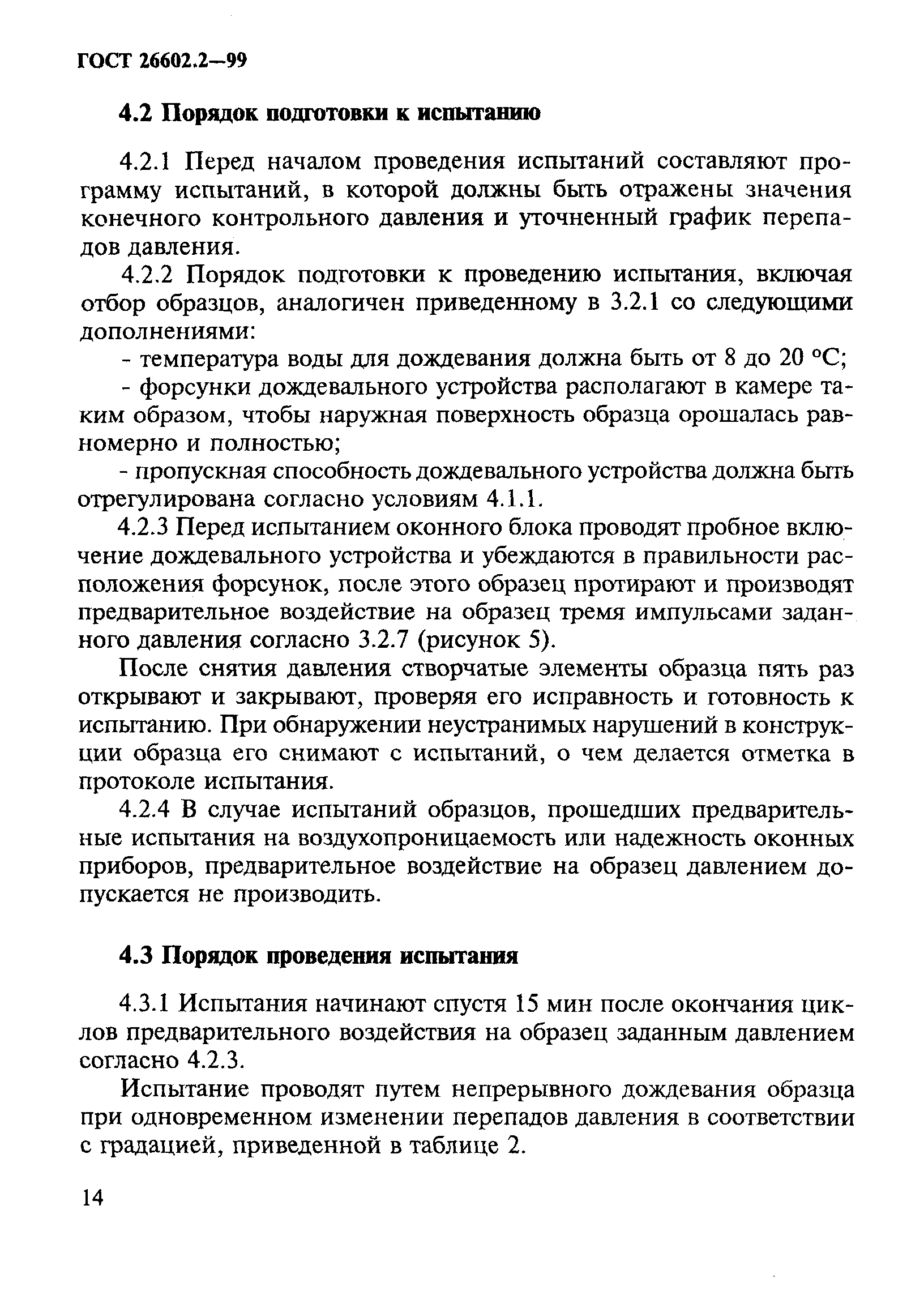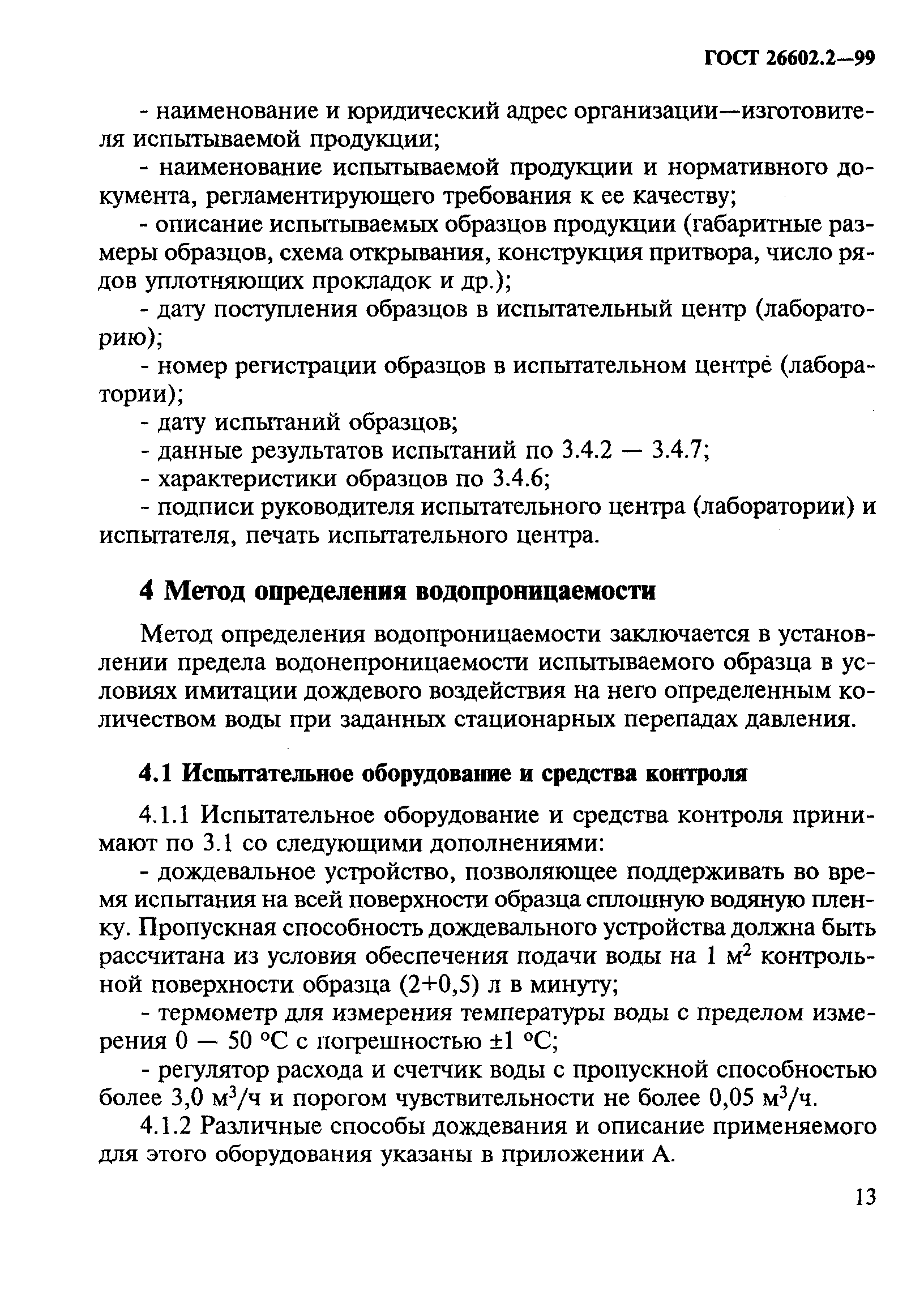 | Оглавление: | 1 Область применения 2 Термины, обозначения и определения 3 Метод определения воздухопроницаемости 3.1 Испытательное оборудование и средства контроля 3.2 Порядок подготовки к испытанию 3.3 Порядок проведения испытания 3.4 Правила обработки и оформления результатов испытания 4 Метод определения водопроницаемости 4.1 Испытательное оборудование и средства контроля 4.2 Порядок подготовки к испытанию 4.3 Порядок проведения испытания 4.4 Правила обработки и оформления результатов испытания Приложение А Способы дождевания и описание применяемого оборудования Приложение Б Сведения о разработчиках стандарта |
