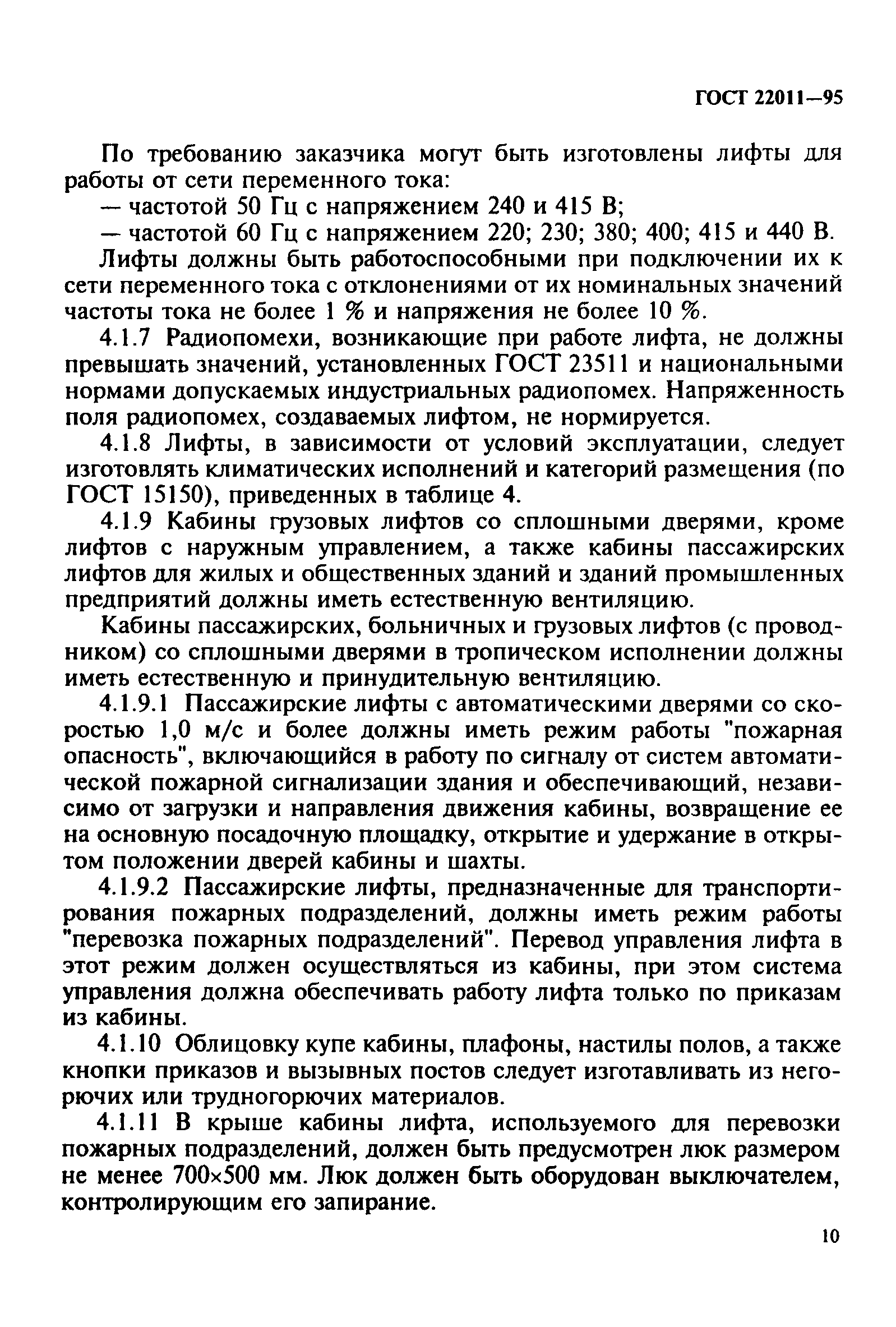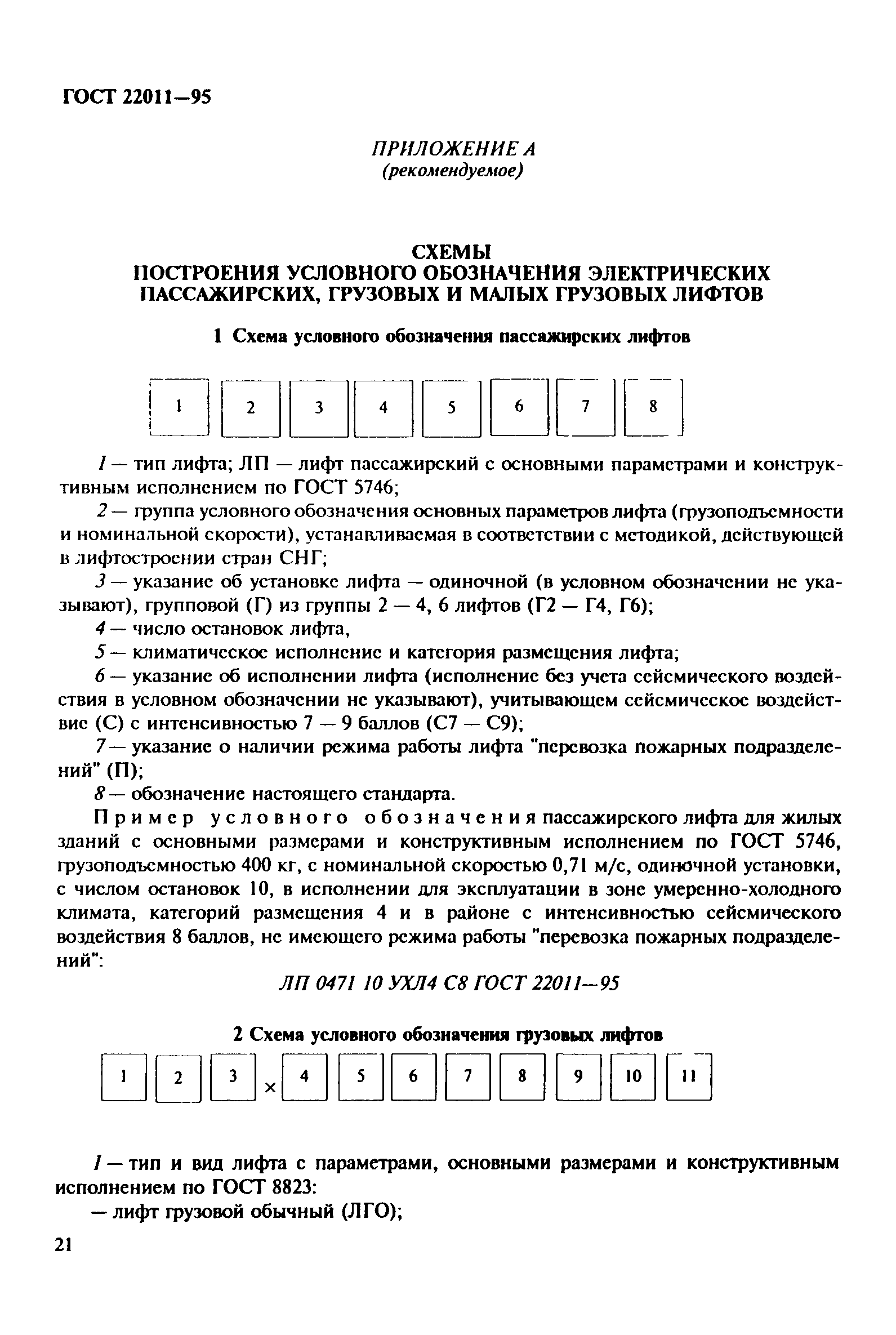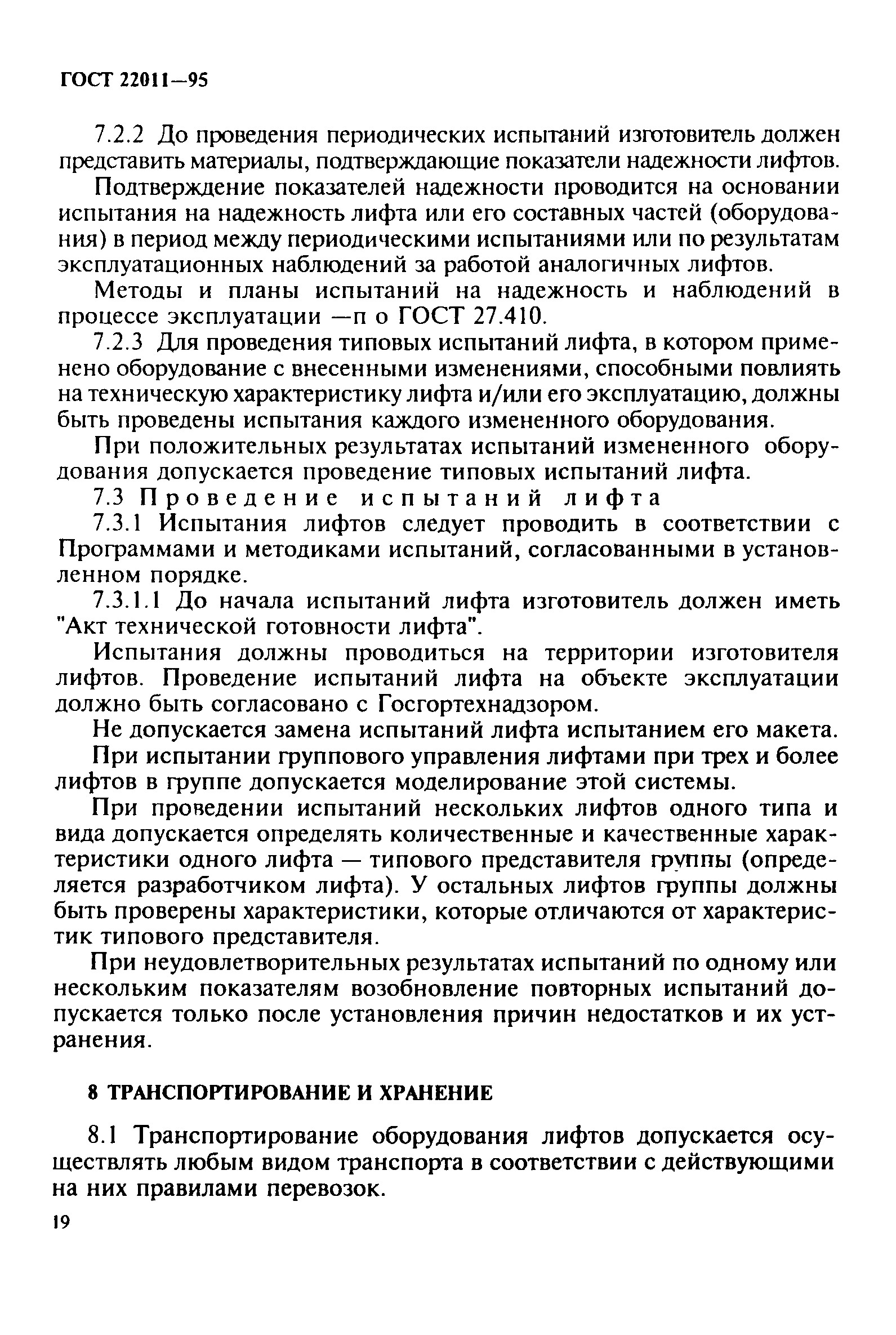 | | Заменяет собой: | | | Нормативные ссылки: |   СНиП 21-01-97* «Пожарная безопасность зданий и сооружений»  ГОСТ 3560-73 «Лента стальная упаковочная. Технические условия»  ГОСТ 15150-69 «Машины, приборы и другие технические изделия. Исполнения для различных климатических районов. Категории, условия эксплуатации, хранения и транспортирования в части воздействия климатических факторов внешней среды» ГОСТ 5746-83 «Лифты электрические пассажирские. Основные параметры и размеры»  ГОСТ 8823-85 «Лифты электрические грузовые. Основные параметры и размеры»  ГОСТ 8824-84 «Лифты электрические грузовые малые. Основные параметры и размеры» ГОСТ 28911-91 «Лифты и малые грузовые лифты. Устройства управления, сигнализации и дополнительные приспособления»  ГОСТ 9.401-91 «Единая система защиты от коррозии и старения. Покрытия лакокрасочные. Общие требования и методы ускоренных испытаний на стойкость к воздействию климатических факторов»  ГОСТ 12.4.026-76 «Система стандартов безопасности труда. Цвета сигнальные и знаки безопасности»  ГОСТ 22845-85 «Лифты электрические пассажирские и грузовые. Правила организации, производства и приемки монтажных работ»  ГОСТ 24297-87 «Входной контроль продукции. Основные положения»  ГОСТ 9.032-74 «Единая система защиты от коррозии и старения. Покрытия лакокрасочные. Группы, технические требования и обозначения»  ГОСТ 9.301-86 «Единая система защиты от коррозии и старения. Покрытия металлические и неметаллические неорганические. Общие требования»  ГОСТ 14192-96 «Маркировка грузов»  ГОСТ 10354-82 «Пленка полиэтиленовая. Технические условия»  ГОСТ 515-77 «Бумага упаковочная битумированная и дегтевая. Технические условия»  ГОСТ 8828-89 «Бумага-основа и бумага двухслойная водонепроницаемая упаковочная. Технические условия»  ГОСТ 3282-74 «Проволока стальная низкоуглеродистая общего назначения. Технические условия»  ГОСТ 8.002-86 «Государственная система обеспечения единства измерений. Государственный надзор и ведомственный контроль за средствами измерений. Основные положения»  ГОСТ 23170-78 «Упаковка для изделий машиностроения. Общие требования»  ГОСТ 9.014-78 «Единая система защиты от коррозии и старения. Временная противокоррозионная защита изделий. Общие требования»  ГОСТ 15846-79 «Продукция, отправляемая в районы Крайнего Севера и труднодоступные районы. Упаковка, маркировка, транспортирование и хранение»  ГОСТ 18242-72 «Статистический приемочный контроль по альтернативному признаку. Планы контроля»  ГОСТ 24634-81 «Ящики деревянные для продукции, поставляемой для экспорта. Общие технические условия»  ГОСТ 12969-67 «Таблички для машин и приборов. Технические требования»  ГОСТ 12970-67 «Таблички круглые для машин и приборов. Размеры»  ГОСТ 12971-67 «Таблички прямоугольные для машин и приборов. Размеры»  ГОСТ 8.326-89 «Государственная система обеспечения единства измерений. Метрологическая аттестация средств измерений»  ГОСТ 6465-76 «Эмали ПФ-115. Технические условия» ГОСТ 18690-82 «Кабели, провода, шнуры и кабельная арматура. Маркировка, упаковка, транспортирование и хранение» ГОСТ 23216-78 «Изделия электротехнические. Хранение, транспортирование, временная противокоррозионная защита, упаковка. Общие требования и методы испытаний» ГОСТ 23511-79 «Радиопомехи индустриальные от электротехнических устройств, эксплуатируемых в жилых домах или подключаемых к их электрическим сетям. Нормы и методы и