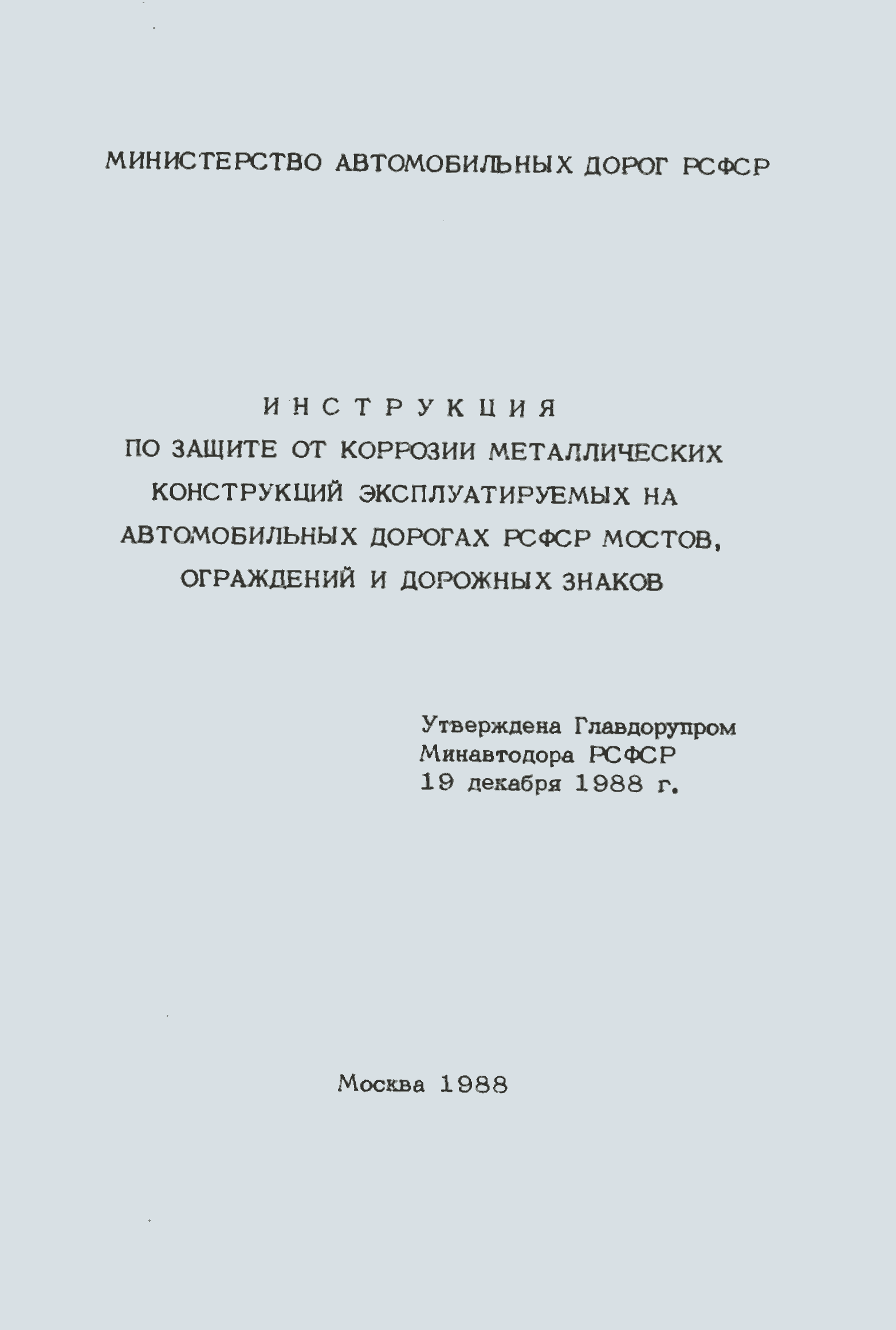 Скачать Инструкция по защите металлических конструкций эксплуатируемых на автомобильных дорогах РСФСР мостов, путепроводов, ограждений и дорожных знаковДата актуализации: 01.01.2021