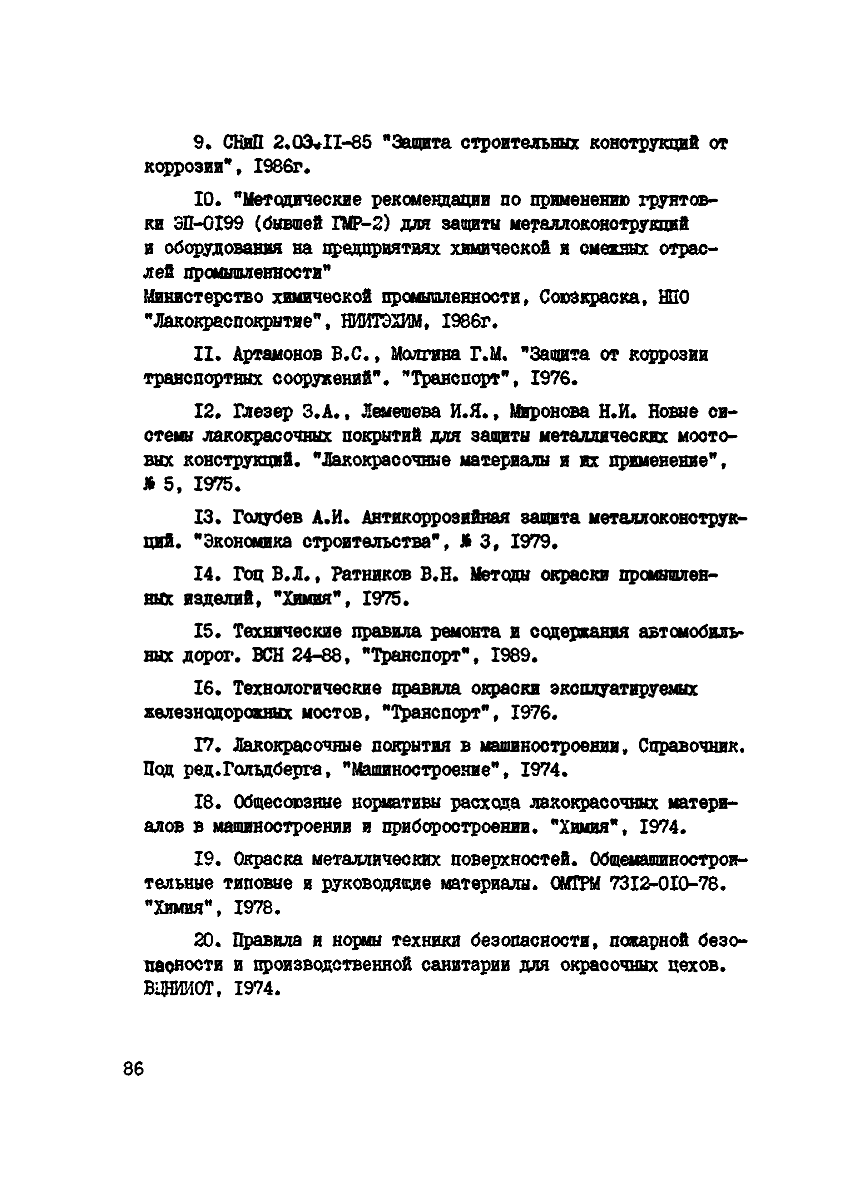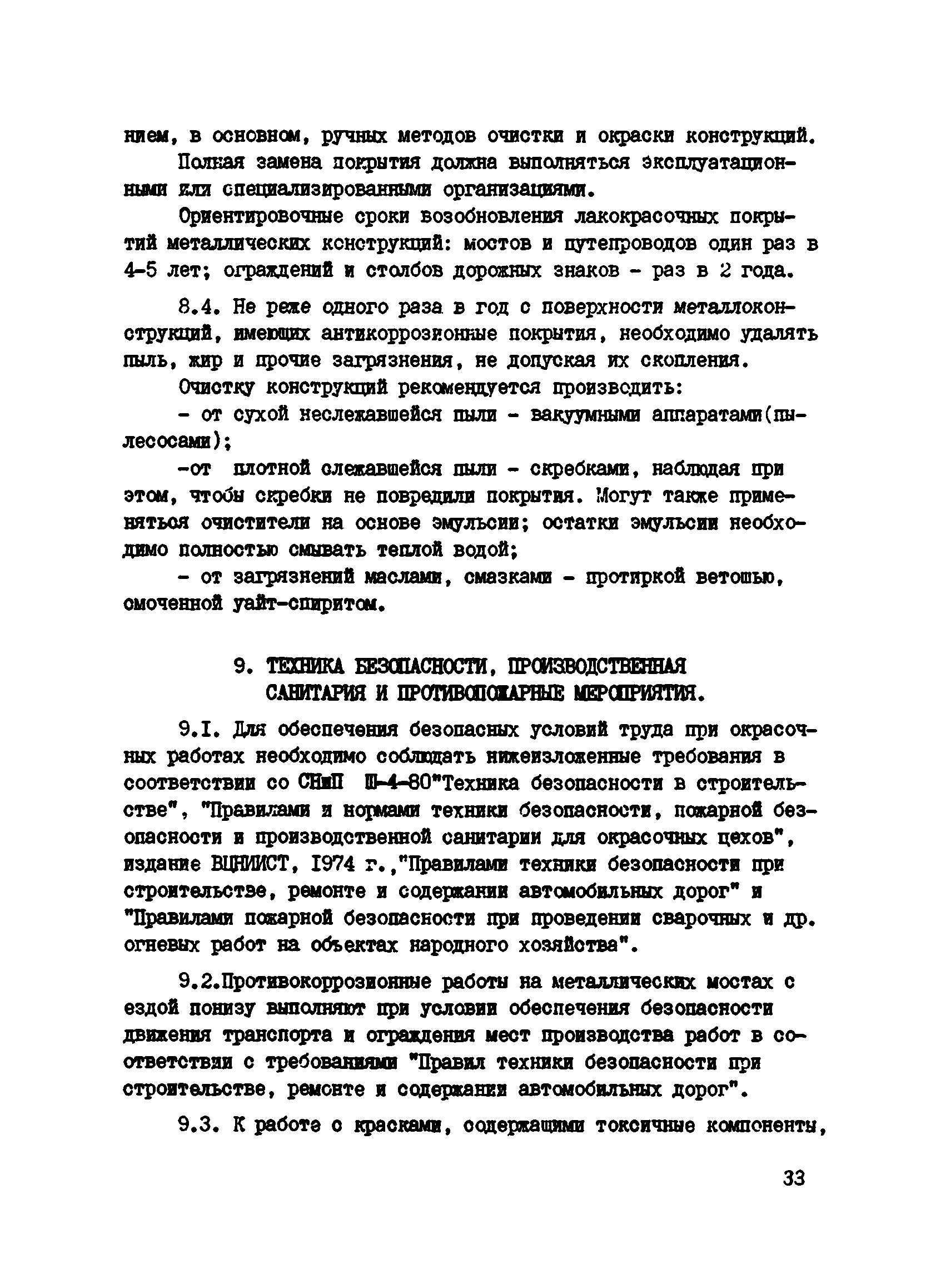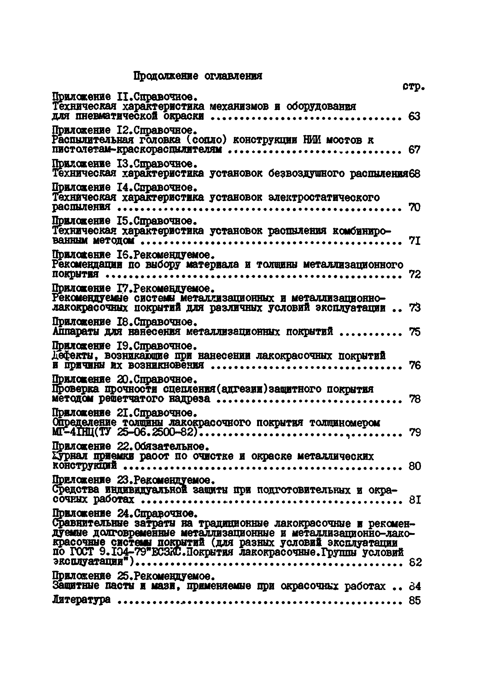 Инструкция по защите металлических конструкций эксплуатируемых на автомобильных дорогах РСФСР мостов, путепроводов, ограждений и дорожных знаков| Статус: | действует | | Название рус.: | Инструкция по защите металлических конструкций эксплуатируемых на автомобильных дорогах РСФСР мостов, путепроводов, ограждений и дорожных знаков | | Название англ.: | Guidelines for the Protection of Metal Structures Used in Road Construction in the Russian Federation - Bridges, Overpasses, Guardrails, and Traffic Signs | | Дата добавления в базу: | 01.09.2013 | | Дата актуализации: | 01.01.2021 | | Область применения: | Инструкция должна соблюдаться при введении работ по защите от коррозии эксплуатируемых мостов, путепроводов, ограждений и дорожных знаков | | Оглавление: | 1 Общие положения 2 Подготовка поверхности металлоконструкций к нанесению противокоррозионных покрытий 3 Герметизация неплотностей в клепаных мостовых конструкциях 4 Выбор материалов и систем покрытий для противокоррозионной защиты металлов от коррозии 5 Приготовление рабочих составов, правила хранения и контроль качества лакокрасочных материалов 6 Нанесение противокоррозионных покрытий 7 Организация работ по защите металлов от коррозии 8 Уход за антикоррозионными покрытиями в процессе эксплуатации 9 Техника безопасности, производственная санитария и противопожарные мероприятия 10 Технико-экономические показатели Приложение 1 Определение коррозии металлоконструкций и степень очистки по ГОСТ 9.402-80 Приложение 2 Виды разрушений лакокрасочных покрытий Приложение 3 Технологические режимы обработки металлических конструкций кислотными пастами Приложение 4 Технические характеристики пневматического инструмента для очистки металлоконструкций Приложение 5 Технические характеристики электрического инструмента Приложение 6 Техническая характеристика передвижного гидропескоструйного аппарата ГПА-3 Приложение 7 Материалы, рекомендуемые для герметизации неплотностей в мостовых конструкциях Приложение 8 Характеристика лакокрасочных материалов Приложение 9 Технологические режимы нанесения лакокрасочных покрытий Приложение 10 Рекомендуемые системы лакокрасочных покрытий с модификаторами ржавчины Приложение 11 Техническая характеристика механизмов и оборудования для пневматической окраски Приложение 12 Распылительная головка (сопло) конструкции НИИ мостов к Приложение 13 Техническая характеристика установок безвоздушного распыления Приложение 14 Техническая характеристика установок электростатического распыления Приложение 15 Техническая характеристика установок распыления комбинированным методом Приложение 16 Рекомендации по выбору материала и толщины металлизационного покрытия Приложение 17 Рекомендуемые системы металлизационных и металлизационно-лакокрасочных покрытий для различных условий эксплуатации Приложение 18 Аппараты для нанесения металлизационных покрытий Приложение 19 Дефекты, возникавшие при нанесении лакокрасочных покрытий и причины их возникновения Приложение 20 Проверка прочности сцепления (адгезии) защитного покрытия методом решетчатого надреза Приложение 21 Определение толщины лакокрасочного покрытия толщиномером МГ-4ГНЦ (ТУ 25-06, 2500-82) Приложение 22 Журнал приемки работ по очистке и окраске металлических конструкций Приложение 23 Средства индивидуальной защиты при подготовительных и окрасочных работах Прил