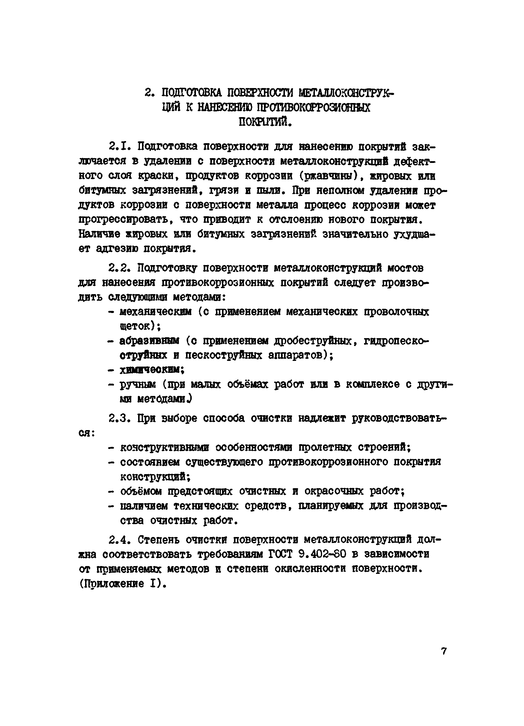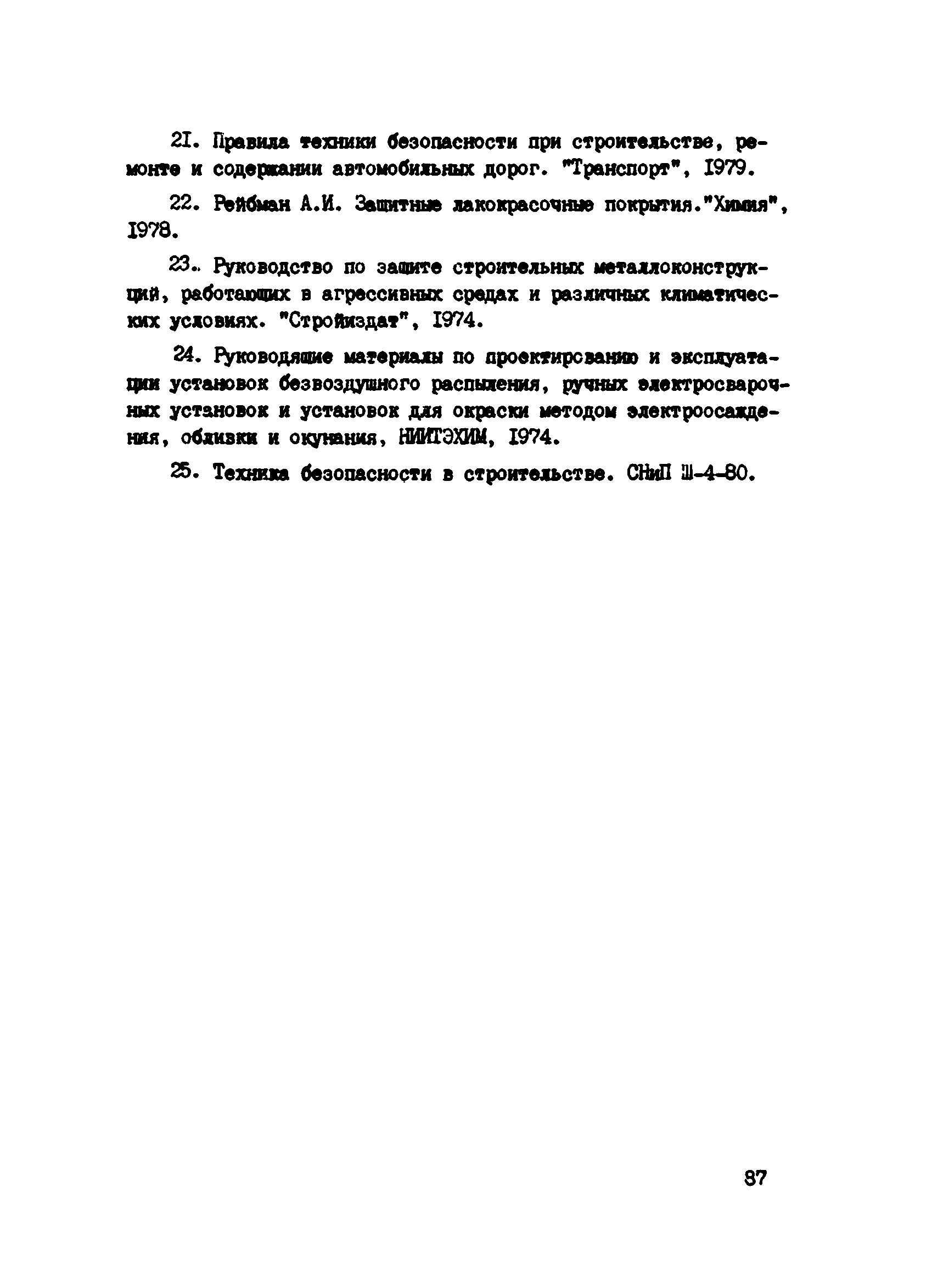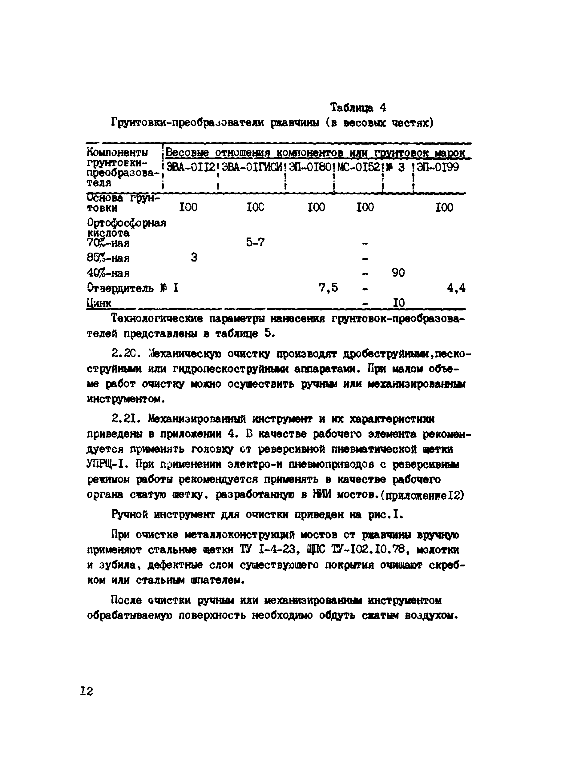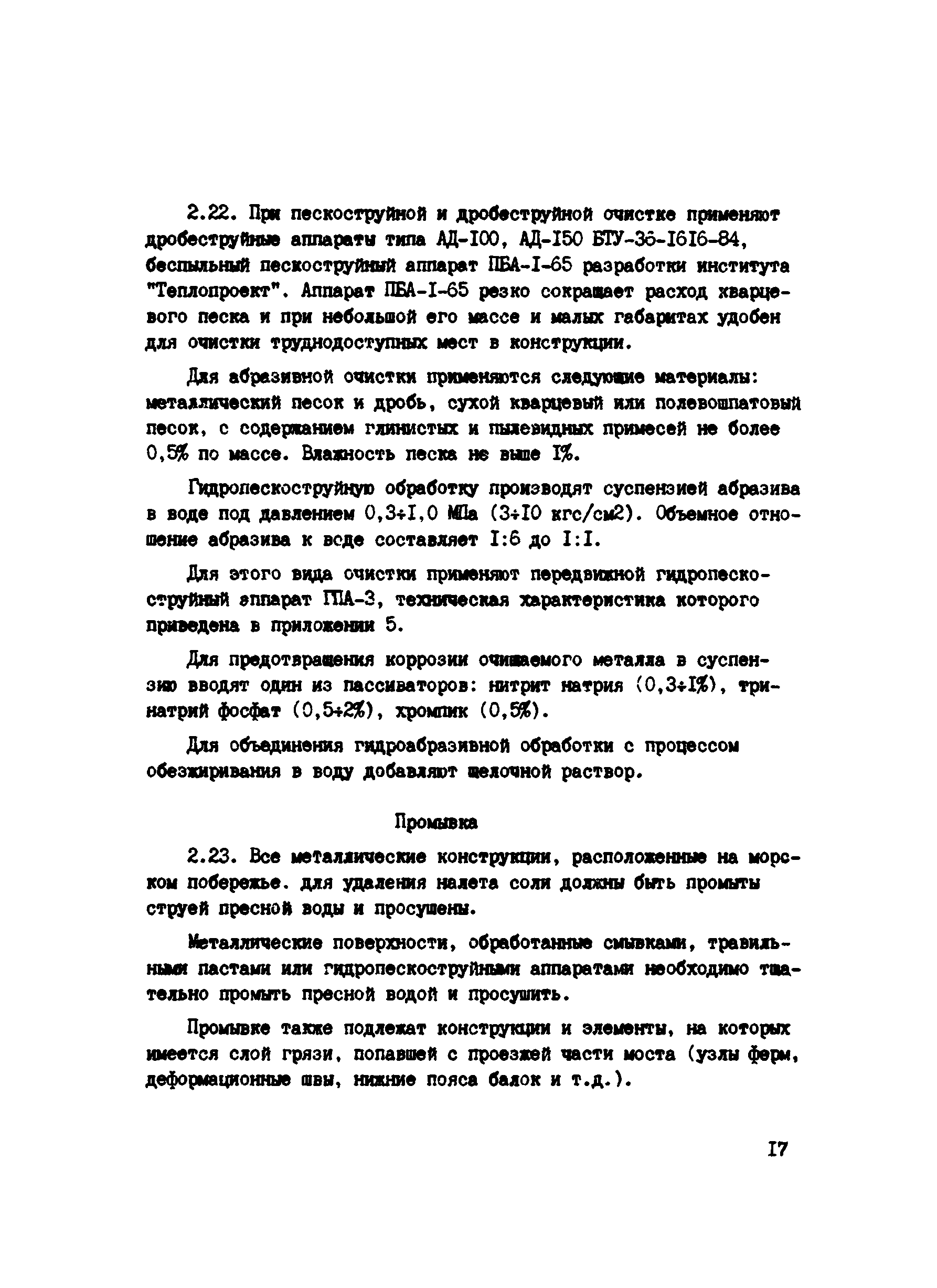 Инструкция по защите металлических конструкций эксплуатируемых на автомобильных дорогах РСФСР мостов, путепроводов, ограждений и дорожных знаков| Статус: | действует | | Название рус.: | Инструкция по защите металлических конструкций эксплуатируемых на автомобильных дорогах РСФСР мостов, путепроводов, ограждений и дорожных знаков | | Название англ.: | Guidelines for the Protection of Metal Structures Used in Road Construction in the Russian Federation - Bridges, Overpasses, Guardrails, and Traffic Signs | | Дата добавления в базу: | 01.09.2013 | | Дата актуализации: | 01.01.2021 | | Область применения: | Инструкция должна соблюдаться при введении работ по защите от коррозии эксплуатируемых мостов, путепроводов, ограждений и дорожных знаков | | Оглавление: | 1 Общие положения 2 Подготовка поверхности металлоконструкций к нанесению противокоррозионных покрытий 3 Герметизация неплотностей в клепаных мостовых конструкциях 4 Выбор материалов и систем покрытий для противокоррозионной защиты металлов от коррозии 5 Приготовление рабочих составов, правила хранения и контроль качества лакокрасочных материалов 6 Нанесение противокоррозионных покрытий 7 Организация работ по защите металлов от коррозии 8 Уход за антикоррозионными покрытиями в процессе эксплуатации 9 Техника безопасности, производственная санитария и противопожарные мероприятия 10 Технико-экономические показатели Приложение 1 Определение коррозии металлоконструкций и степень очистки по ГОСТ 9.402-80 Приложение 2 Виды разрушений лакокрасочных покрытий Приложение 3 Технологические режимы обработки металлических конструкций кислотными пастами Приложение 4 Технические характеристики пневматического инструмента для очистки металлоконструкций Приложение 5 Технические характеристики электрического инструмента Приложение 6 Техническая характеристика передвижного гидропескоструйного аппарата ГПА-3 Приложение 7 Материалы, рекомендуемые для герметизации неплотностей в мостовых конструкциях Приложение 8 Характеристика лакокрасочных материалов Приложение 9 Технологические режимы нанесения лакокрасочных покрытий Приложение 10 Рекомендуемые системы лакокрасочных покрытий с модификаторами ржавчины Приложение 11 Техническая характеристика механизмов и оборудования для пневматической окраски Приложение 12 Распылительная головка (сопло) конструкции НИИ мостов к Приложение 13 Техническая характеристика установок безвоздушного распыления Приложение 14 Техническая характеристика установок электростатического распыления Приложение 15 Техническая характеристика установок распыления комбинированным методом Приложение 16 Рекомендации по выбору материала и толщины металлизационного покрытия Приложение 17 Рекомендуемые системы металлизационных и металлизационно-лакокрасочных покрытий для различных условий эксплуатации Приложение 18 Аппараты для нанесения металлизационных покрытий Приложение 19 Дефекты, возникавшие при нанесении лакокрасочных покрытий и причины их возникновения Приложение 20 Проверка прочности сцепления (адгезии) защитного покрытия методом решетчатого надреза Приложение 21 Определение толщины лакокрасочного покрытия толщиномером МГ-4ГНЦ (ТУ 25-06, 2500-82) Приложение 22 Журнал приемки работ по очистке и окраске металлических конструкций Приложение 23 Средства индивидуальной защиты при подготовительных и окрасочных работах Прил