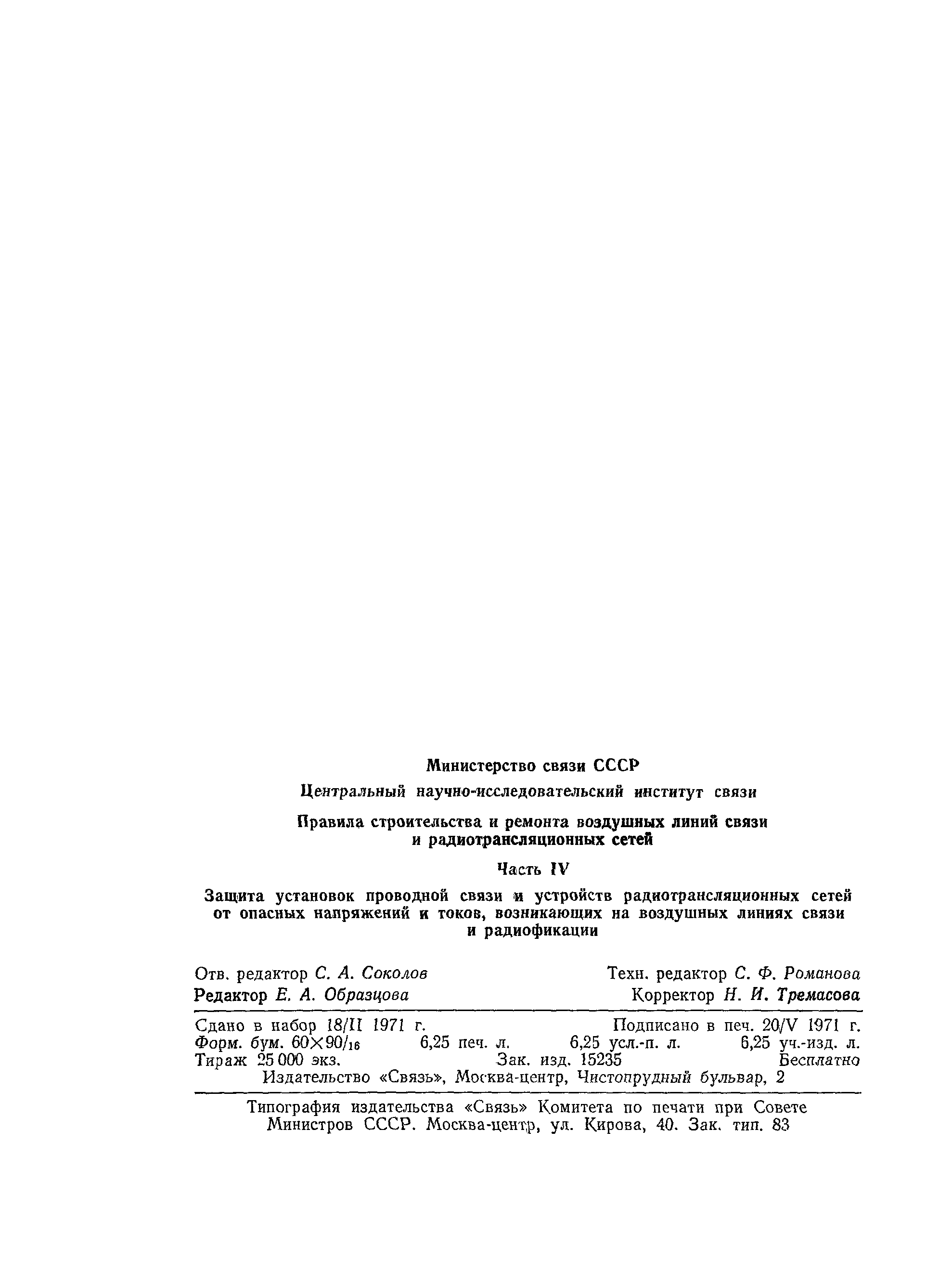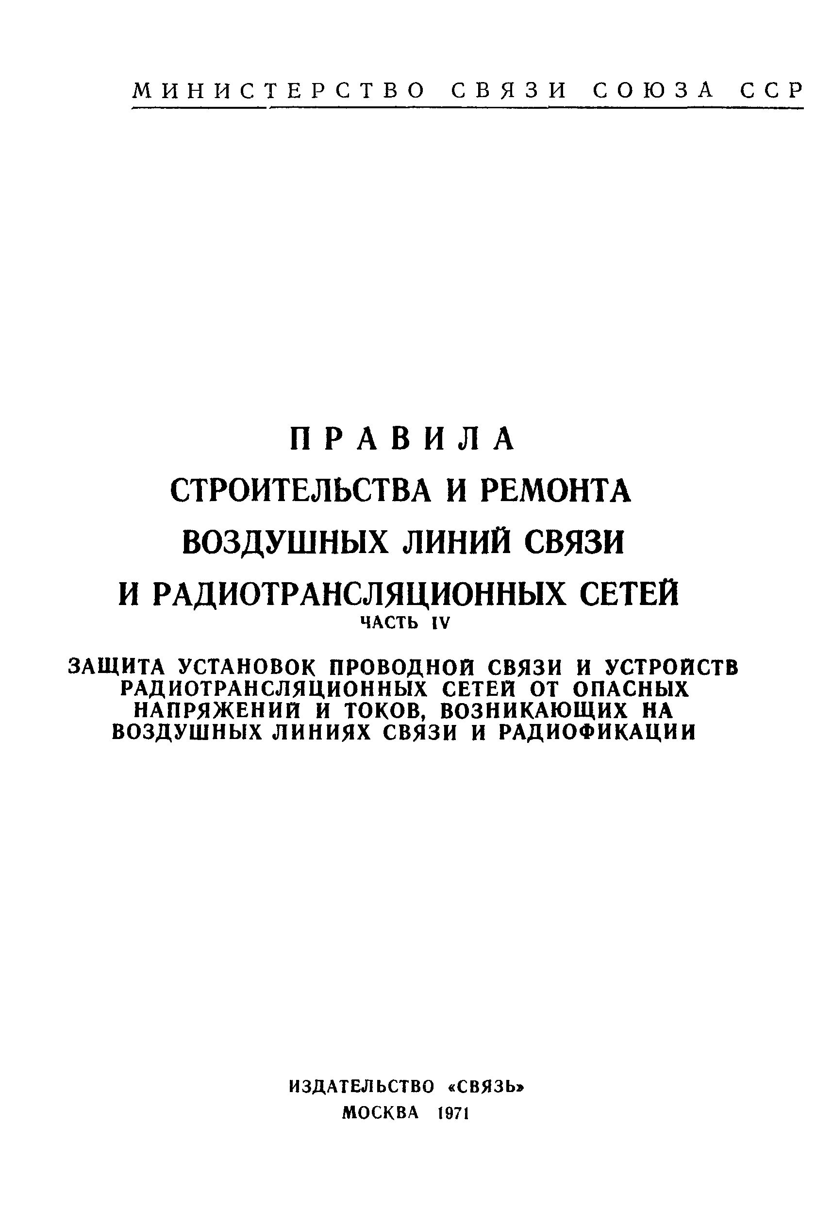 | Название рус.: | Часть 4. Защита установок проводной связи и устройств радиотрансляционных сетей от опасных напряжений и токов, возникающих на воздушных линиях связи и радиофикации |