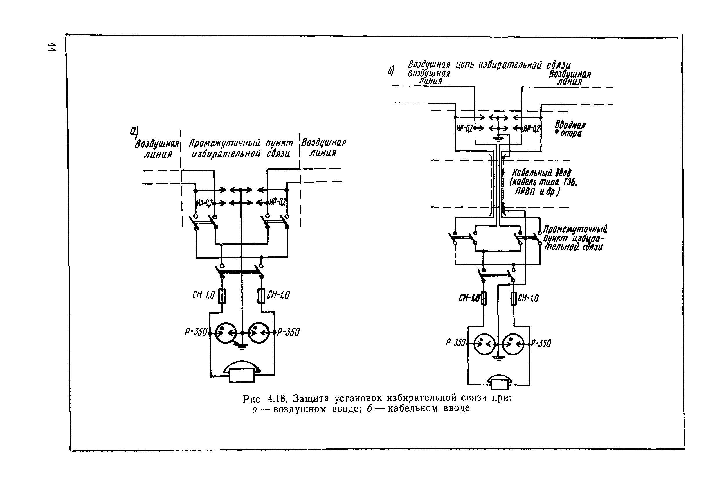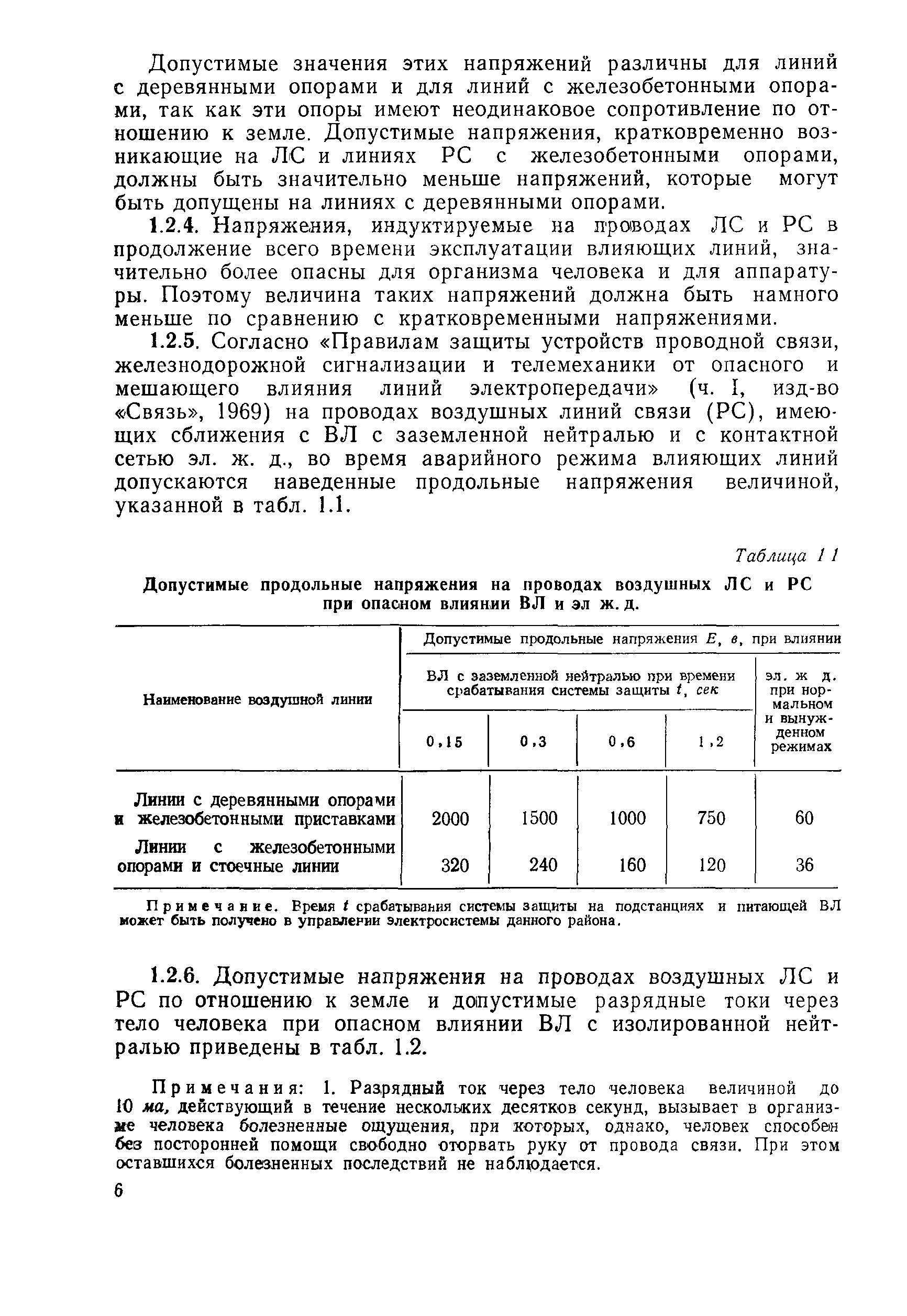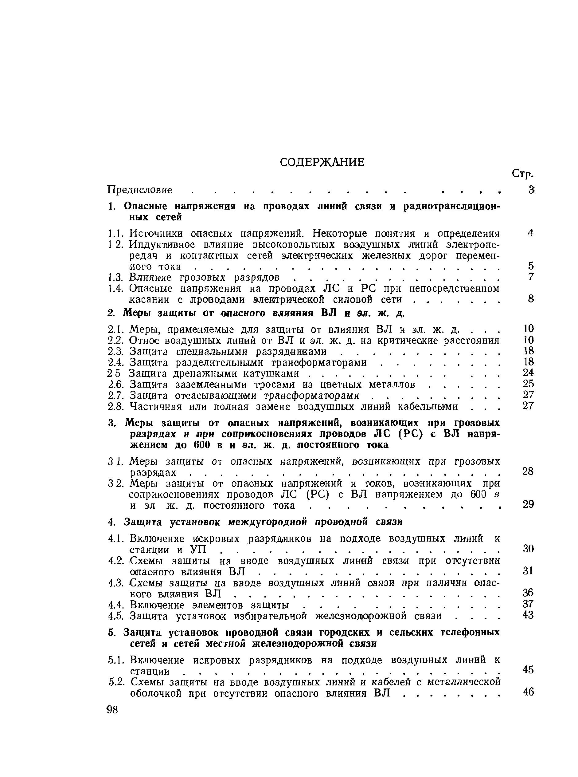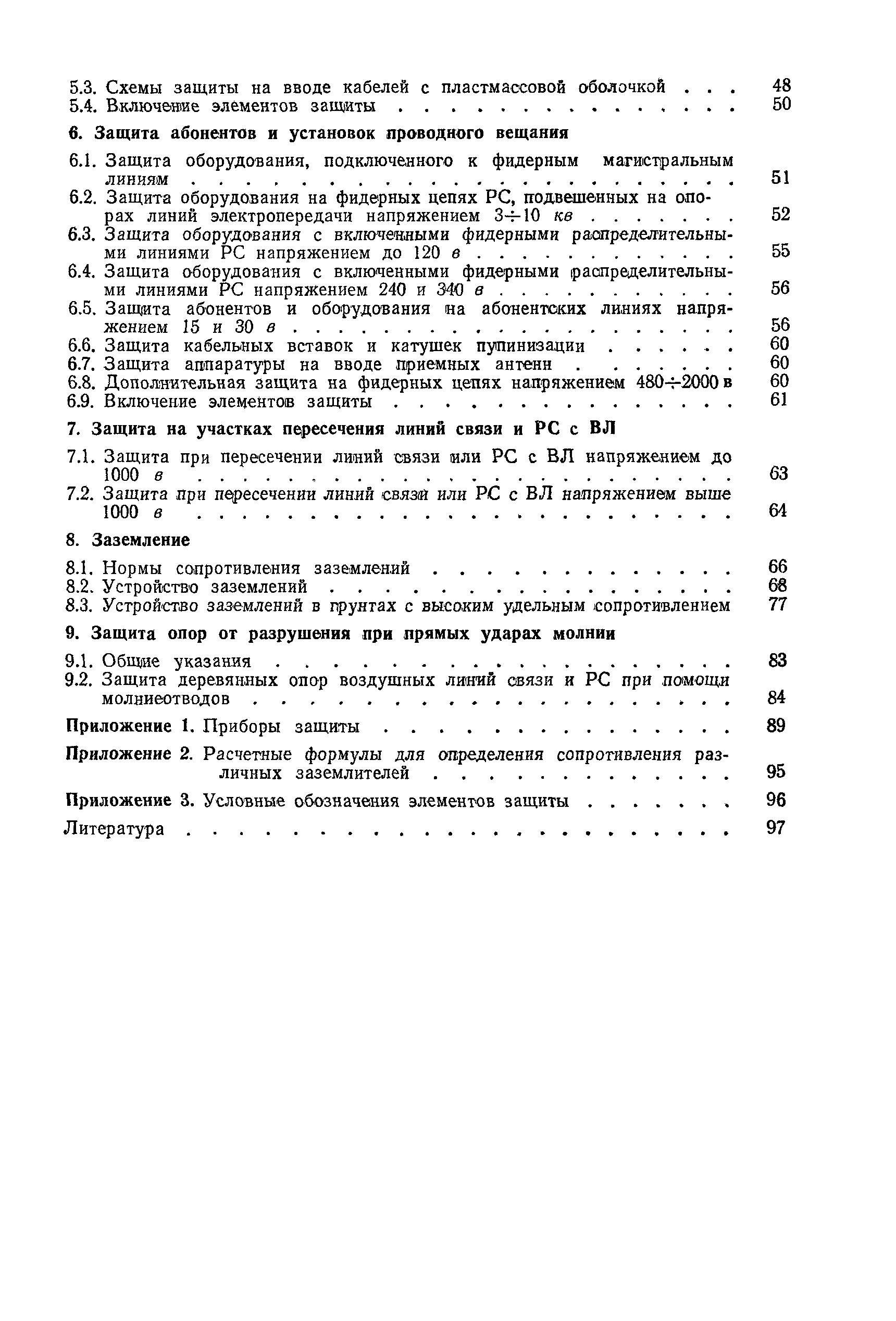 | Оглавление: | Предисловие 1. Опасные напряжения на проводах линий связи и радиотрансляционных сетей 1.1. Источники опасных напряжений. Некоторые понятия и определения 1.2. Индуктивное влияние высоковольтных воздушных линий электропередач и контактных сетей электрических железных дорог переменного тока 1.3. Влияние грозовых разрядов 1.4. Опасные напряжения на проводах ЛС и РС при непосредственном касании с проводами электрической силовой сети 2. Меры защиты от опасного влияния ВЛ и эл. Ж. д. 2.1. Меры, применяемые для защиты от влияния ВЛ и эл.ж.д 2.2. Относ воздушных линий от ВЛ и эл. ж.д. на критические расстояния 2.3. Защита специальными разрядниками 2.4. Защита разделительными трансформаторами 2.5. Защита дренажными катушками 2.6. Защита заземленными тросами из цветных металлов 2.7. Защита отсасывающими трансформаторами 2.8. Частичная или полная замена воздушных линий кабельными 3. Меры защиты от опасных напряжений, возникающих при грозовых разрядах и при соприкосновениях проводов ЛС (РС) с ВЛ напряжением до 600 В и эл. Ж. д. постоянного тока 3.1. Меры защиты от опасных напряжений, возникающих при грозовых разрядах 3.2. Меры защиты от опасных напряжений и токов, возникающих при соприкосновениях проводов ЛС (РС) с ВЛ напряжением до 600 В и эл.ж.д. постоянного тока 4. Защита установок междугородной проводной связи 4.1. Включение искровых разрядников на подходе воздушных линий к станции и УП 4.2. Схемы защиты на вводе воздушных линий связи при отсутствии опасного влияния ВЛ 4.3. Схемы защиты на вводе воздушных линий связи при наличии опасного влияния ВЛ 4.4. Включение элементов защиты 4.5. Защита установок избирательной железнодорожной связи 5. Защита установок проводной связи городских и сельских телефонных сетей и сетей местной железнодорожной связи 5.1. Включение искровых разрядников на подходе воздушных линий к станции 5.2. Схемы защиты на вводе воздушных линий и кабелей с металлической оболочкой при отсутствии опасного влияния ВЛ 5.3. Схемы защиты на вводе кабелей с пластмассовой оболочкой 5.4. Включение элементов защиты 6. Защита абонентов и установок проводного вещания 6.1. Защита оборудования, подключенного к фидерным магистральным линиям 6.2. Защита оборудования на фидерных цепях РС, подвешенных на опорах линий электропередачи напряжением 3/10 Кв 6.3. Защита оборудования с включенными фидерными распределительными линиями РС напряжением до 120 В 6.4. Защита оборудования с включенными фидерными распределительными линиями РС напряжением 240 и 340 В 6.5. Защита абонентов и оборудования на абонентских линиях напряжением 15 и 30 В 6.6. Защита кабельных вставок и катушек пупинизации 6.7. Защита аппаратуры на вводе приемных антенн 6.8. Дополнительная защита на фидерных цепях напряжением 480/2000 В 6.9. Включение элементов защиты 7. Защита на участках пересечения линий связи и РС с ВЛ 7.1. Защита при пересечении линий связи или РС с ВЛ напряжением до 1000 В 7.2. Защита при пересечении линий связи или РС с ВЛ напряжением выше 1000 В 8. Заземление 8.1. Нормы сопротивления заземлений 8.2. Устройство заземлений 8.3. Устройство заземлений в грунтах с высоким удельным сопротивлением 9. Защита опор разрушения при прямых ударах молнии 9.1. Общие указания 9.2. Защита деревянных опор воздушных линий связи и РС при помощи молниеотводов Приложение 1. Приборы защиты Приложение 2. Расчетные формулы для определен