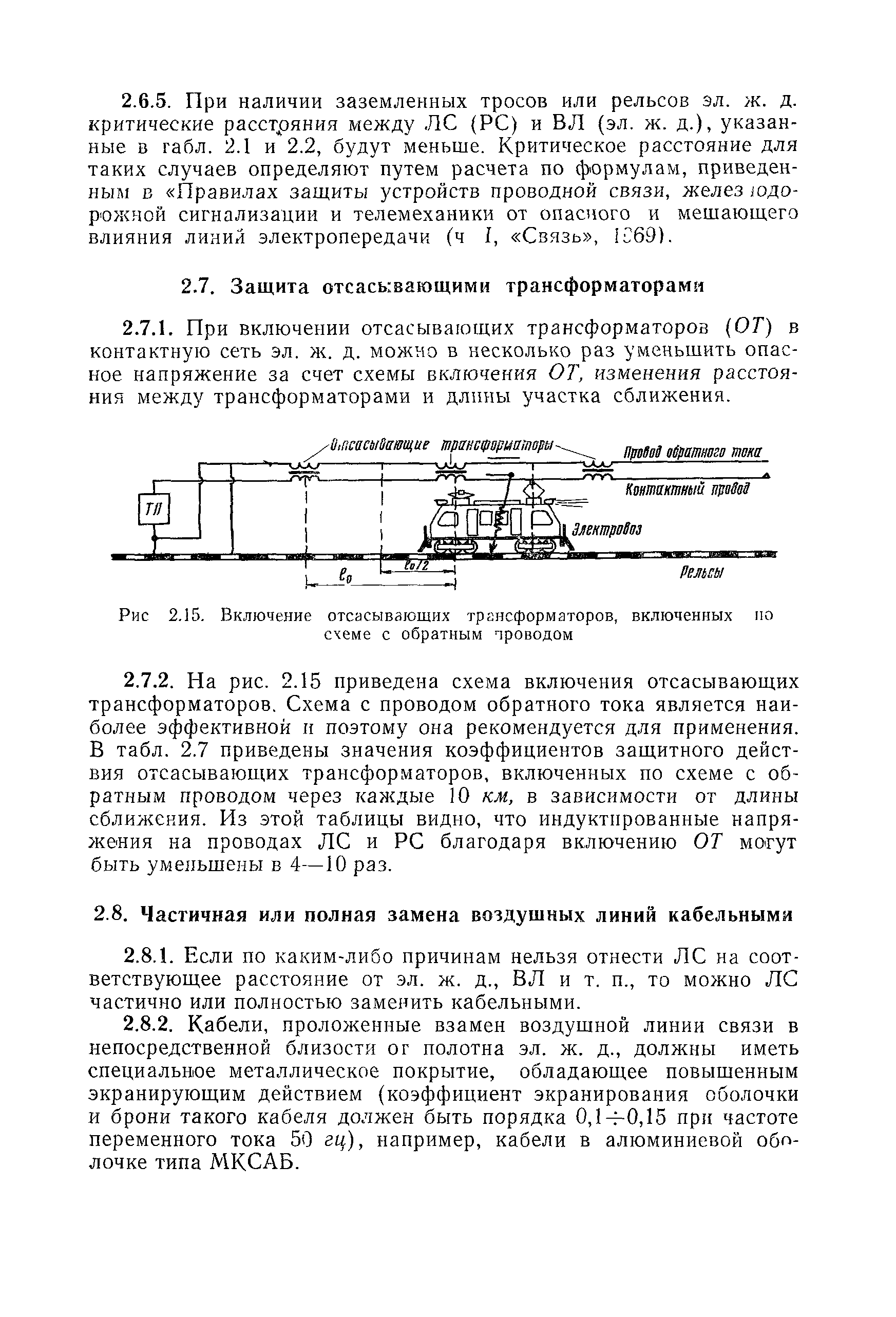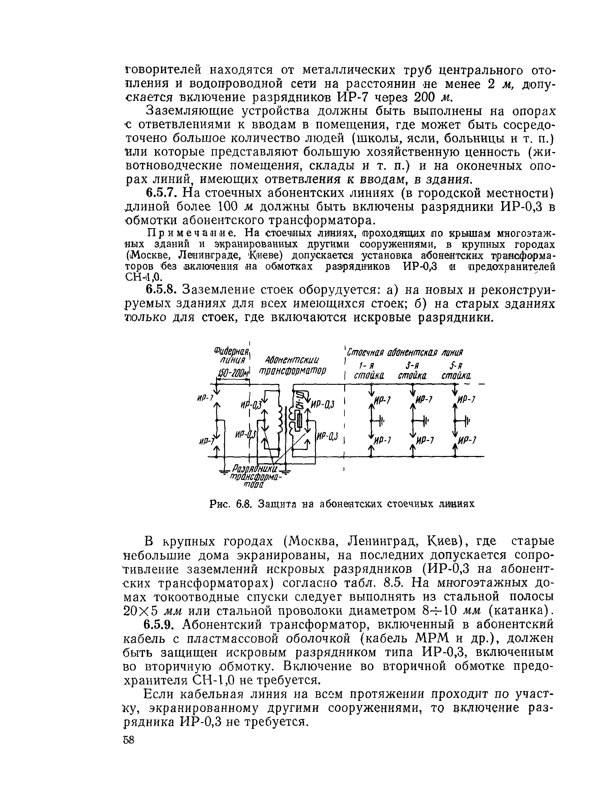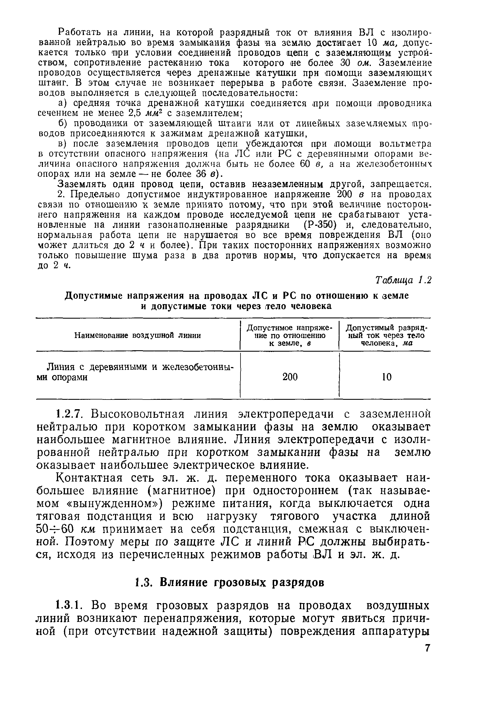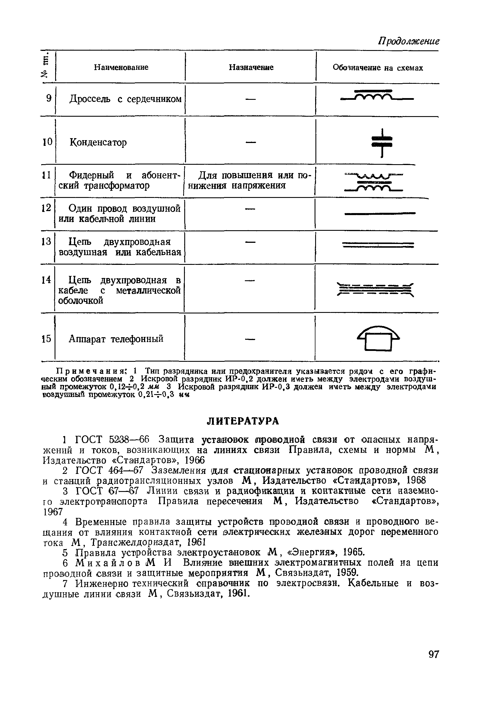 | Оглавление: | Предисловие 1. Опасные напряжения на проводах линий связи и радиотрансляционных сетей 1.1. Источники опасных напряжений. Некоторые понятия и определения 1.2. Индуктивное влияние высоковольтных воздушных линий электропередач и контактных сетей электрических железных дорог переменного тока 1.3. Влияние грозовых разрядов 1.4. Опасные напряжения на проводах ЛС и РС при непосредственном касании с проводами электрической силовой сети 2. Меры защиты от опасного влияния ВЛ и эл. Ж. д. 2.1. Меры, применяемые для защиты от влияния ВЛ и эл.ж.д 2.2. Относ воздушных линий от ВЛ и эл. ж.д. на критические расстояния 2.3. Защита специальными разрядниками 2.4. Защита разделительными трансформаторами 2.5. Защита дренажными катушками 2.6. Защита заземленными тросами из цветных металлов 2.7. Защита отсасывающими трансформаторами 2.8. Частичная или полная замена воздушных линий кабельными 3. Меры защиты от опасных напряжений, возникающих при грозовых разрядах и при соприкосновениях проводов ЛС (РС) с ВЛ напряжением до 600 В и эл. Ж. д. постоянного тока 3.1. Меры защиты от опасных напряжений, возникающих при грозовых разрядах 3.2. Меры защиты от опасных напряжений и токов, возникающих при соприкосновениях проводов ЛС (РС) с ВЛ напряжением до 600 В и эл.ж.д. постоянного тока 4. Защита установок междугородной проводной связи 4.1. Включение искровых разрядников на подходе воздушных линий к станции и УП 4.2. Схемы защиты на вводе воздушных линий связи при отсутствии опасного влияния ВЛ 4.3. Схемы защиты на вводе воздушных линий связи при наличии опасного влияния ВЛ 4.4. Включение элементов защиты 4.5. Защита установок избирательной железнодорожной связи 5. Защита установок проводной связи городских и сельских телефонных сетей и сетей местной железнодорожной связи 5.1. Включение искровых разрядников на подходе воздушных линий к станции 5.2. Схемы защиты на вводе воздушных линий и кабелей с металлической оболочкой при отсутствии опасного влияния ВЛ 5.3. Схемы защиты на вводе кабелей с пластмассовой оболочкой 5.4. Включение элементов защиты 6. Защита абонентов и установок проводного вещания 6.1. Защита оборудования, подключенного к фидерным магистральным линиям 6.2. Защита оборудования на фидерных цепях РС, подвешенных на опорах линий электропередачи напряжением 3/10 Кв 6.3. Защита оборудования с включенными фидерными распределительными линиями РС напряжением до 120 В 6.4. Защита оборудования с включенными фидерными распределительными линиями РС напряжением 240 и 340 В 6.5. Защита абонентов и оборудования на абонентских линиях напряжением 15 и 30 В 6.6. Защита кабельных вставок и катушек пупинизации 6.7. Защита аппаратуры на вводе приемных антенн 6.8. Дополнительная защита на фидерных цепях напряжением 480/2000 В 6.9. Включение элементов защиты 7. Защита на участках пересечения линий связи и РС с ВЛ 7.1. Защита при пересечении линий связи или РС с ВЛ напряжением до 1000 В 7.2. Защита при пересечении линий связи или РС с ВЛ напряжением выше 1000 В 8. Заземление 8.1. Нормы сопротивления заземлений 8.2. Устройство заземлений 8.3. Устройство заземлений в грунтах с высоким удельным сопротивлением 9. Защита опор разрушения при прямых ударах молнии 9.1. Общие указания 9.2. Защита деревянных опор воздушных линий связи и РС при помощи молниеотводов Приложение 1. Приборы защиты Приложение 2. Расчетные формулы для определен