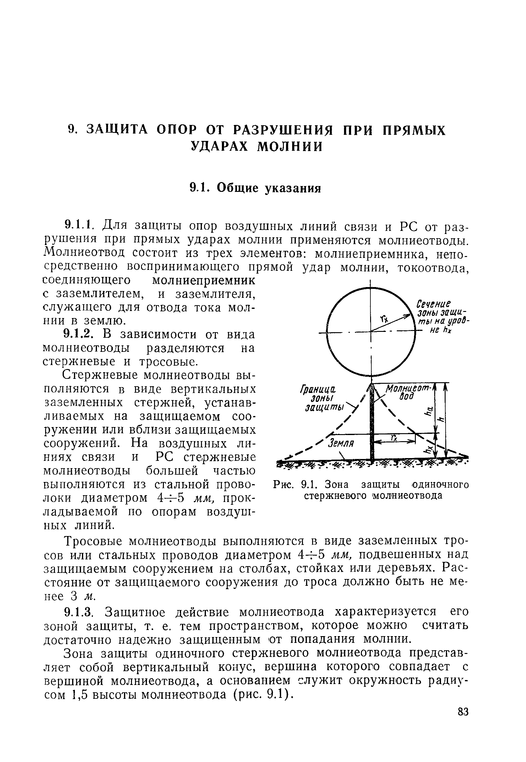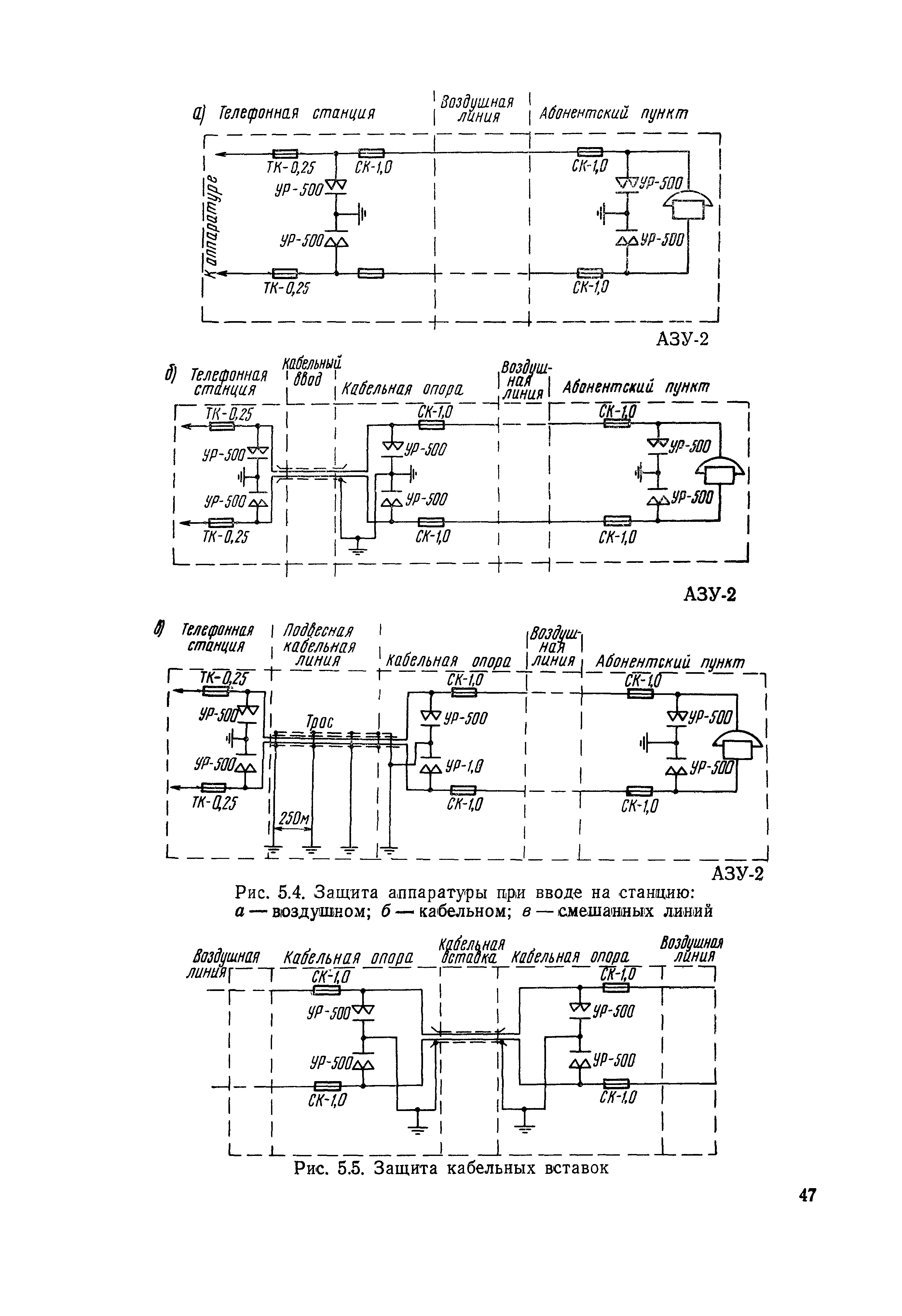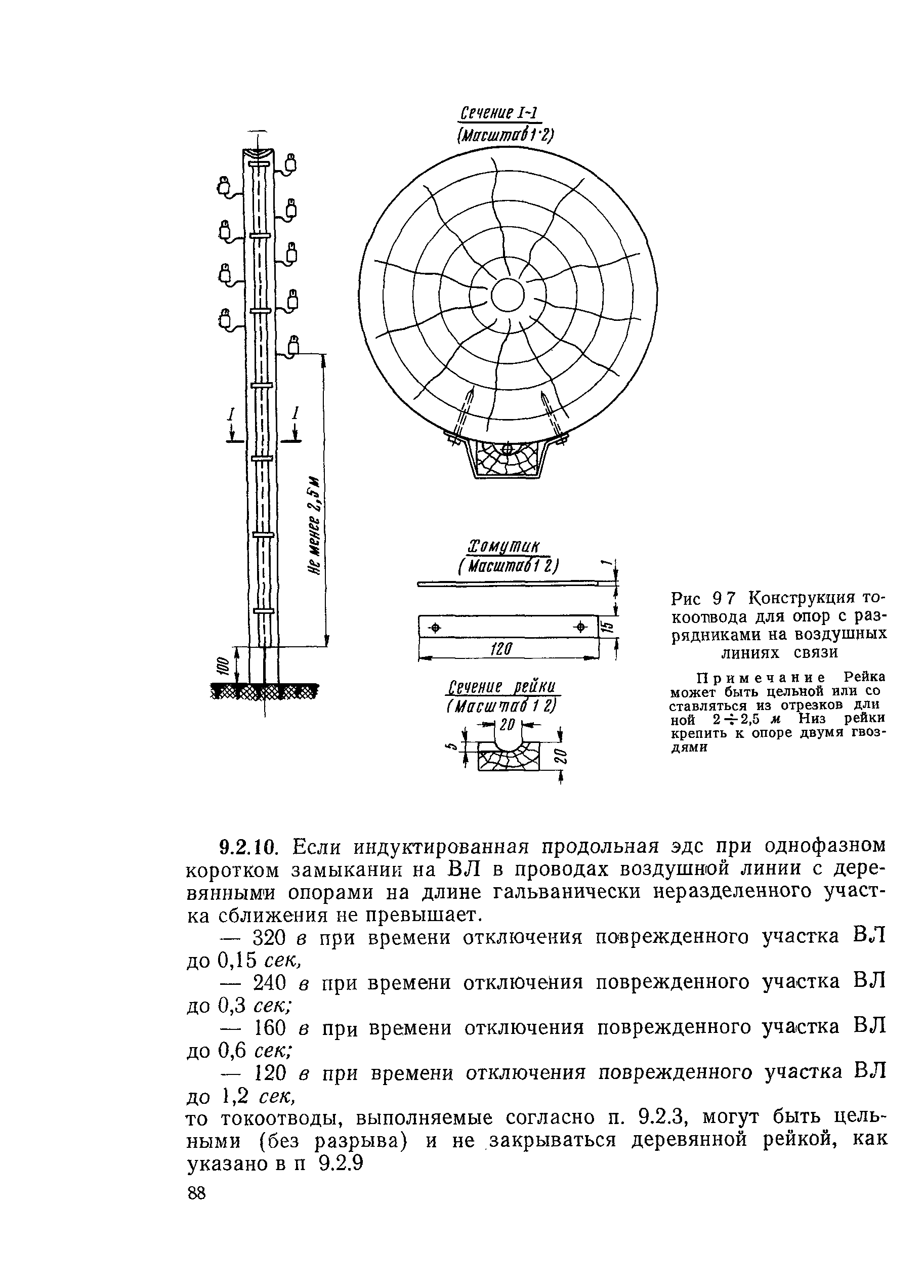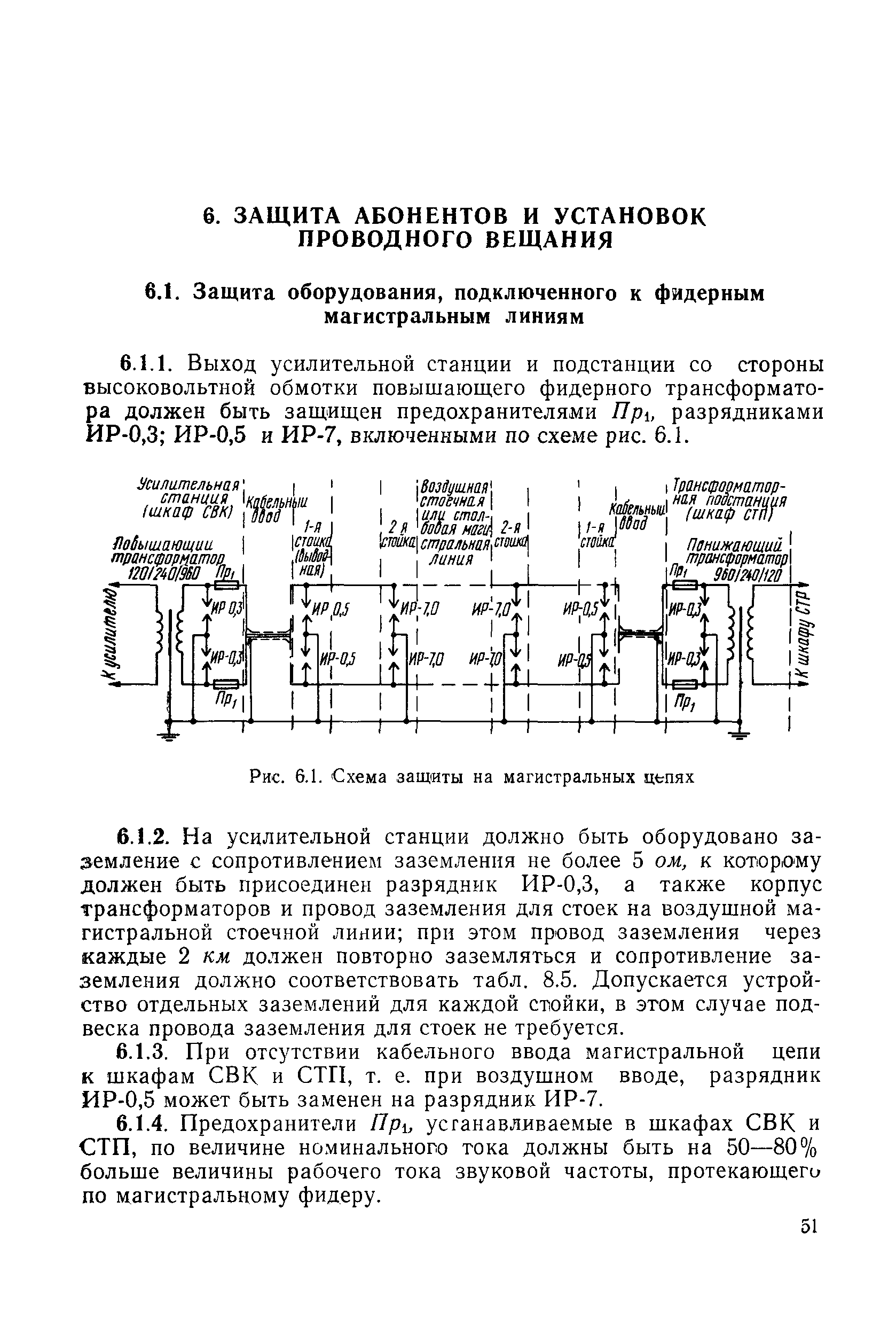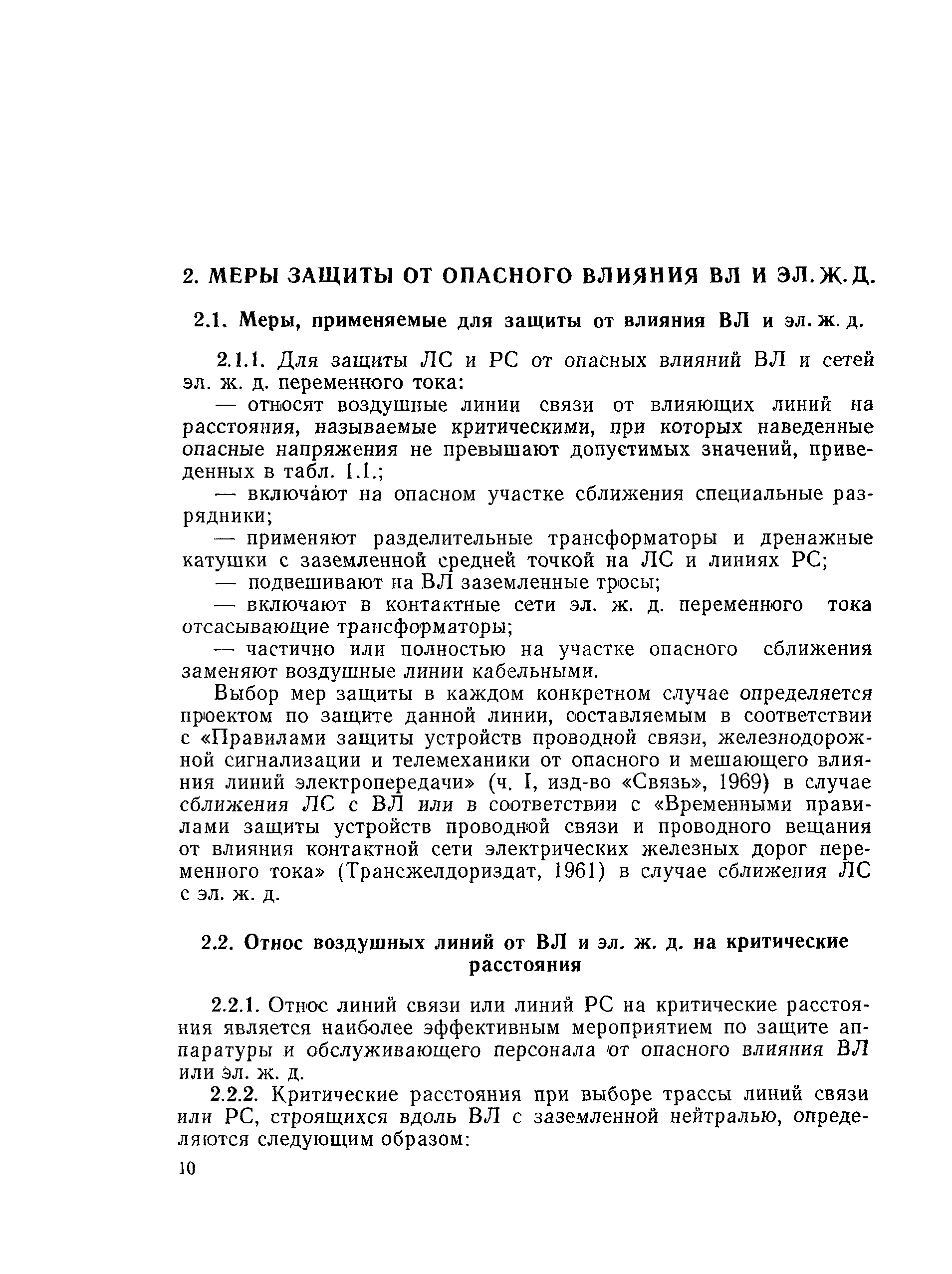 | Оглавление: | Предисловие 1. Опасные напряжения на проводах линий связи и радиотрансляционных сетей 1.1. Источники опасных напряжений. Некоторые понятия и определения 1.2. Индуктивное влияние высоковольтных воздушных линий электропередач и контактных сетей электрических железных дорог переменного тока 1.3. Влияние грозовых разрядов 1.4. Опасные напряжения на проводах ЛС и РС при непосредственном касании с проводами электрической силовой сети 2. Меры защиты от опасного влияния ВЛ и эл. Ж. д. 2.1. Меры, применяемые для защиты от влияния ВЛ и эл.ж.д 2.2. Относ воздушных линий от ВЛ и эл. ж.д. на критические расстояния 2.3. Защита специальными разрядниками 2.4. Защита разделительными трансформаторами 2.5. Защита дренажными катушками 2.6. Защита заземленными тросами из цветных металлов 2.7. Защита отсасывающими трансформаторами 2.8. Частичная или полная замена воздушных линий кабельными 3. Меры защиты от опасных напряжений, возникающих при грозовых разрядах и при соприкосновениях проводов ЛС (РС) с ВЛ напряжением до 600 В и эл. Ж. д. постоянного тока 3.1. Меры защиты от опасных напряжений, возникающих при грозовых разрядах 3.2. Меры защиты от опасных напряжений и токов, возникающих при соприкосновениях проводов ЛС (РС) с ВЛ напряжением до 600 В и эл.ж.д. постоянного тока 4. Защита установок междугородной проводной связи 4.1. Включение искровых разрядников на подходе воздушных линий к станции и УП 4.2. Схемы защиты на вводе воздушных линий связи при отсутствии опасного влияния ВЛ 4.3. Схемы защиты на вводе воздушных линий связи при наличии опасного влияния ВЛ 4.4. Включение элементов защиты 4.5. Защита установок избирательной железнодорожной связи 5. Защита установок проводной связи городских и сельских телефонных сетей и сетей местной железнодорожной связи 5.1. Включение искровых разрядников на подходе воздушных линий к станции 5.2. Схемы защиты на вводе воздушных линий и кабелей с металлической оболочкой при отсутствии опасного влияния ВЛ 5.3. Схемы защиты на вводе кабелей с пластмассовой оболочкой 5.4. Включение элементов защиты 6. Защита абонентов и установок проводного вещания 6.1. Защита оборудования, подключенного к фидерным магистральным линиям 6.2. Защита оборудования на фидерных цепях РС, подвешенных на опорах линий электропередачи напряжением 3/10 Кв 6.3. Защита оборудования с включенными фидерными распределительными линиями РС напряжением до 120 В 6.4. Защита оборудования с включенными фидерными распределительными линиями РС напряжением 240 и 340 В 6.5. Защита абонентов и оборудования на абонентских линиях напряжением 15 и 30 В 6.6. Защита кабельных вставок и катушек пупинизации 6.7. Защита аппаратуры на вводе приемных антенн 6.8. Дополнительная защита на фидерных цепях напряжением 480/2000 В 6.9. Включение элементов защиты 7. Защита на участках пересечения линий связи и РС с ВЛ 7.1. Защита при пересечении линий связи или РС с ВЛ напряжением до 1000 В 7.2. Защита при пересечении линий связи или РС с ВЛ напряжением выше 1000 В 8. Заземление 8.1. Нормы сопротивления заземлений 8.2. Устройство заземлений 8.3. Устройство заземлений в грунтах с высоким удельным сопротивлением 9. Защита опор разрушения при прямых ударах молнии 9.1. Общие указания 9.2. Защита деревянных опор воздушных линий связи и РС при помощи молниеотводов Приложение 1. Приборы защиты Приложение 2. Расчетные формулы для определен