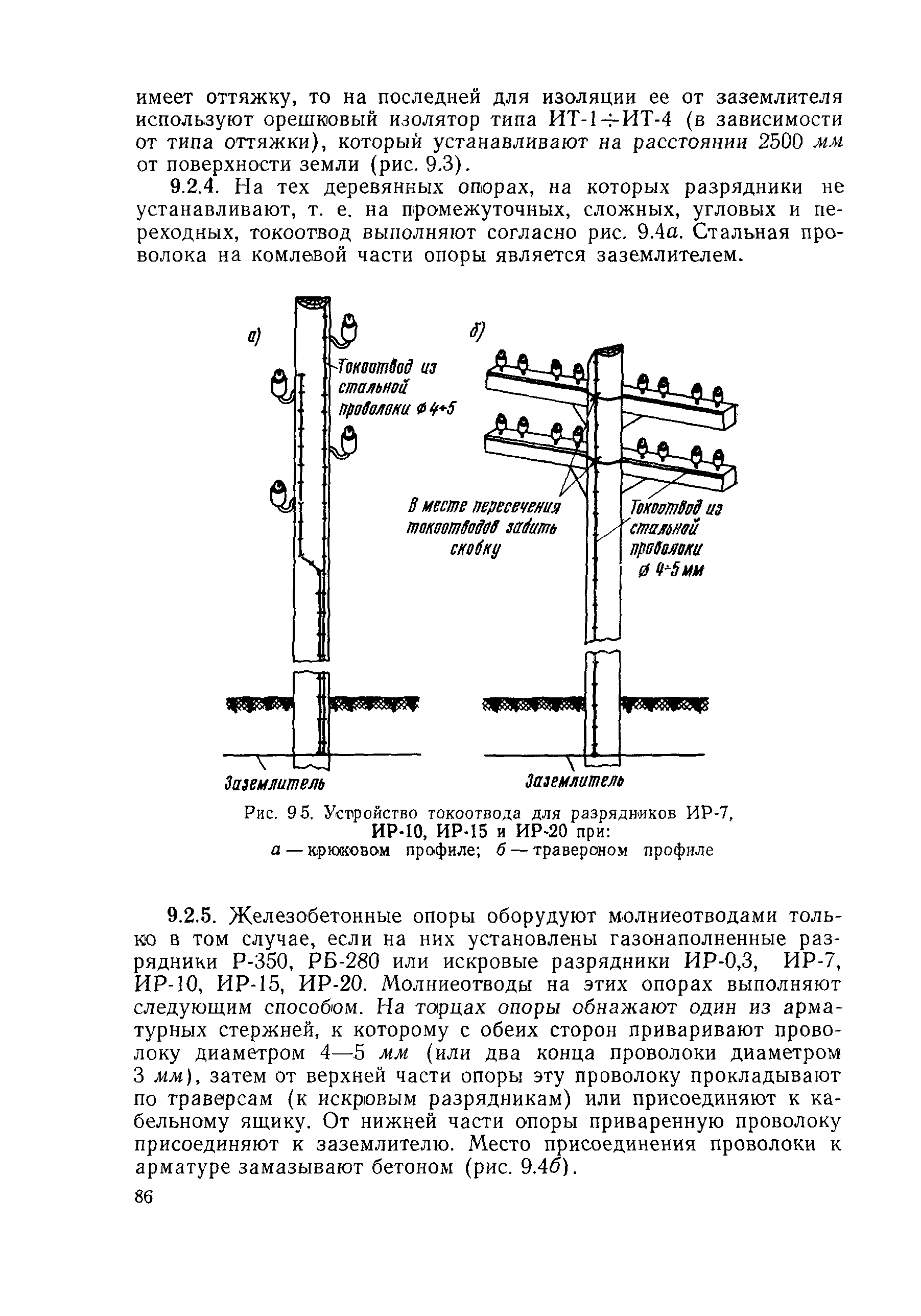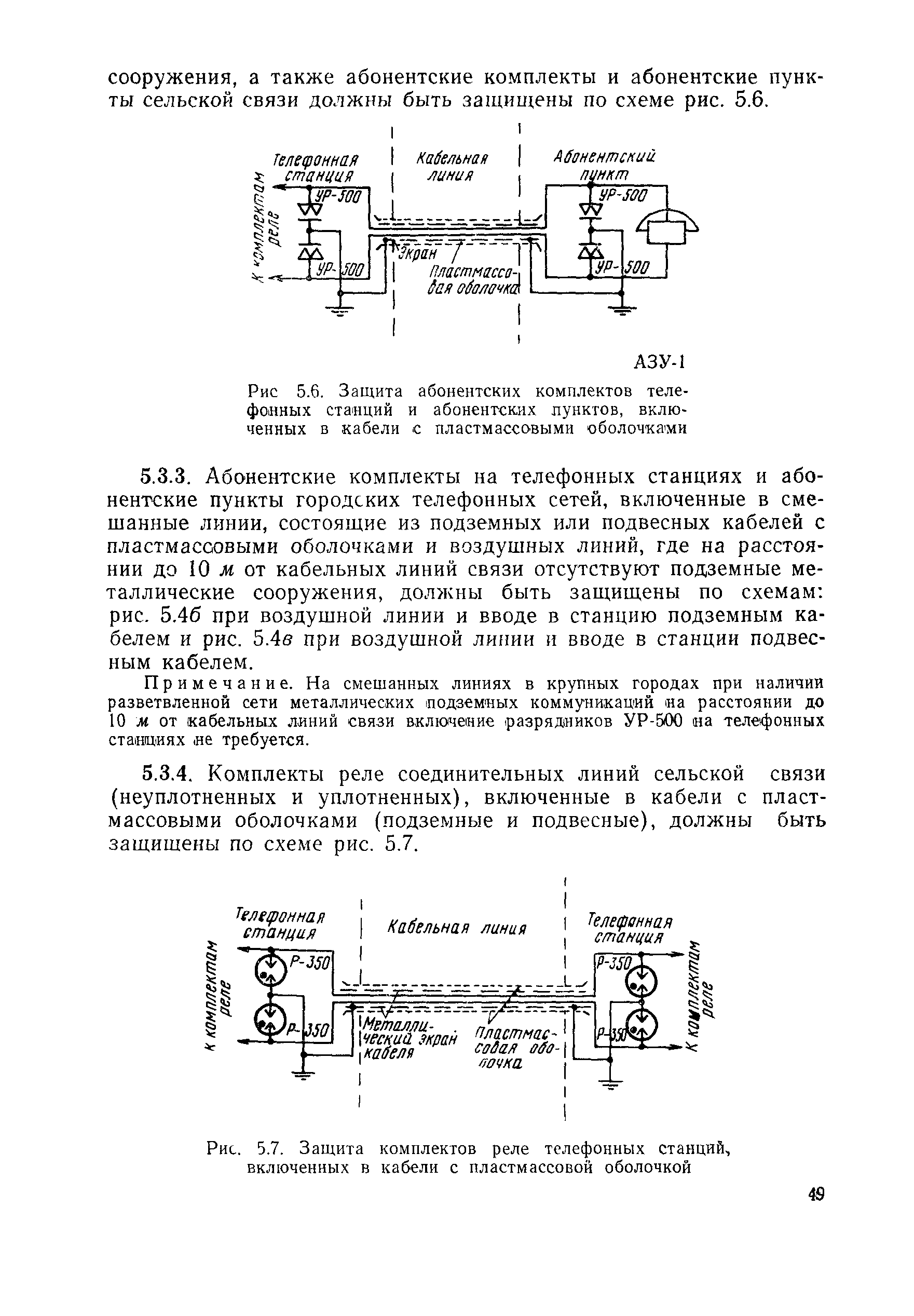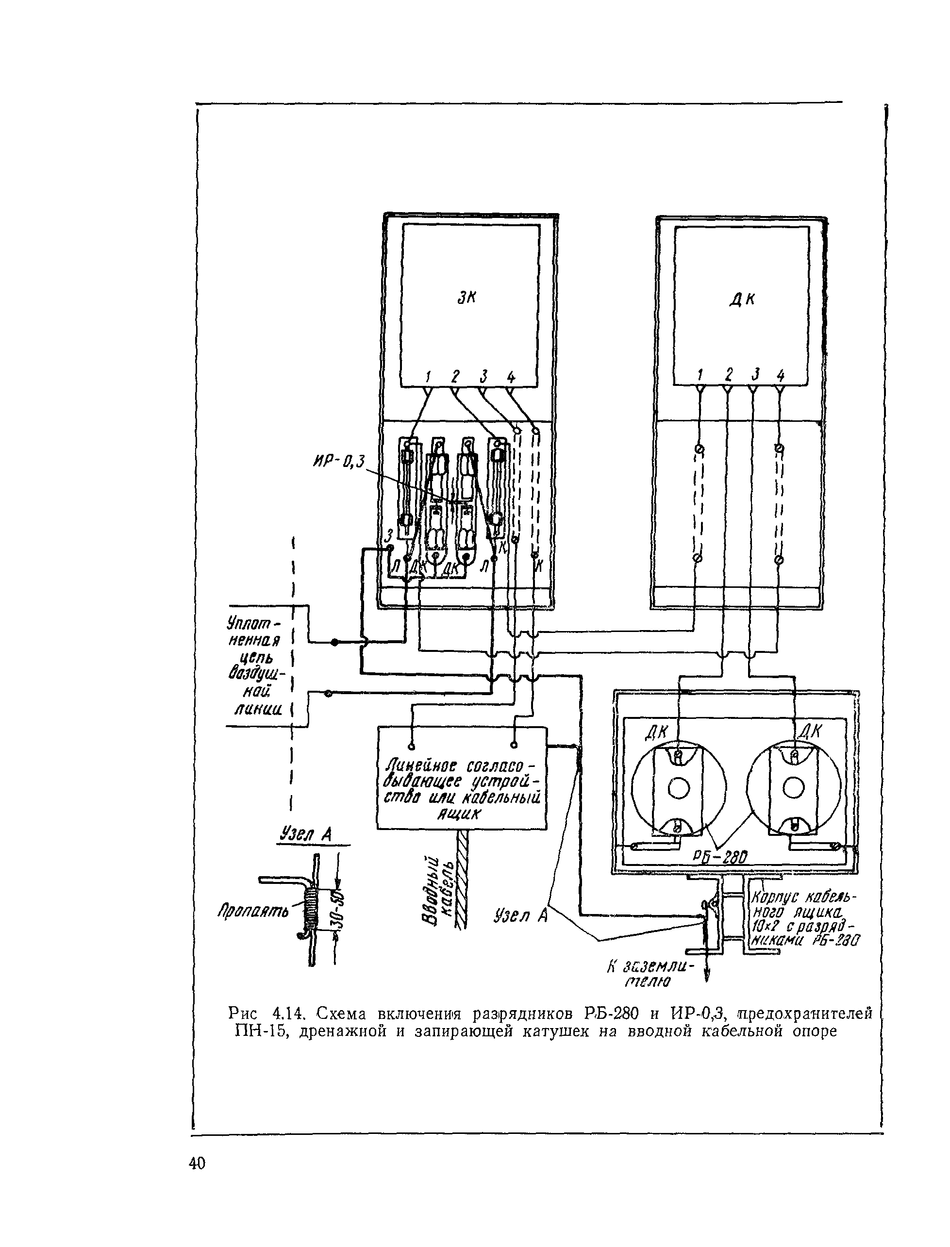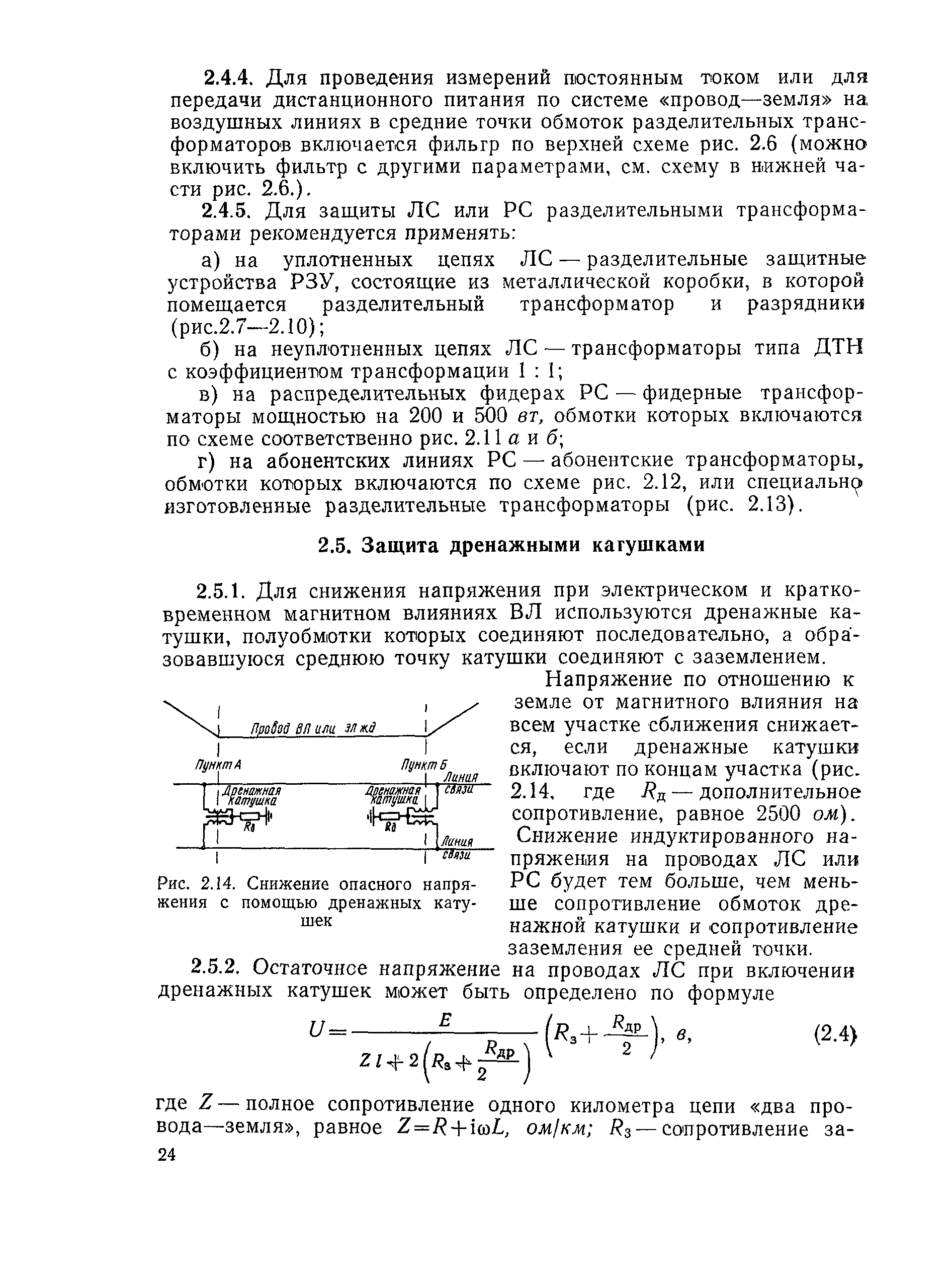 | Оглавление: | Предисловие 1. Опасные напряжения на проводах линий связи и радиотрансляционных сетей 1.1. Источники опасных напряжений. Некоторые понятия и определения 1.2. Индуктивное влияние высоковольтных воздушных линий электропередач и контактных сетей электрических железных дорог переменного тока 1.3. Влияние грозовых разрядов 1.4. Опасные напряжения на проводах ЛС и РС при непосредственном касании с проводами электрической силовой сети 2. Меры защиты от опасного влияния ВЛ и эл. Ж. д. 2.1. Меры, применяемые для защиты от влияния ВЛ и эл.ж.д 2.2. Относ воздушных линий от ВЛ и эл. ж.д. на критические расстояния 2.3. Защита специальными разрядниками 2.4. Защита разделительными трансформаторами 2.5. Защита дренажными катушками 2.6. Защита заземленными тросами из цветных металлов 2.7. Защита отсасывающими трансформаторами 2.8. Частичная или полная замена воздушных линий кабельными 3. Меры защиты от опасных напряжений, возникающих при грозовых разрядах и при соприкосновениях проводов ЛС (РС) с ВЛ напряжением до 600 В и эл. Ж. д. постоянного тока 3.1. Меры защиты от опасных напряжений, возникающих при грозовых разрядах 3.2. Меры защиты от опасных напряжений и токов, возникающих при соприкосновениях проводов ЛС (РС) с ВЛ напряжением до 600 В и эл.ж.д. постоянного тока 4. Защита установок междугородной проводной связи 4.1. Включение искровых разрядников на подходе воздушных линий к станции и УП 4.2. Схемы защиты на вводе воздушных линий связи при отсутствии опасного влияния ВЛ 4.3. Схемы защиты на вводе воздушных линий связи при наличии опасного влияния ВЛ 4.4. Включение элементов защиты 4.5. Защита установок избирательной железнодорожной связи 5. Защита установок проводной связи городских и сельских телефонных сетей и сетей местной железнодорожной связи 5.1. Включение искровых разрядников на подходе воздушных линий к станции 5.2. Схемы защиты на вводе воздушных линий и кабелей с металлической оболочкой при отсутствии опасного влияния ВЛ 5.3. Схемы защиты на вводе кабелей с пластмассовой оболочкой 5.4. Включение элементов защиты 6. Защита абонентов и установок проводного вещания 6.1. Защита оборудования, подключенного к фидерным магистральным линиям 6.2. Защита оборудования на фидерных цепях РС, подвешенных на опорах линий электропередачи напряжением 3/10 Кв 6.3. Защита оборудования с включенными фидерными распределительными линиями РС напряжением до 120 В 6.4. Защита оборудования с включенными фидерными распределительными линиями РС напряжением 240 и 340 В 6.5. Защита абонентов и оборудования на абонентских линиях напряжением 15 и 30 В 6.6. Защита кабельных вставок и катушек пупинизации 6.7. Защита аппаратуры на вводе приемных антенн 6.8. Дополнительная защита на фидерных цепях напряжением 480/2000 В 6.9. Включение элементов защиты 7. Защита на участках пересечения линий связи и РС с ВЛ 7.1. Защита при пересечении линий связи или РС с ВЛ напряжением до 1000 В 7.2. Защита при пересечении линий связи или РС с ВЛ напряжением выше 1000 В 8. Заземление 8.1. Нормы сопротивления заземлений 8.2. Устройство заземлений 8.3. Устройство заземлений в грунтах с высоким удельным сопротивлением 9. Защита опор разрушения при прямых ударах молнии 9.1. Общие указания 9.2. Защита деревянных опор воздушных линий связи и РС при помощи молниеотводов Приложение 1. Приборы защиты Приложение 2. Расчетные формулы для определен
