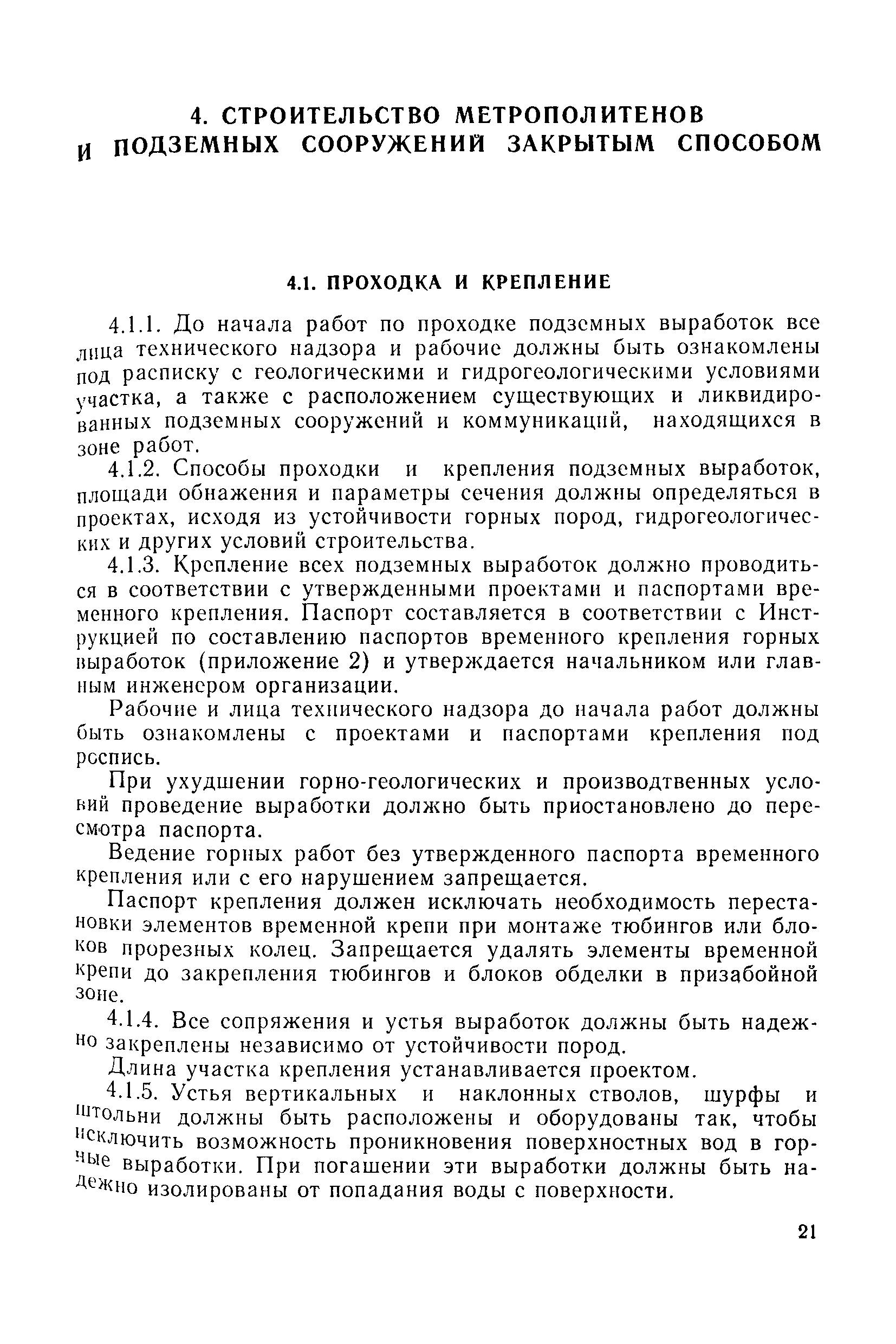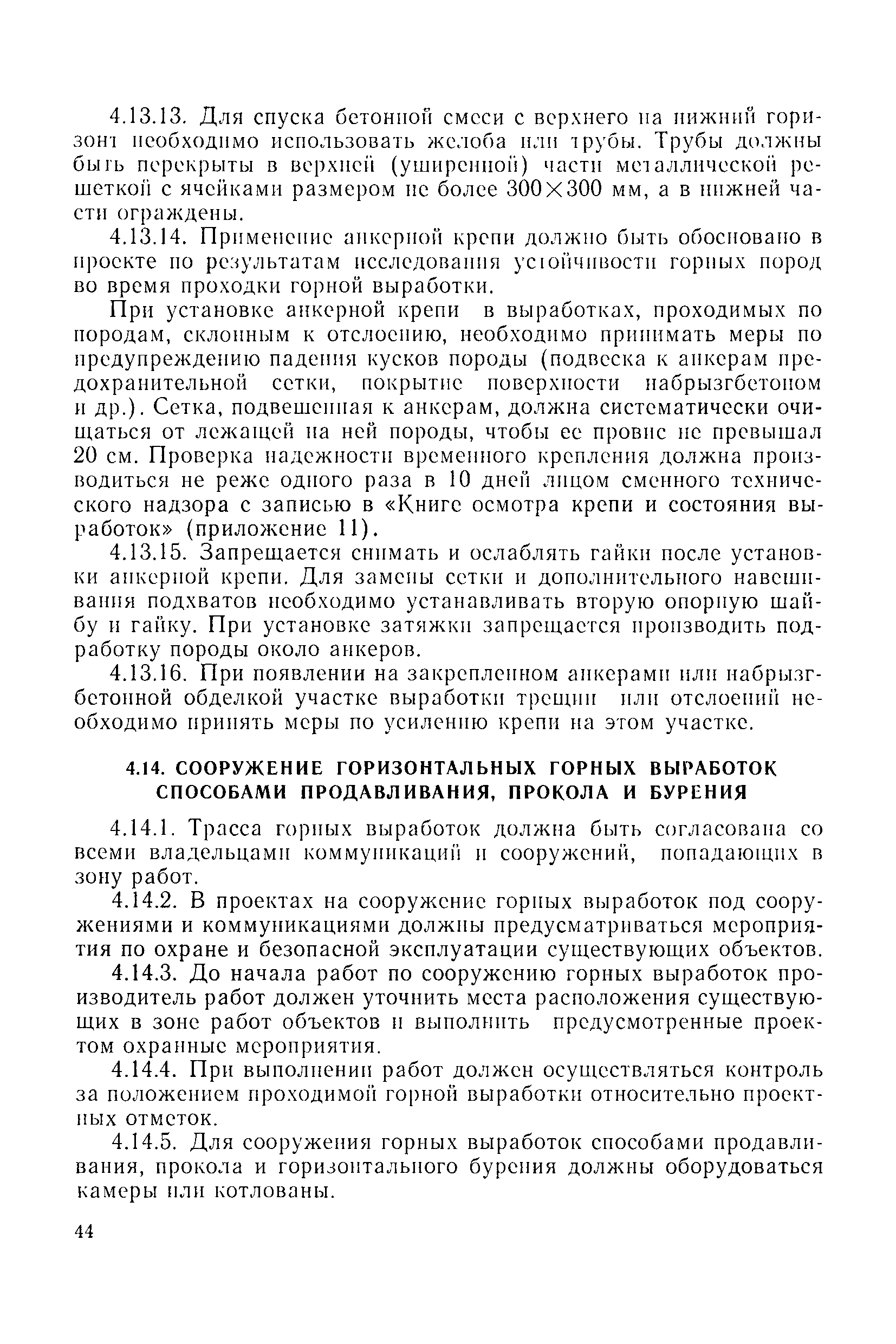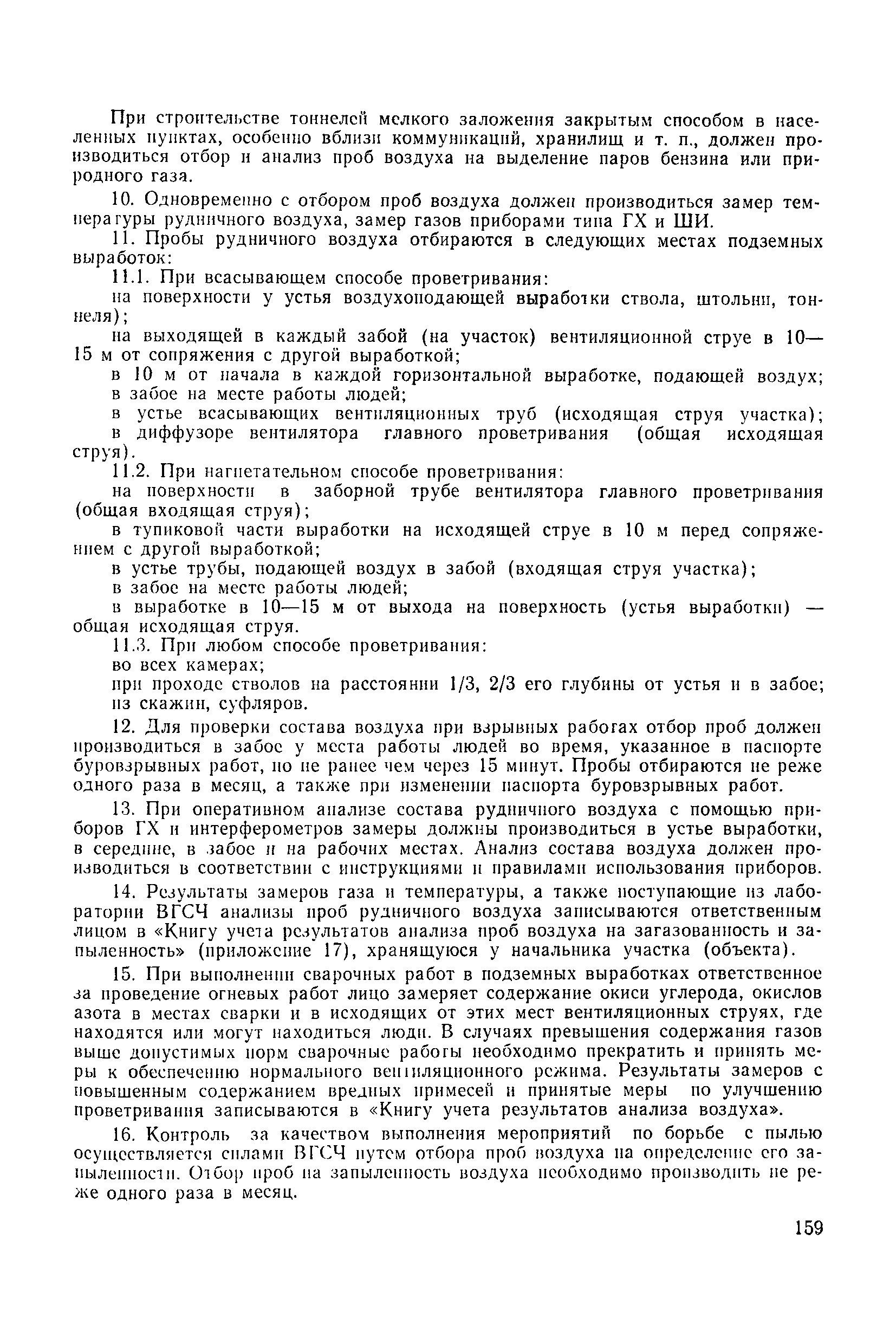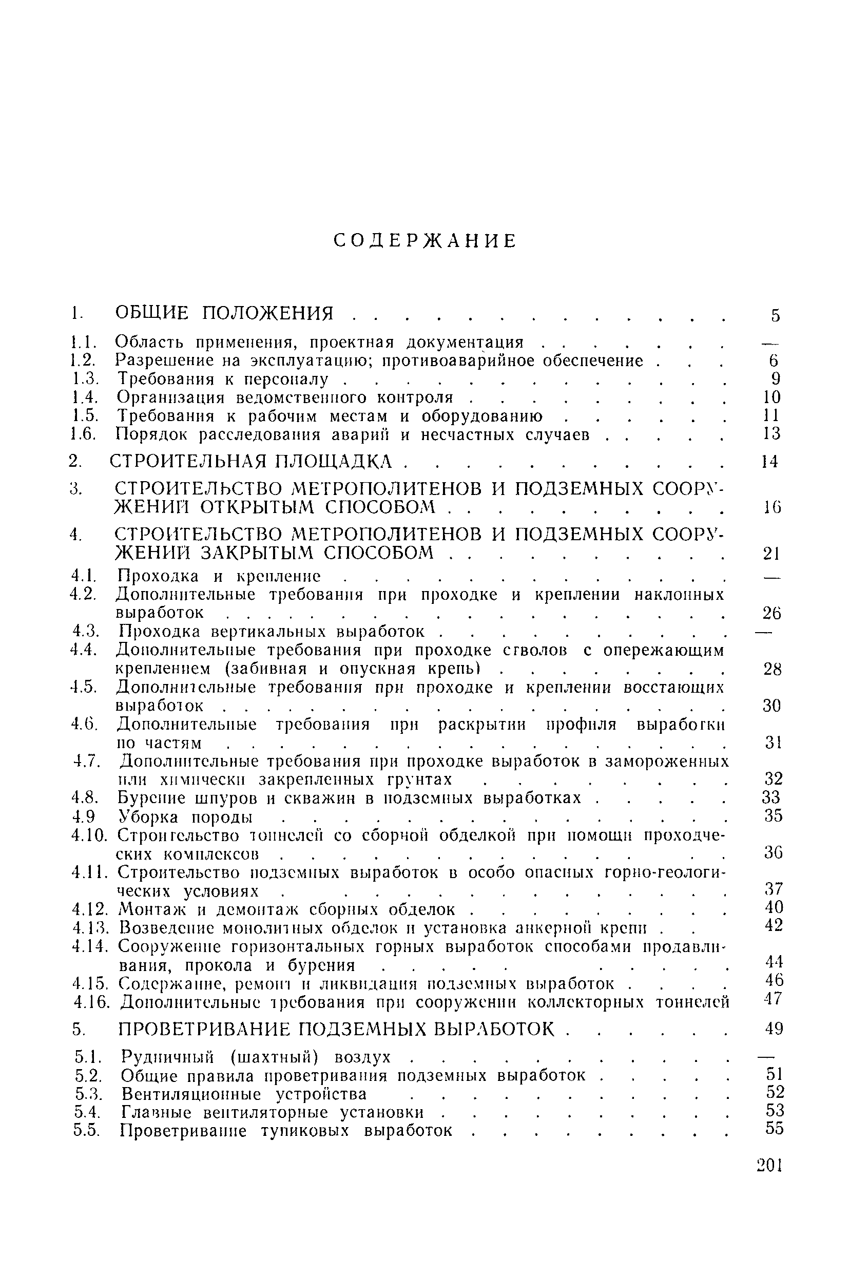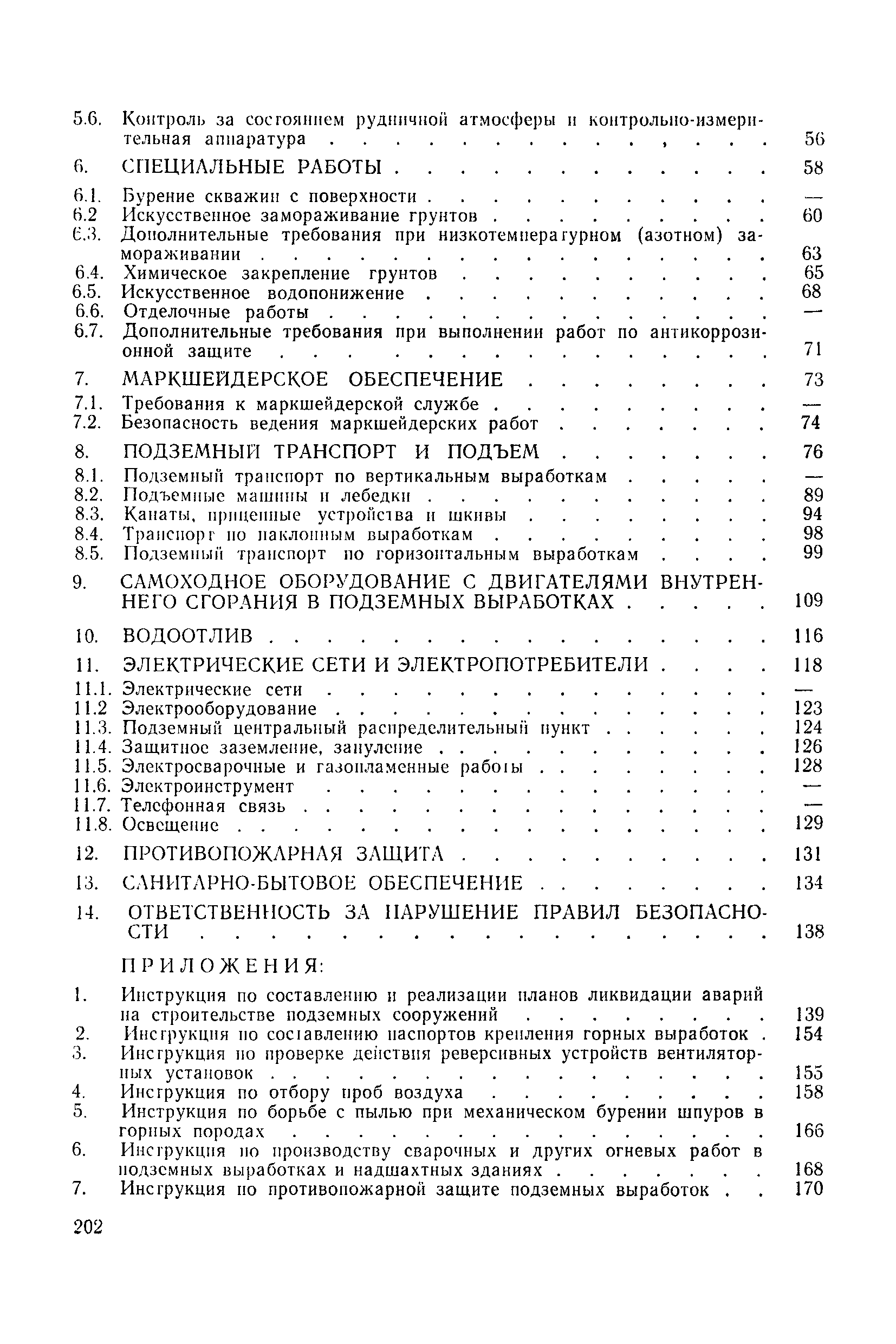 | Оглавление: | 1 Общие положения 1.1 Область применения, проектная документация 1.2 Разрешение на эксплуатацию; противоаварийное обеспечение 1.3 Требования к персоналу 1.4 Организация ведомственного контроля 1.5 Требования к рабочим местам и оборудованию 1.6 Порядок расследования аварий и несчастных случаев 2 Строительная площадка 3 Строительство метрополитенов и подземных сооружений открытым способом 4 Строительство метрополитенов и подземных сооружений закрытым способом 4.1 Проходка и крепление 4.2 Дополнительные требования при проходке и креплении наклонных выработок 4.3 Проходка вертикальных выработок 4.4 Дополнительные требования при проходке стволов с опережающим креплением (забивная и опускная крепь) 4.5 Дополнительные требования при проходке и креплении восстающих выработок 4.6 Дополнительные требования при раскрытии профиля выработок по частям 4.7 Дополнительные требования при проходке выработок в замороженных или химически закрепленных грунтах 4.8 Бурение шпуров и скважин в подземных выработках 4.9 Уборка породы 4.10 Строительство тоннелей со сборной обделкой при помощи проходческих комплексов 4.11 Строительство подземных выработок в особо опасных горно-геологических условиях 4.12 Монтаж и демонтаж сборных обделок 4.13 Возведение монолитных обделок и установка анкерной крепи 4.14 Сооружение горизонтальных горных выработок способами продавливания, прокола и бурения 4.15 Содержание, ремонт и ликвидация подземных выработок 4.16 Дополнительные требования при сооружении в коллекторных тоннелей 5 Проветривание подземных выработок 5.1 Рудничный (шахтный) воздух 5.2 Общие правила проветривания подземных выработок 5.3 Вентиляционные устройства 5.4 Платные вентиляторные установки 5.5 Проветривание тупиковых выработок 5.6 Контроль за состоянием рудничной атмосферы и контрольно-измерительная аппаратура 6 Специальные работы 6.1 Бурение скважин с поверхности 6.2 Искусственное замораживание грунтов 6.3 Дополнительные требования при низкотемпературном (азотном) замораживании 6.4 Химическое закрепление грунтов 6.5 Искусственное водопонижение 6.6 Отделочные работы 6.7 Дополнительные требования при выполнении работ по антикоррозионной защите 7 Маркшейдерское обеспечение 7.1 Требования к маркшейдерской службе 7.2 Безопасность ведения маркшейдерских работ 8 Подземный транспорт и подъем 8.1 Подземный транспорт по вертикальным выработкам 8.2 Подъемные машины и лебедки 8.3 Канаты, прицепные устройства и шкивы 8.4 Транспорт по наклонным выработкам 8.5 Подземный транспорт по горизонтальным выработкам 9 Самоходное оборудование с двигателями внутреннего сгорания в подземных выработках 10 Водоотлив 11 Электрические сети и электропотребители 11.1 Электрические сети 11.2 Электрооборудование 11.3 Подземный центральный распределительный пункт 11.4 Защитное заземление, зануление 11.5 Электросварочные и газопламенные работы 11.6 Электроинструмент 11.7 Телефонная связь 11.8 Освещение 12 Противопожарная защита 13 Санитарно-бытовое обеспечение 14 Ответственность за нарушение правил безопасности Приложение 1. Инструкция по составлению и реализации планов ликвидации аварий на строительстве подземных сооружений Приложение 2. Инструкция по составлению паспортов крепления горных выработок Инструкция 3. Инструкция по проверке действия реверсивных устройств вентиляторных ус