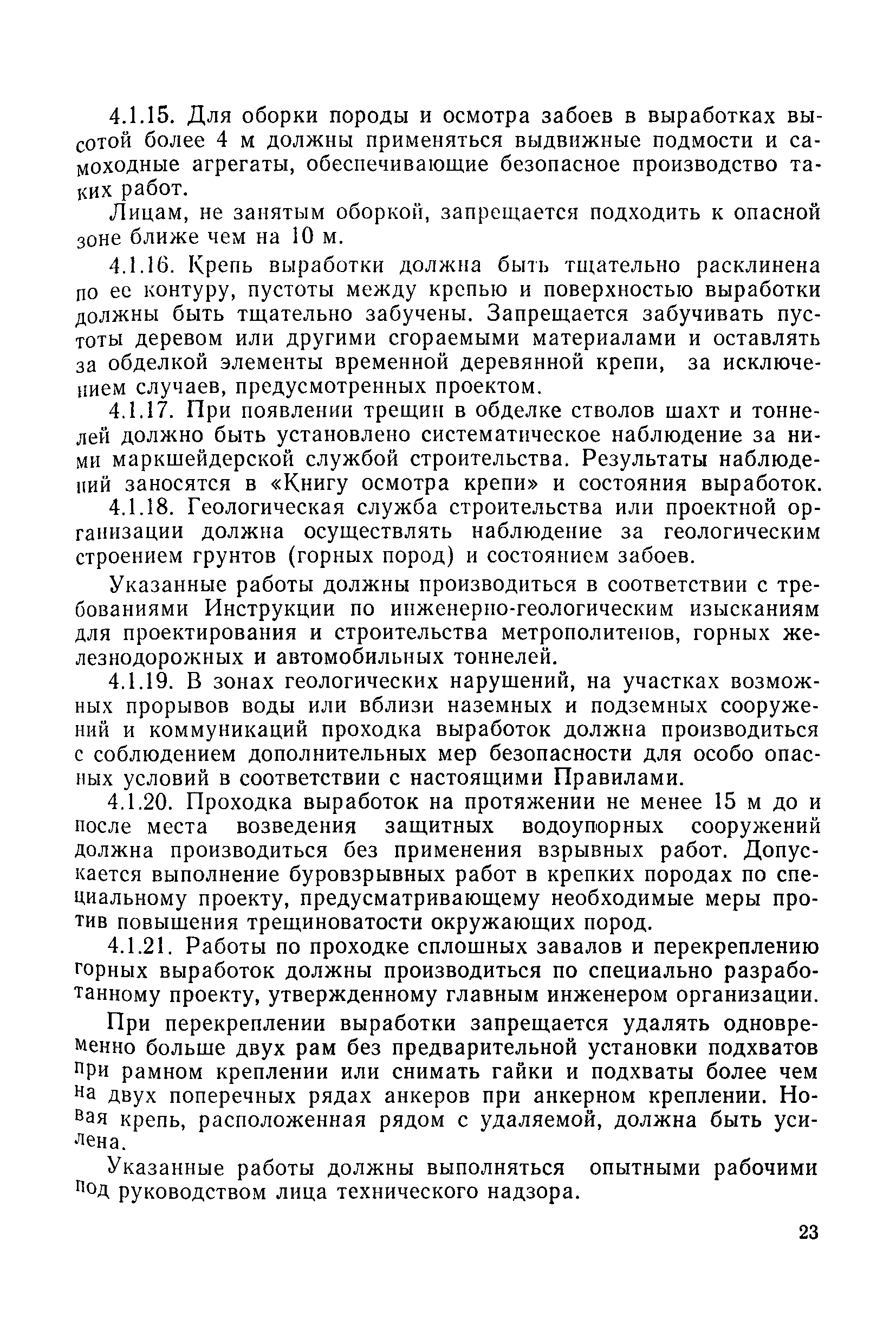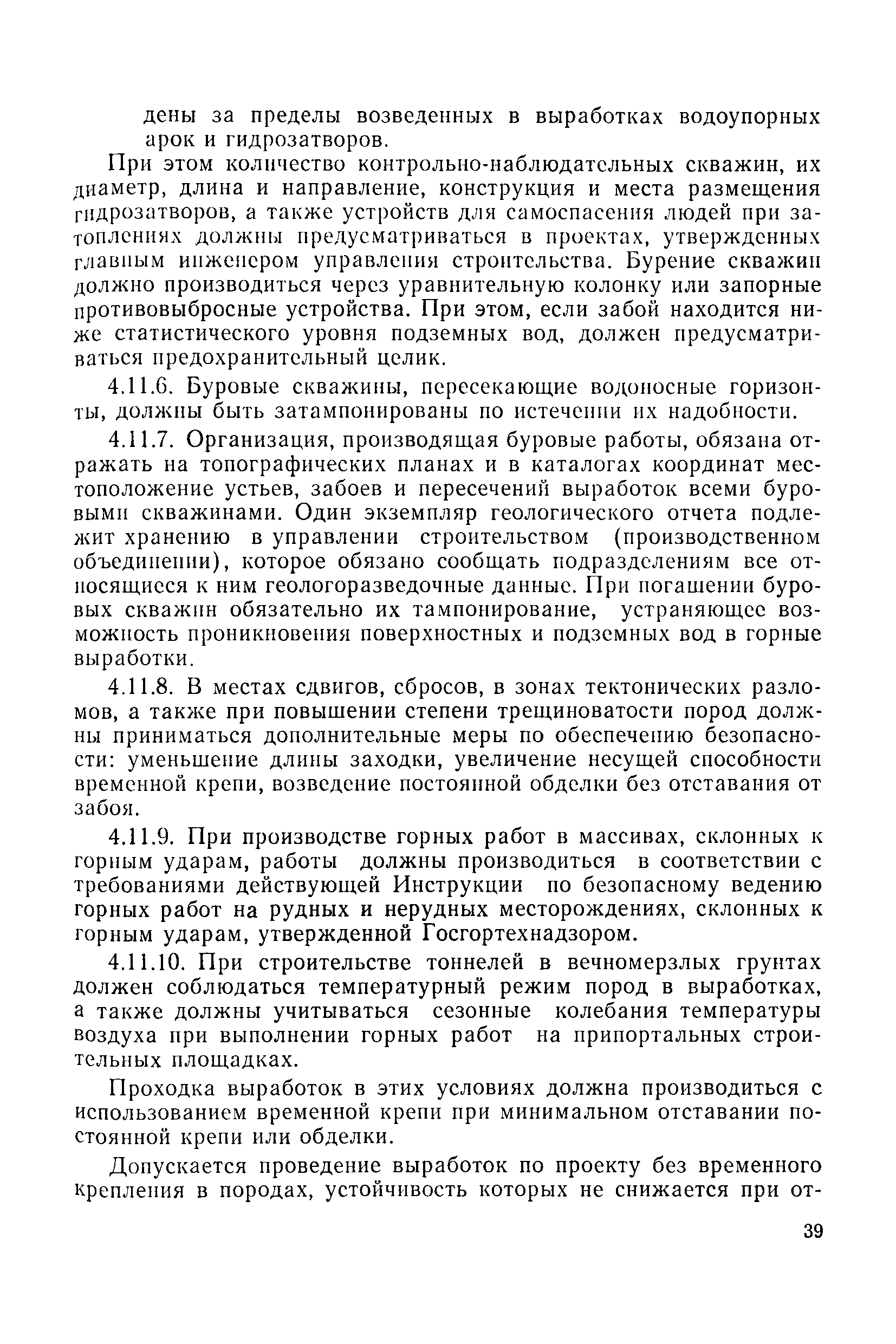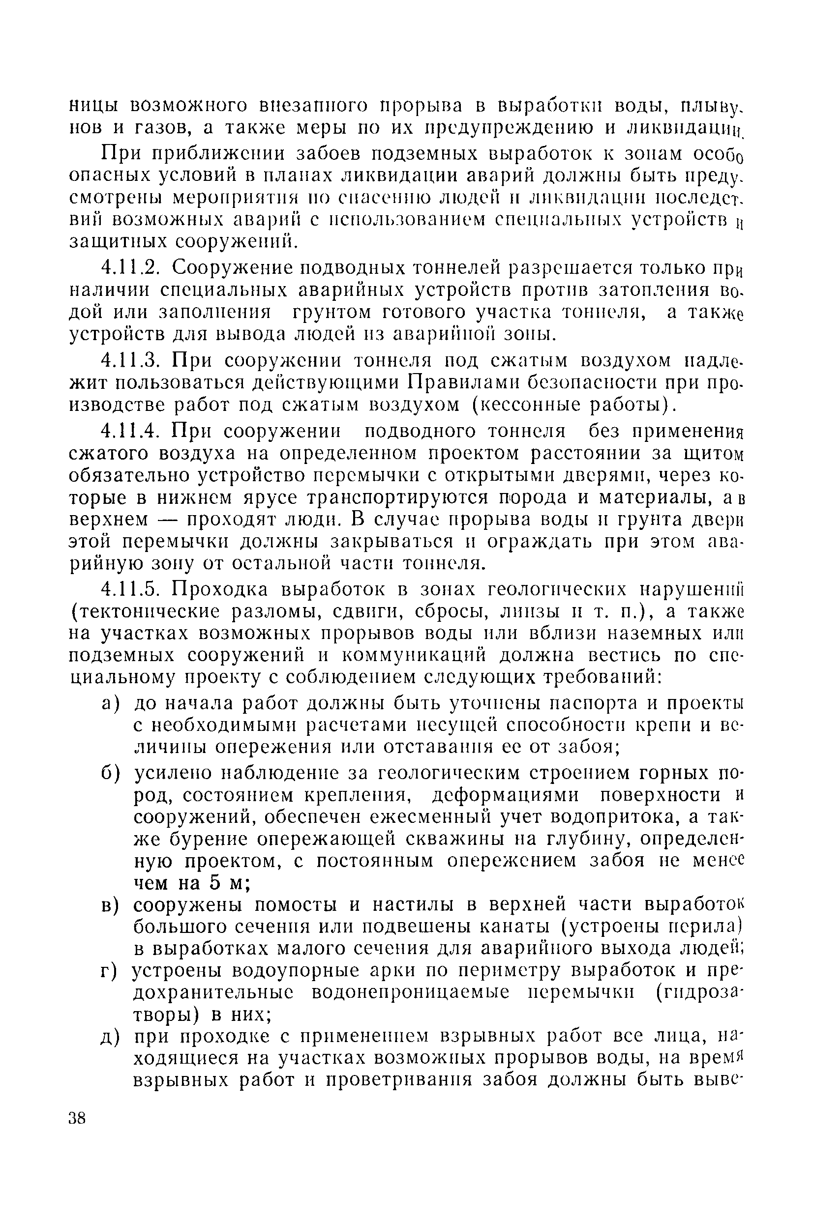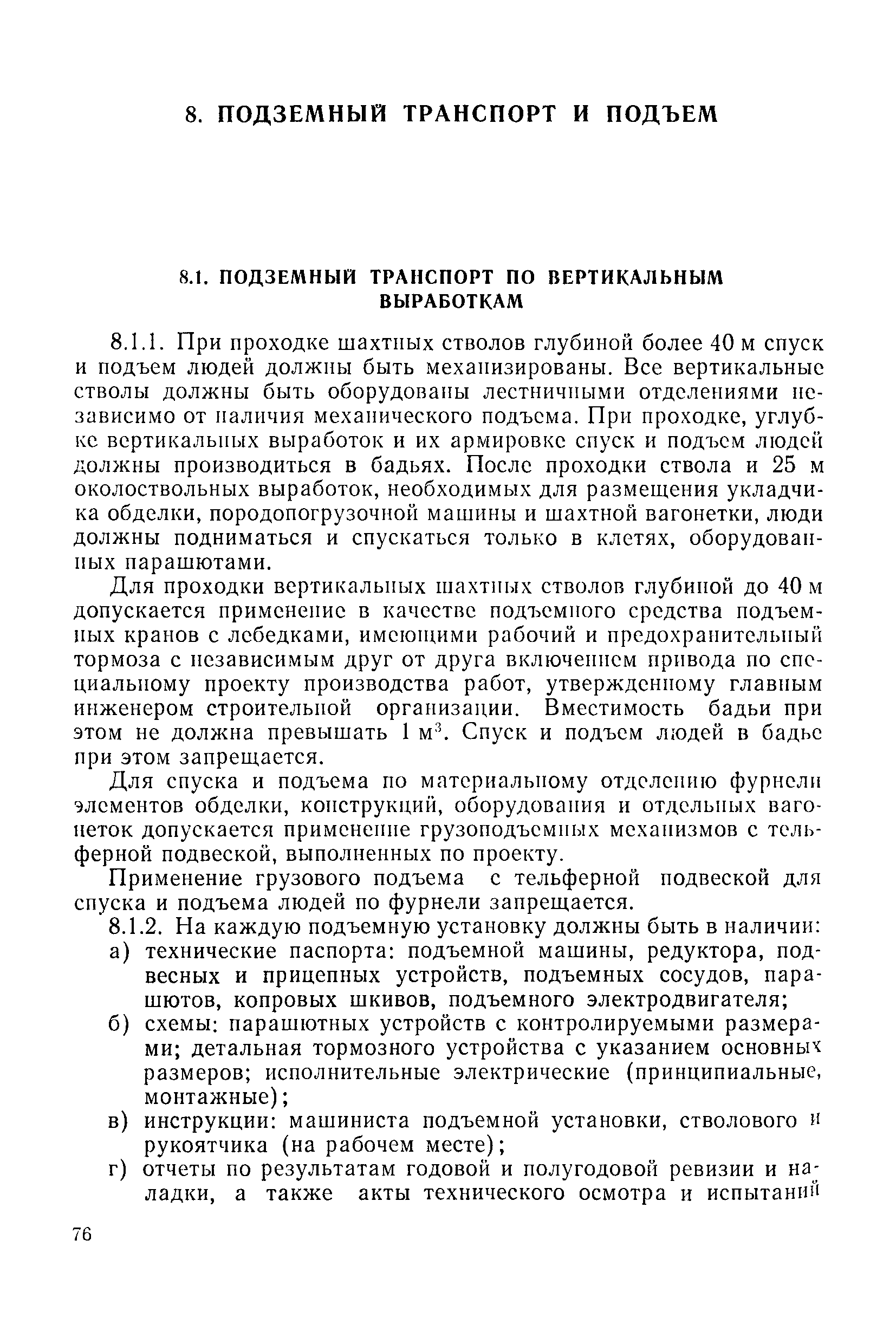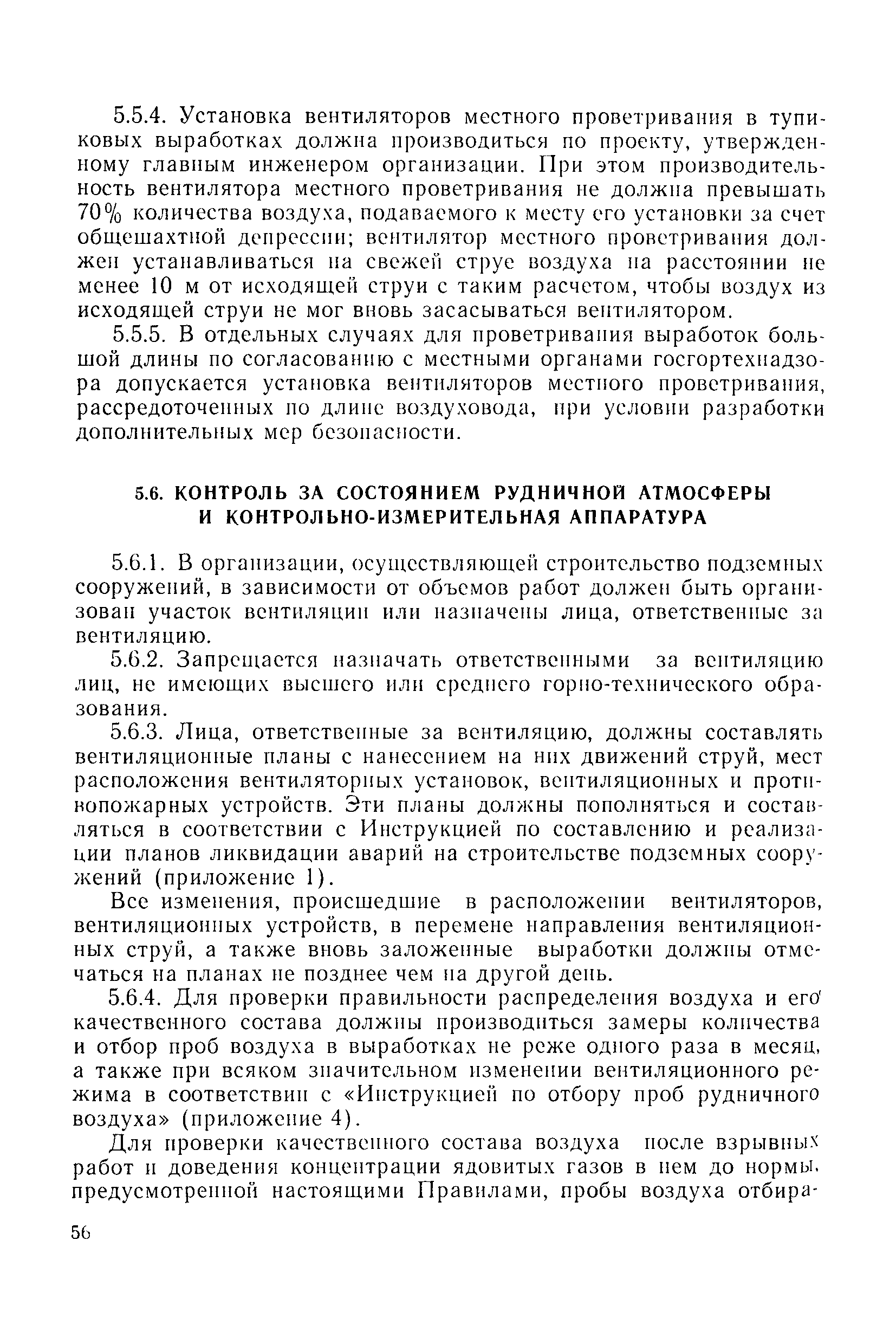 | Оглавление: | 1 Общие положения 1.1 Область применения, проектная документация 1.2 Разрешение на эксплуатацию; противоаварийное обеспечение 1.3 Требования к персоналу 1.4 Организация ведомственного контроля 1.5 Требования к рабочим местам и оборудованию 1.6 Порядок расследования аварий и несчастных случаев 2 Строительная площадка 3 Строительство метрополитенов и подземных сооружений открытым способом 4 Строительство метрополитенов и подземных сооружений закрытым способом 4.1 Проходка и крепление 4.2 Дополнительные требования при проходке и креплении наклонных выработок 4.3 Проходка вертикальных выработок 4.4 Дополнительные требования при проходке стволов с опережающим креплением (забивная и опускная крепь) 4.5 Дополнительные требования при проходке и креплении восстающих выработок 4.6 Дополнительные требования при раскрытии профиля выработок по частям 4.7 Дополнительные требования при проходке выработок в замороженных или химически закрепленных грунтах 4.8 Бурение шпуров и скважин в подземных выработках 4.9 Уборка породы 4.10 Строительство тоннелей со сборной обделкой при помощи проходческих комплексов 4.11 Строительство подземных выработок в особо опасных горно-геологических условиях 4.12 Монтаж и демонтаж сборных обделок 4.13 Возведение монолитных обделок и установка анкерной крепи 4.14 Сооружение горизонтальных горных выработок способами продавливания, прокола и бурения 4.15 Содержание, ремонт и ликвидация подземных выработок 4.16 Дополнительные требования при сооружении в коллекторных тоннелей 5 Проветривание подземных выработок 5.1 Рудничный (шахтный) воздух 5.2 Общие правила проветривания подземных выработок 5.3 Вентиляционные устройства 5.4 Платные вентиляторные установки 5.5 Проветривание тупиковых выработок 5.6 Контроль за состоянием рудничной атмосферы и контрольно-измерительная аппаратура 6 Специальные работы 6.1 Бурение скважин с поверхности 6.2 Искусственное замораживание грунтов 6.3 Дополнительные требования при низкотемпературном (азотном) замораживании 6.4 Химическое закрепление грунтов 6.5 Искусственное водопонижение 6.6 Отделочные работы 6.7 Дополнительные требования при выполнении работ по антикоррозионной защите 7 Маркшейдерское обеспечение 7.1 Требования к маркшейдерской службе 7.2 Безопасность ведения маркшейдерских работ 8 Подземный транспорт и подъем 8.1 Подземный транспорт по вертикальным выработкам 8.2 Подъемные машины и лебедки 8.3 Канаты, прицепные устройства и шкивы 8.4 Транспорт по наклонным выработкам 8.5 Подземный транспорт по горизонтальным выработкам 9 Самоходное оборудование с двигателями внутреннего сгорания в подземных выработках 10 Водоотлив 11 Электрические сети и электропотребители 11.1 Электрические сети 11.2 Электрооборудование 11.3 Подземный центральный распределительный пункт 11.4 Защитное заземление, зануление 11.5 Электросварочные и газопламенные работы 11.6 Электроинструмент 11.7 Телефонная связь 11.8 Освещение 12 Противопожарная защита 13 Санитарно-бытовое обеспечение 14 Ответственность за нарушение правил безопасности Приложение 1. Инструкция по составлению и реализации планов ликвидации аварий на строительстве подземных сооружений Приложение 2. Инструкция по составлению паспортов крепления горных выработок Инструкция 3. Инструкция по проверке действия реверсивных устройств вентиляторных ус