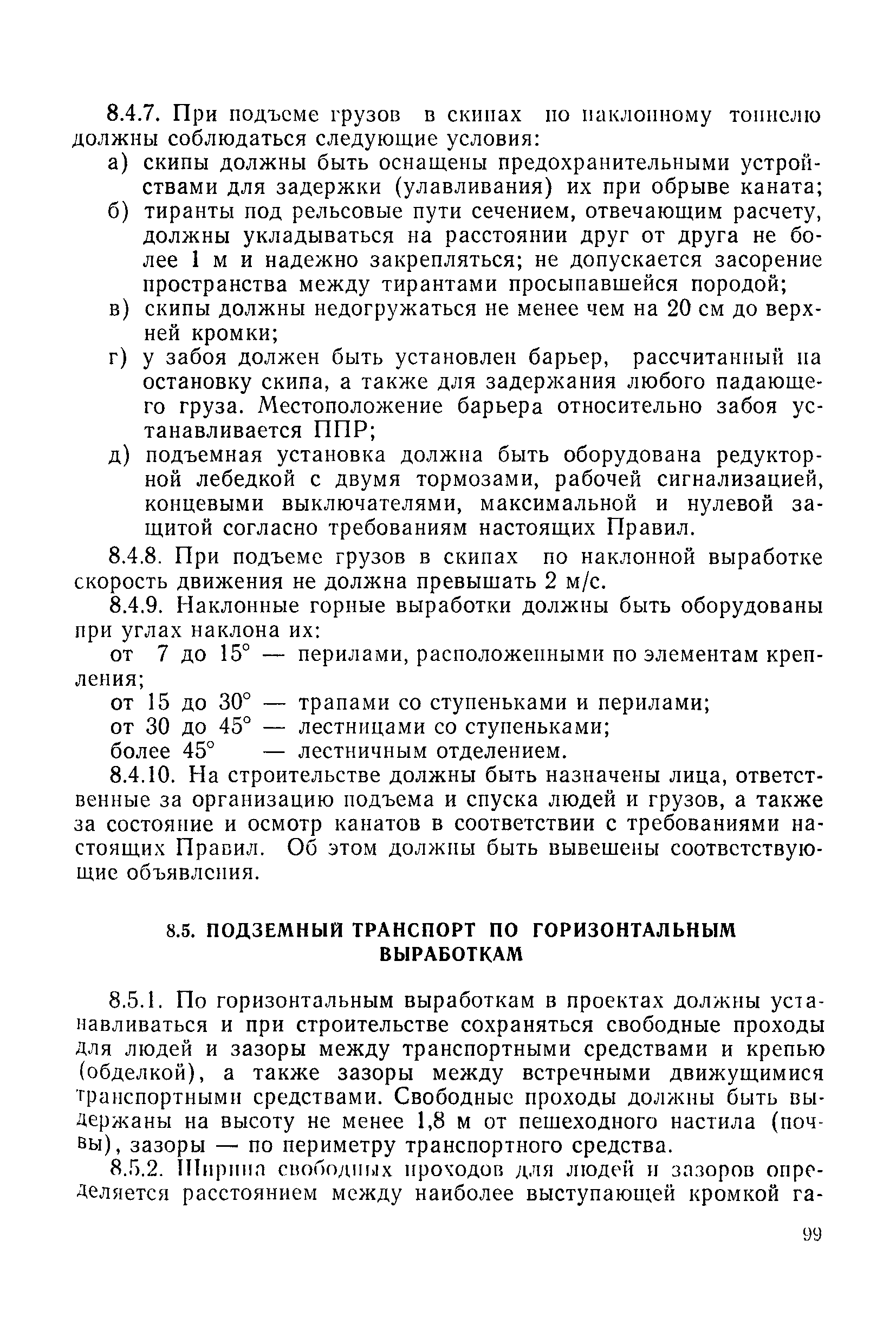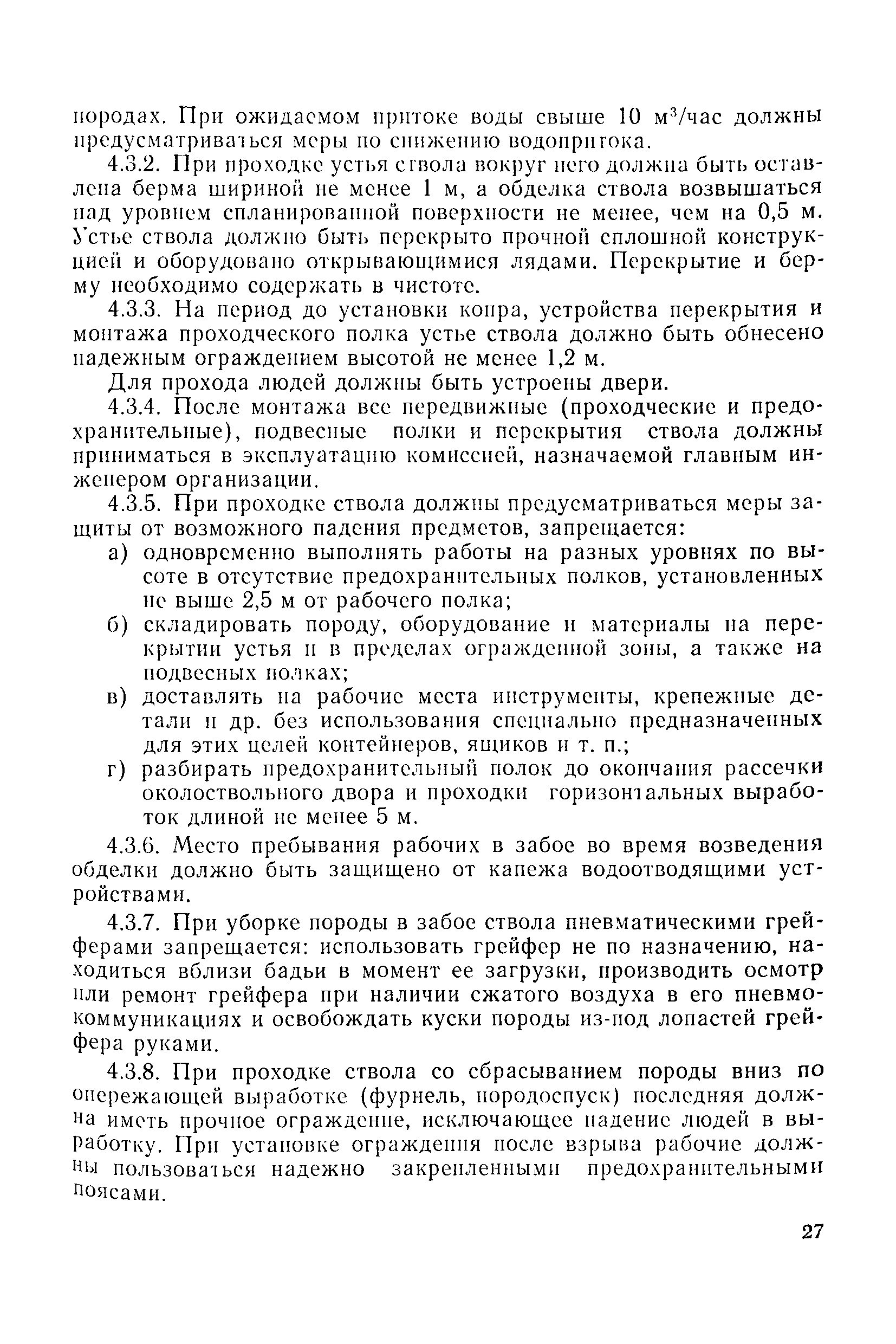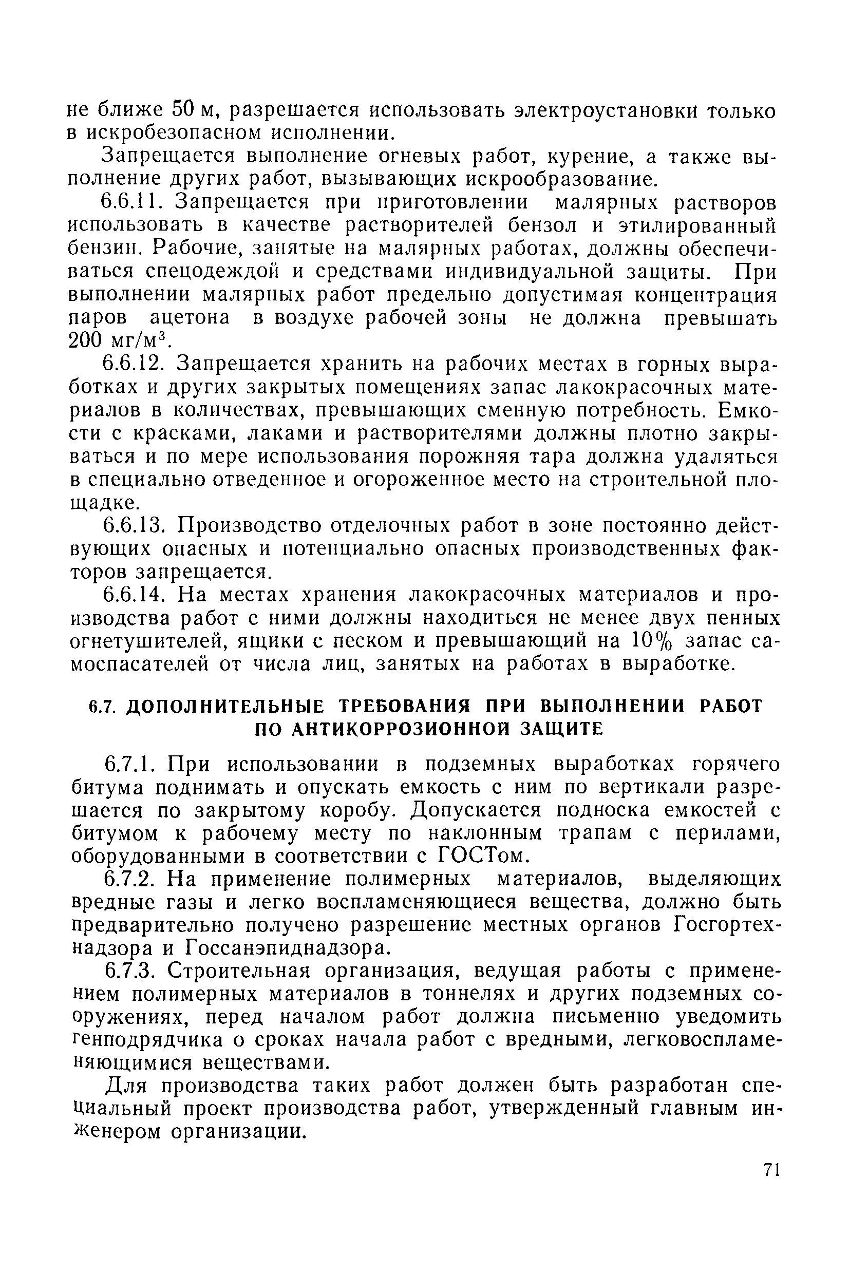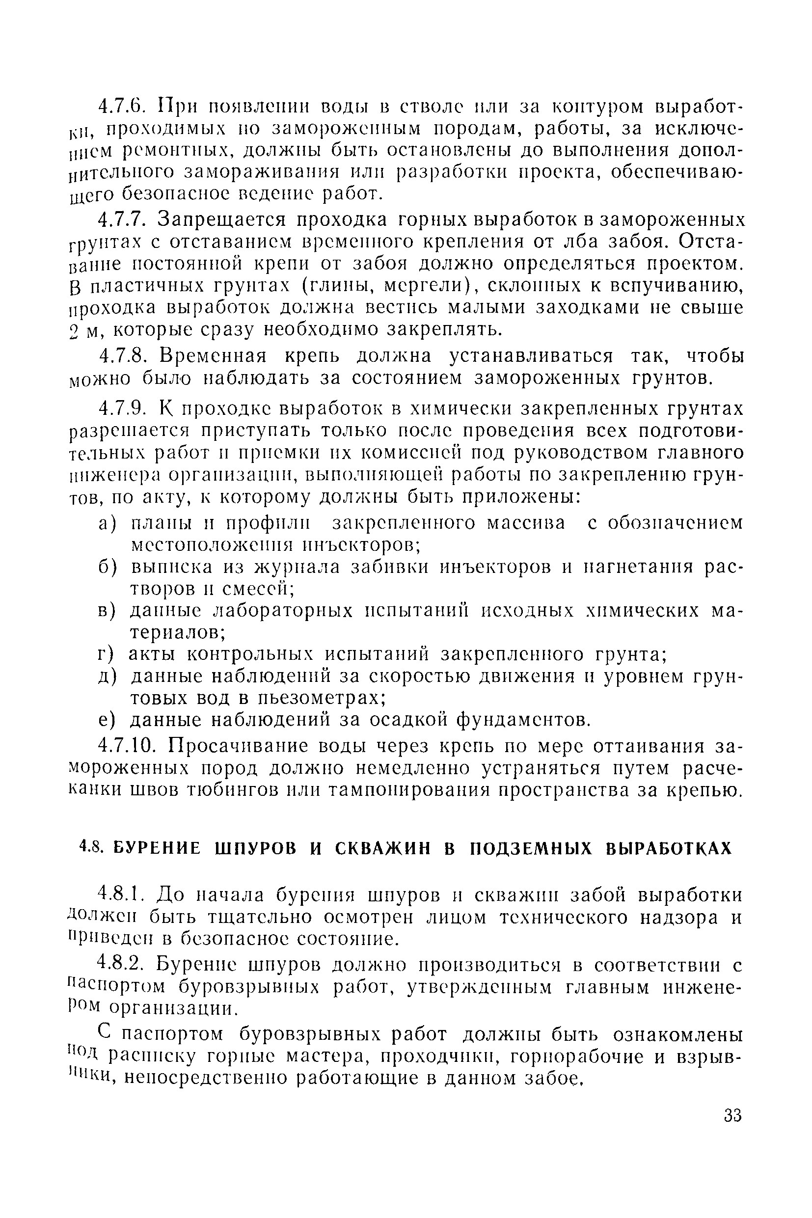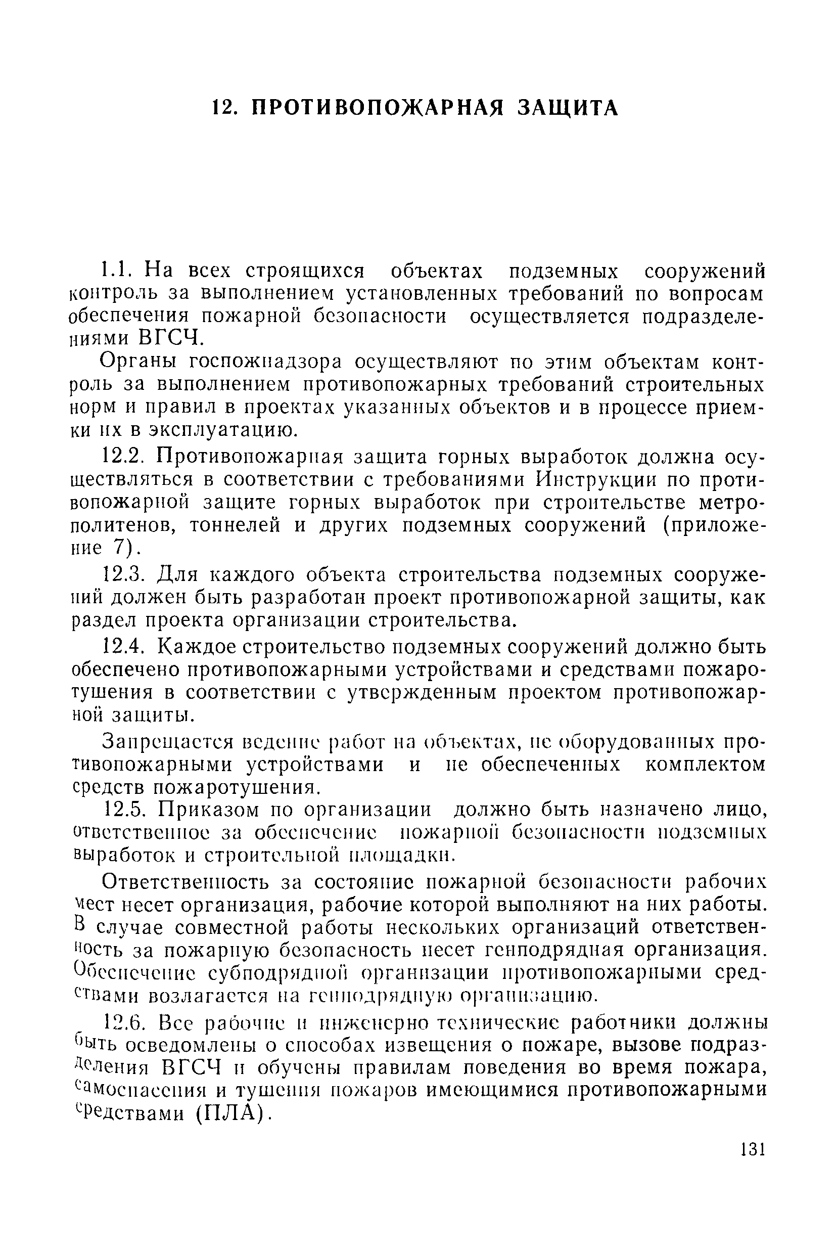 | Оглавление: | 1 Общие положения 1.1 Область применения, проектная документация 1.2 Разрешение на эксплуатацию; противоаварийное обеспечение 1.3 Требования к персоналу 1.4 Организация ведомственного контроля 1.5 Требования к рабочим местам и оборудованию 1.6 Порядок расследования аварий и несчастных случаев 2 Строительная площадка 3 Строительство метрополитенов и подземных сооружений открытым способом 4 Строительство метрополитенов и подземных сооружений закрытым способом 4.1 Проходка и крепление 4.2 Дополнительные требования при проходке и креплении наклонных выработок 4.3 Проходка вертикальных выработок 4.4 Дополнительные требования при проходке стволов с опережающим креплением (забивная и опускная крепь) 4.5 Дополнительные требования при проходке и креплении восстающих выработок 4.6 Дополнительные требования при раскрытии профиля выработок по частям 4.7 Дополнительные требования при проходке выработок в замороженных или химически закрепленных грунтах 4.8 Бурение шпуров и скважин в подземных выработках 4.9 Уборка породы 4.10 Строительство тоннелей со сборной обделкой при помощи проходческих комплексов 4.11 Строительство подземных выработок в особо опасных горно-геологических условиях 4.12 Монтаж и демонтаж сборных обделок 4.13 Возведение монолитных обделок и установка анкерной крепи 4.14 Сооружение горизонтальных горных выработок способами продавливания, прокола и бурения 4.15 Содержание, ремонт и ликвидация подземных выработок 4.16 Дополнительные требования при сооружении в коллекторных тоннелей 5 Проветривание подземных выработок 5.1 Рудничный (шахтный) воздух 5.2 Общие правила проветривания подземных выработок 5.3 Вентиляционные устройства 5.4 Платные вентиляторные установки 5.5 Проветривание тупиковых выработок 5.6 Контроль за состоянием рудничной атмосферы и контрольно-измерительная аппаратура 6 Специальные работы 6.1 Бурение скважин с поверхности 6.2 Искусственное замораживание грунтов 6.3 Дополнительные требования при низкотемпературном (азотном) замораживании 6.4 Химическое закрепление грунтов 6.5 Искусственное водопонижение 6.6 Отделочные работы 6.7 Дополнительные требования при выполнении работ по антикоррозионной защите 7 Маркшейдерское обеспечение 7.1 Требования к маркшейдерской службе 7.2 Безопасность ведения маркшейдерских работ 8 Подземный транспорт и подъем 8.1 Подземный транспорт по вертикальным выработкам 8.2 Подъемные машины и лебедки 8.3 Канаты, прицепные устройства и шкивы 8.4 Транспорт по наклонным выработкам 8.5 Подземный транспорт по горизонтальным выработкам 9 Самоходное оборудование с двигателями внутреннего сгорания в подземных выработках 10 Водоотлив 11 Электрические сети и электропотребители 11.1 Электрические сети 11.2 Электрооборудование 11.3 Подземный центральный распределительный пункт 11.4 Защитное заземление, зануление 11.5 Электросварочные и газопламенные работы 11.6 Электроинструмент 11.7 Телефонная связь 11.8 Освещение 12 Противопожарная защита 13 Санитарно-бытовое обеспечение 14 Ответственность за нарушение правил безопасности Приложение 1. Инструкция по составлению и реализации планов ликвидации аварий на строительстве подземных сооружений Приложение 2. Инструкция по составлению паспортов крепления горных выработок Инструкция 3. Инструкция по проверке действия реверсивных устройств вентиляторных ус