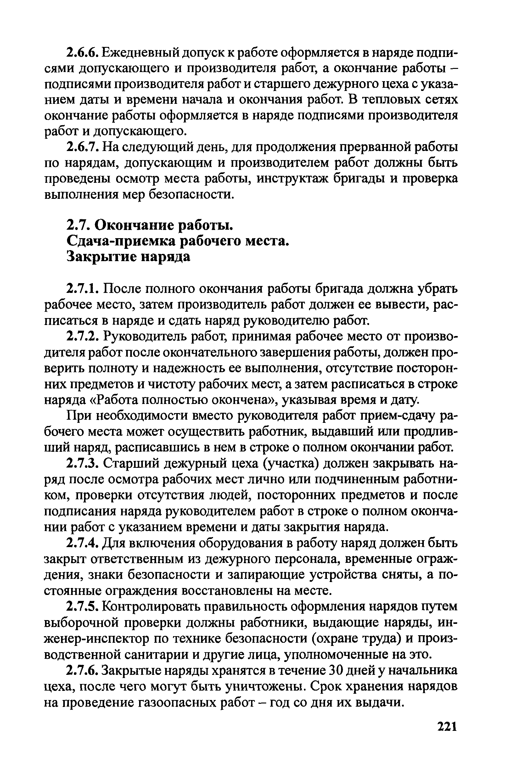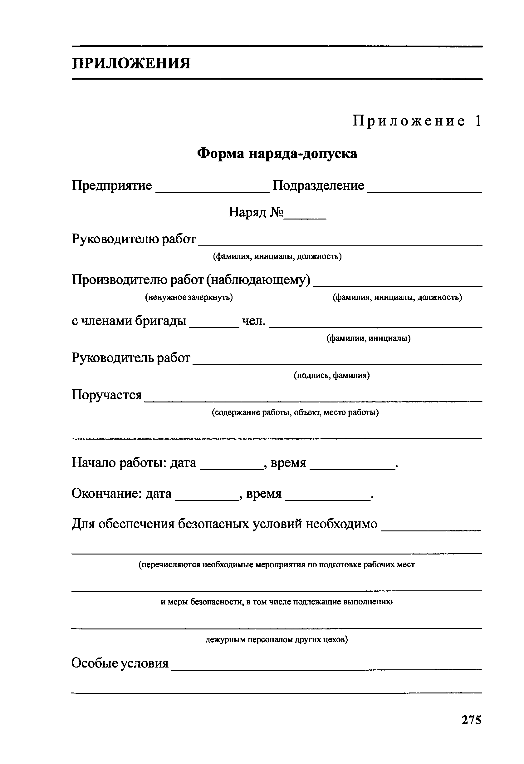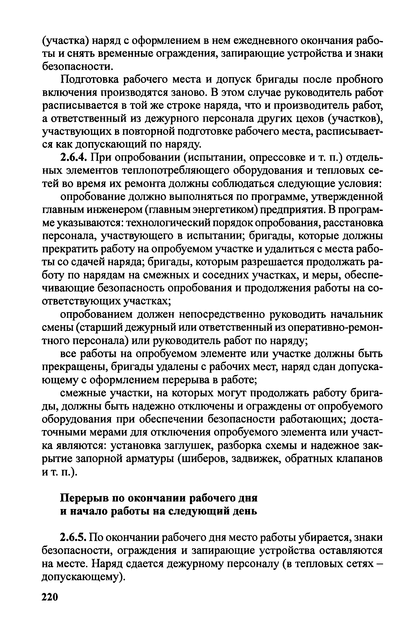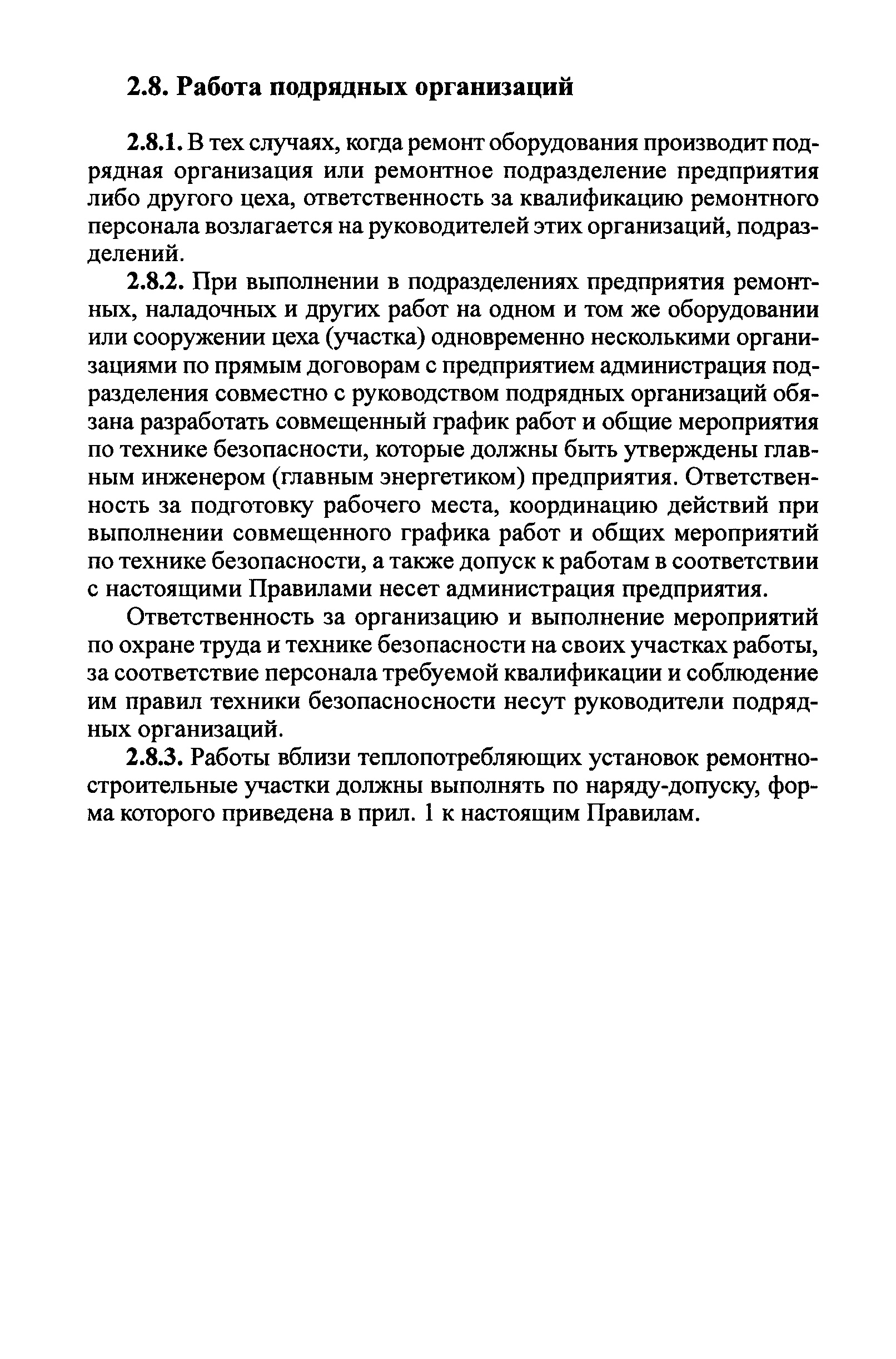 | Оглавление: | Предисловие 1 Общие положения 1.1 Область и порядок применения правил 1.2 Требования к персоналу 2 Организация мероприятия, обеспечивающие безопасность работ 2.1 Наряд, распоряжение 2.2 Ответственные за безопасность работ, их права и обязанности 2.3 Порядок выдачи и оформления наряда 2.4 Допуск бригады к работе 2.5 Надзор во время работы. Изменения в составе бригады 2.6 Оформление перерывов в работе 2.7 Окончание работы. Сдача-приемка рабочего места. Закрытие наряда 2.8 Работа подрядных организаций 3 Правила техники безопасности при выполнении отдельных работ 3.1 Территория, помещения и рабочие места 3.2 Требования к оборудованию 3.3 Обслуживание оборудования 3.4 Подъем и транспортирование тяжестей 3.5 Работа на высоте, с лесов, подмостей и других приспособлений 3.6 Сварочные работы и работы с паяльной лампой 3.7 Работа в подземных сооружениях и резервуарах 3.8 Обслуживание теплопотребляющих установок и трубопроводов 3.9 Ремонт вращающихся механизмов 3.10 Теплоизоляционные, антикоррозийные и окрасочные работы 3.11 Земляные работы 3.12 Обслуживание оборудования тепловых пунктов и тепловых сетей 3.13 Обслуживание приборов тепловой автоматики и измерений Приложение 1 Форма наряд-допуска Приложение 2 Журнал учета работ по нарядам и распоряжениям Приложение 3 Предельно допустимые концентрации вредных веществ в воздухе рабочей зоны (по ГОСТ 12.1.005-88) Приложение 4 Пределы воспламенения горючих газов в воздухе, % (по объему) Приложение 5 Знаки безопасности Приложение 6 Журнал приемки и осмотра лесов и подмостей Приложение 7 Характеристика взрывоопасных и вредных газов, наиболее часто встречающихся в резервуарах и подземных сооружениях Приложение 8 Постановление правительства Российской Федерации "О вредных и (или) опасных производственных факторах и работах, при выполнении которых проводятся предварительные и периодические медицинские осмотры (обследования), и порядке проведения этих осмотров (обследований)" Приказ Министерства здравоохранения и социального развития Российской Федерации от 16.08.2004 г. № 83 "Об утверждении перечней вредных и (или) опасных производственных факторах и работ, при выполнении которых проводятся предварительные и периодические медицинские осмотры (обследования), и порядке проведения этих осмотров (обследований)" Приложение 1 Перечень вредных и (или) опасных производственных факторах и работ, при выполнении которых проводятся предварительные и периодические медицинские осмотры (обследования) Приложение 2 Перечень работ, при выполнении которых проводятся предварительные и периодические медицинские осмотры (обследования) |