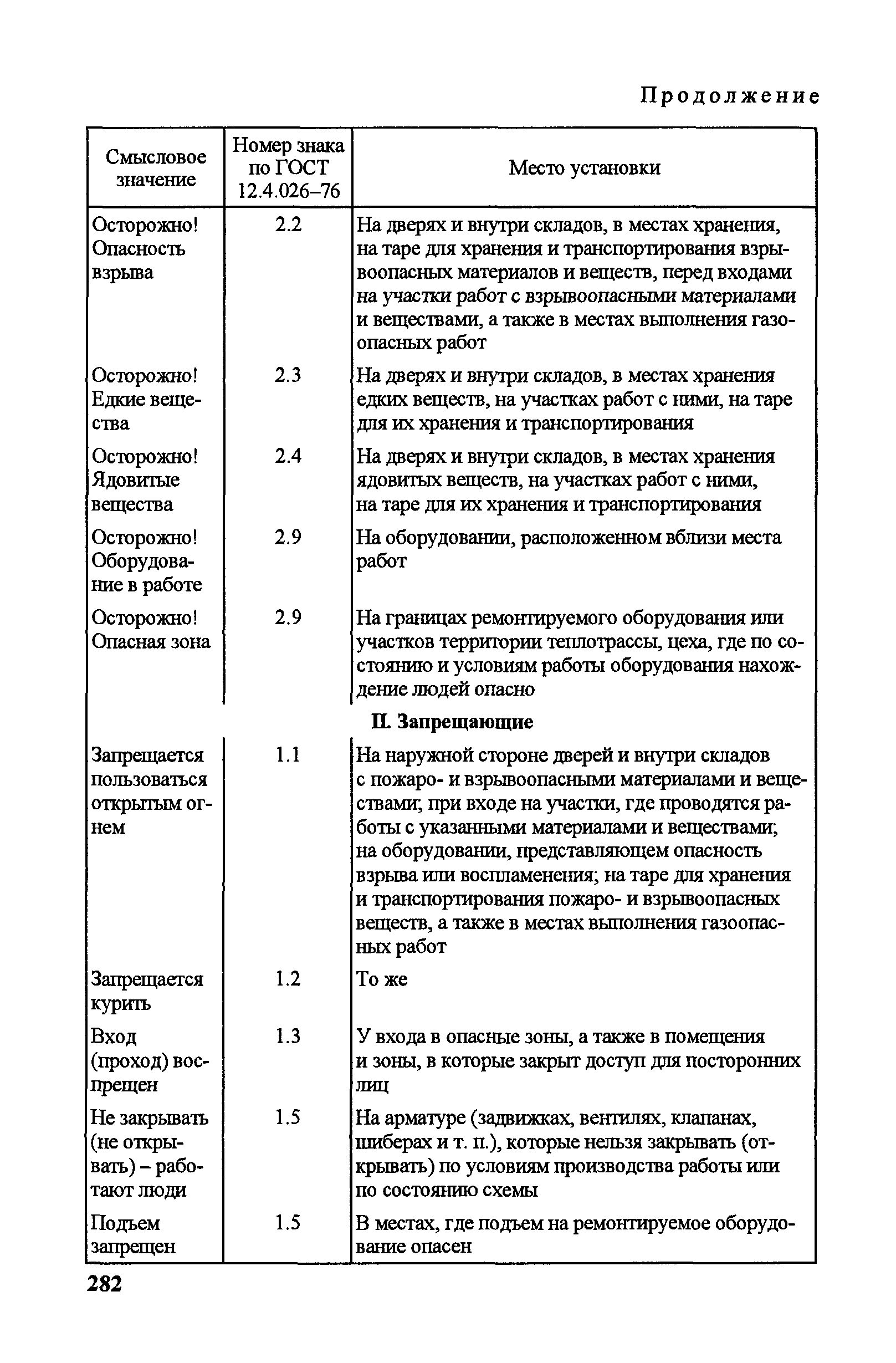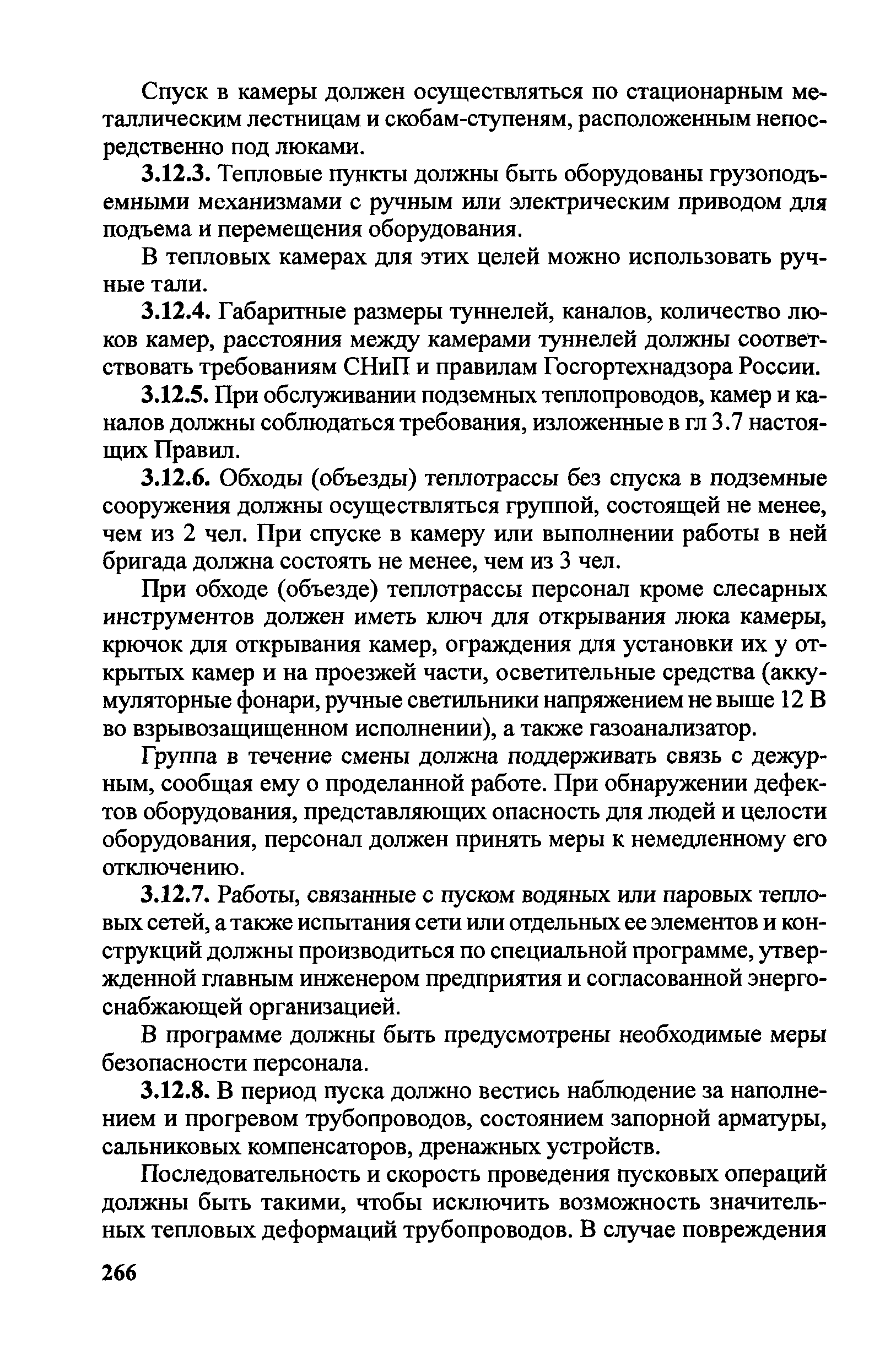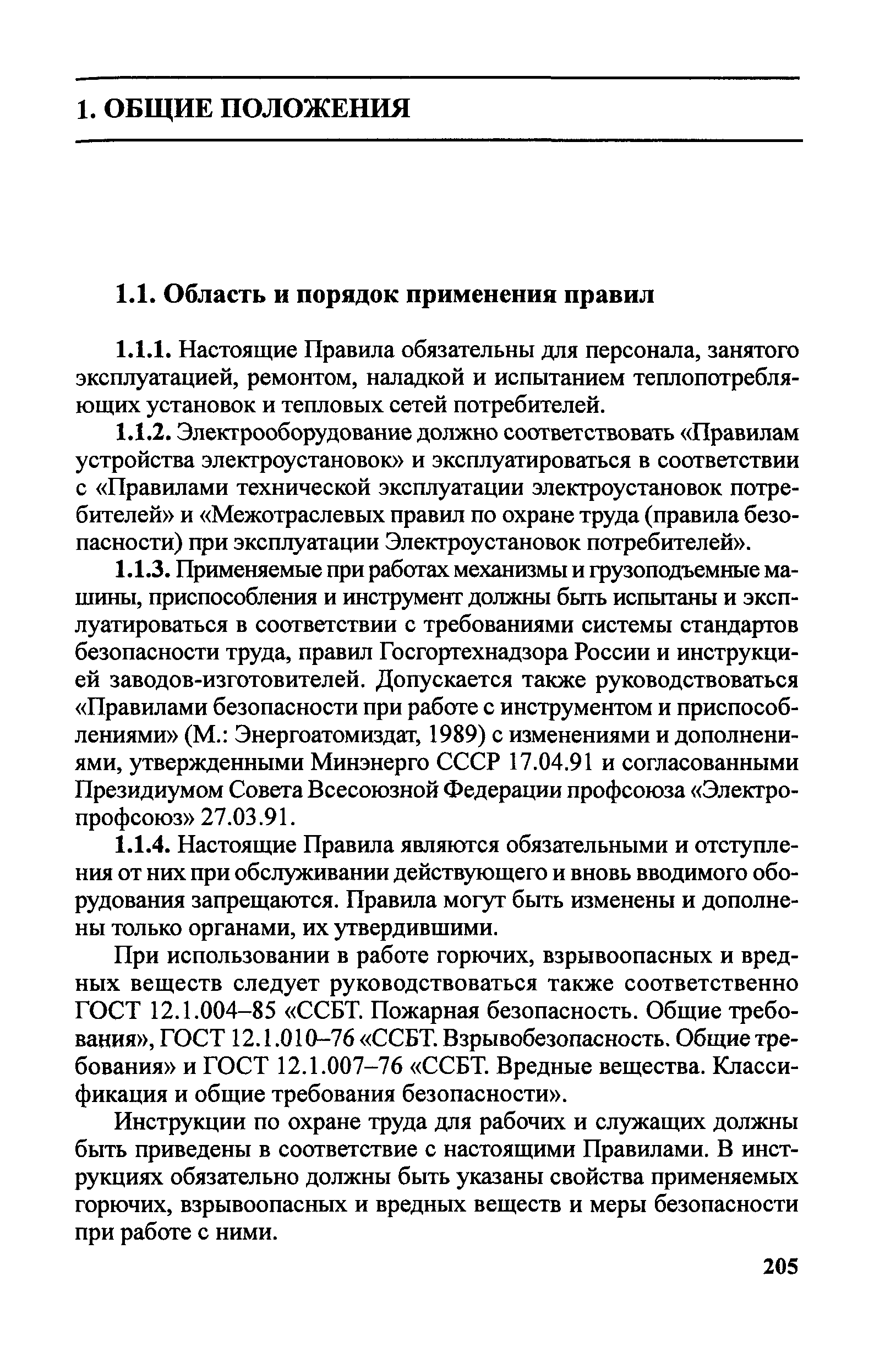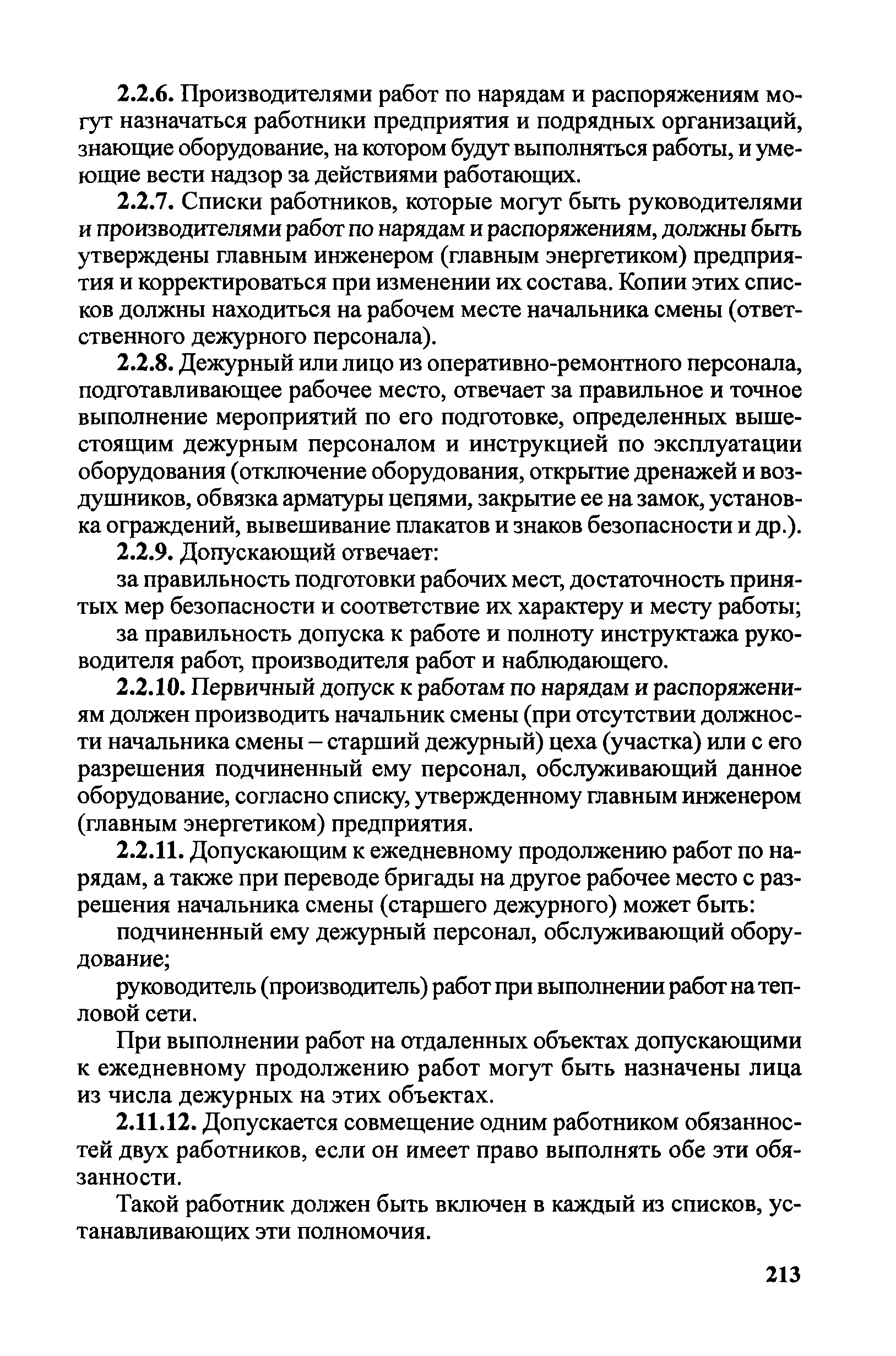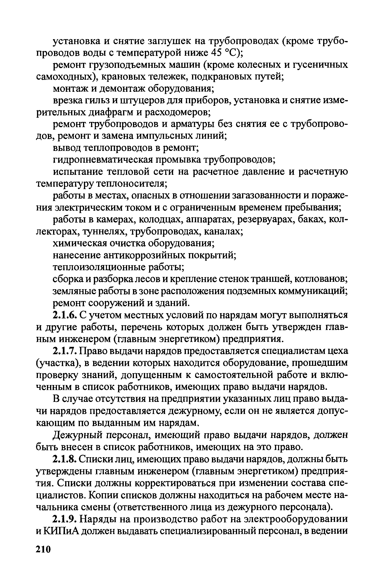 | Оглавление: | Предисловие 1 Общие положения 1.1 Область и порядок применения правил 1.2 Требования к персоналу 2 Организация мероприятия, обеспечивающие безопасность работ 2.1 Наряд, распоряжение 2.2 Ответственные за безопасность работ, их права и обязанности 2.3 Порядок выдачи и оформления наряда 2.4 Допуск бригады к работе 2.5 Надзор во время работы. Изменения в составе бригады 2.6 Оформление перерывов в работе 2.7 Окончание работы. Сдача-приемка рабочего места. Закрытие наряда 2.8 Работа подрядных организаций 3 Правила техники безопасности при выполнении отдельных работ 3.1 Территория, помещения и рабочие места 3.2 Требования к оборудованию 3.3 Обслуживание оборудования 3.4 Подъем и транспортирование тяжестей 3.5 Работа на высоте, с лесов, подмостей и других приспособлений 3.6 Сварочные работы и работы с паяльной лампой 3.7 Работа в подземных сооружениях и резервуарах 3.8 Обслуживание теплопотребляющих установок и трубопроводов 3.9 Ремонт вращающихся механизмов 3.10 Теплоизоляционные, антикоррозийные и окрасочные работы 3.11 Земляные работы 3.12 Обслуживание оборудования тепловых пунктов и тепловых сетей 3.13 Обслуживание приборов тепловой автоматики и измерений Приложение 1 Форма наряд-допуска Приложение 2 Журнал учета работ по нарядам и распоряжениям Приложение 3 Предельно допустимые концентрации вредных веществ в воздухе рабочей зоны (по ГОСТ 12.1.005-88) Приложение 4 Пределы воспламенения горючих газов в воздухе, % (по объему) Приложение 5 Знаки безопасности Приложение 6 Журнал приемки и осмотра лесов и подмостей Приложение 7 Характеристика взрывоопасных и вредных газов, наиболее часто встречающихся в резервуарах и подземных сооружениях Приложение 8 Постановление правительства Российской Федерации "О вредных и (или) опасных производственных факторах и работах, при выполнении которых проводятся предварительные и периодические медицинские осмотры (обследования), и порядке проведения этих осмотров (обследований)" Приказ Министерства здравоохранения и социального развития Российской Федерации от 16.08.2004 г. № 83 "Об утверждении перечней вредных и (или) опасных производственных факторах и работ, при выполнении которых проводятся предварительные и периодические медицинские осмотры (обследования), и порядке проведения этих осмотров (обследований)" Приложение 1 Перечень вредных и (или) опасных производственных факторах и работ, при выполнении которых проводятся предварительные и периодические медицинские осмотры (обследования) Приложение 2 Перечень работ, при выполнении которых проводятся предварительные и периодические медицинские осмотры (обследования) |