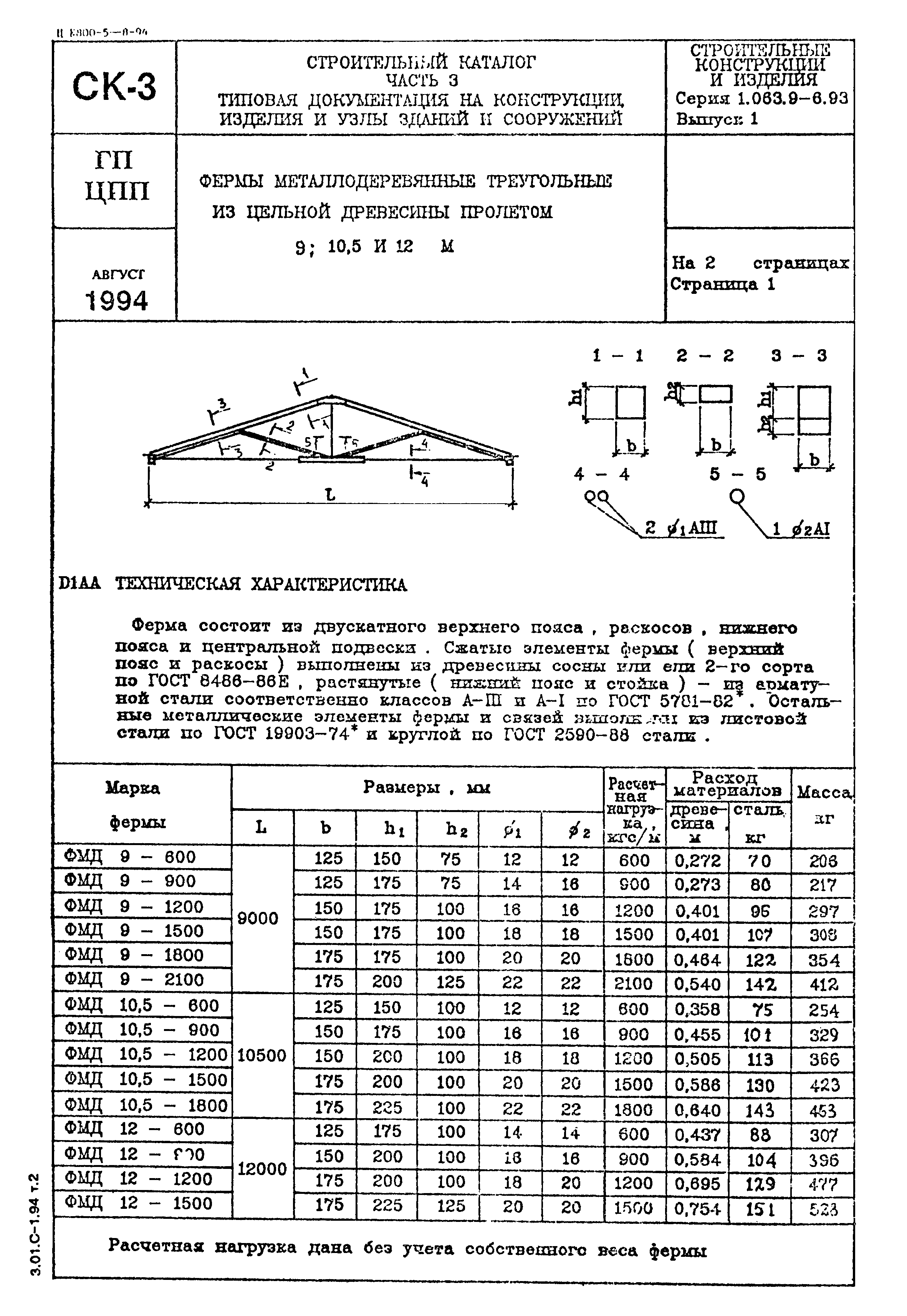 Скачать Серия 1.063.9-6.93 Фермы металлодеревянные треугольные из цельной древесины пролетами 9,0; 10,5 и 12 мДата актуализации: 01.01.2021 Серия 1.063.9-6.93
