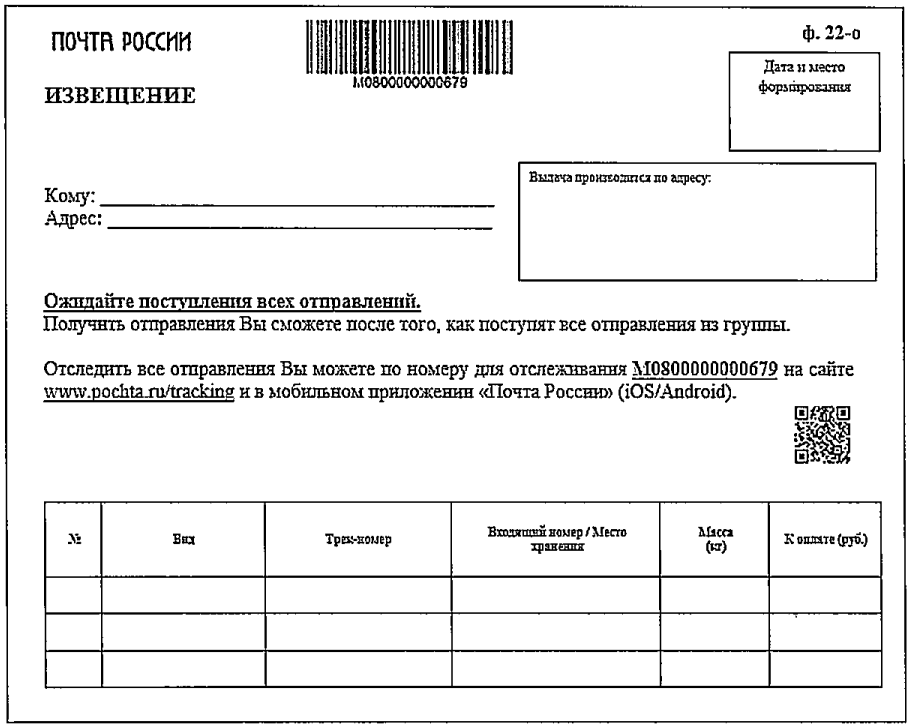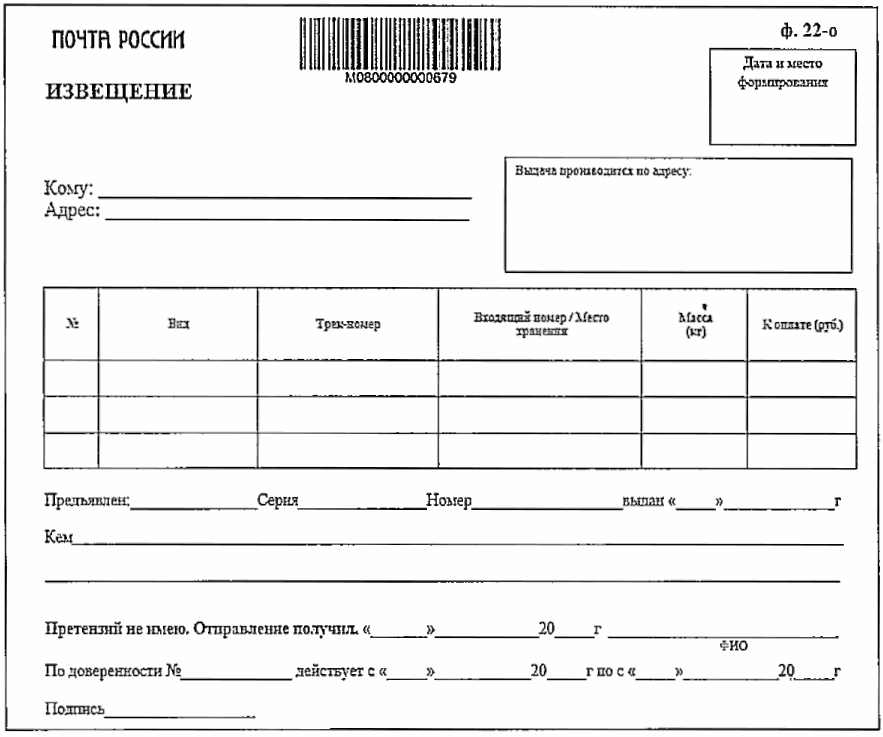 ф. 22/119 на поступившие почтовые отправления адресатам, находящимся вне поселений (дома путевых обходчиков железных дорог, лесные сторожки, метеостанции и т.д.), или их уполномоченным представителям осуществляются в отделениях почтовой связи на основе договоров, заключаемых с такими адресатами.