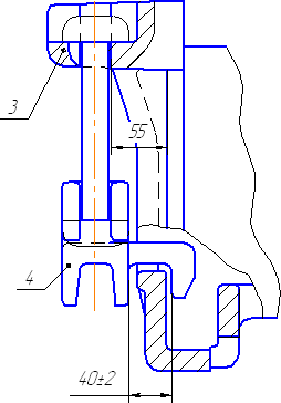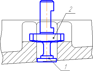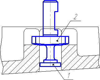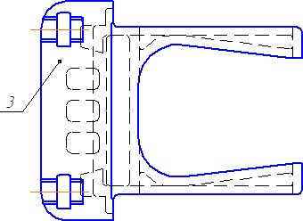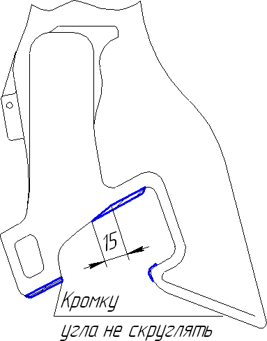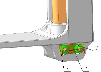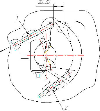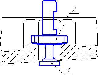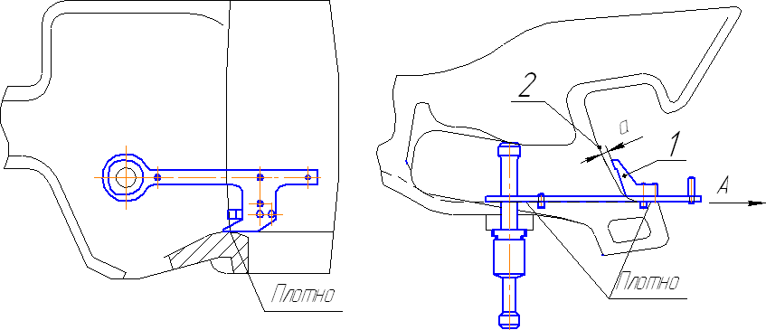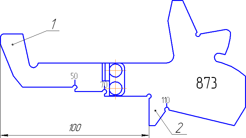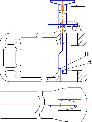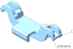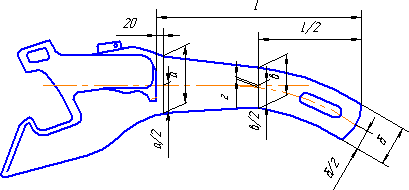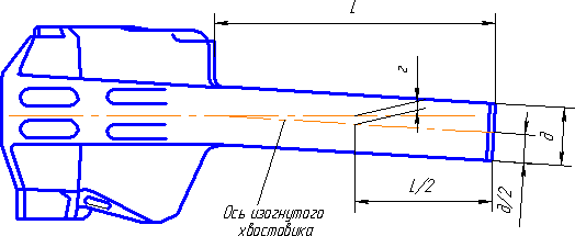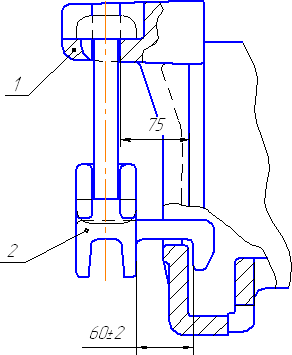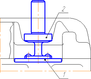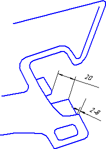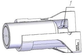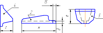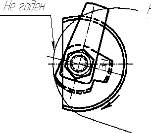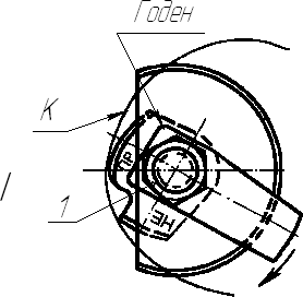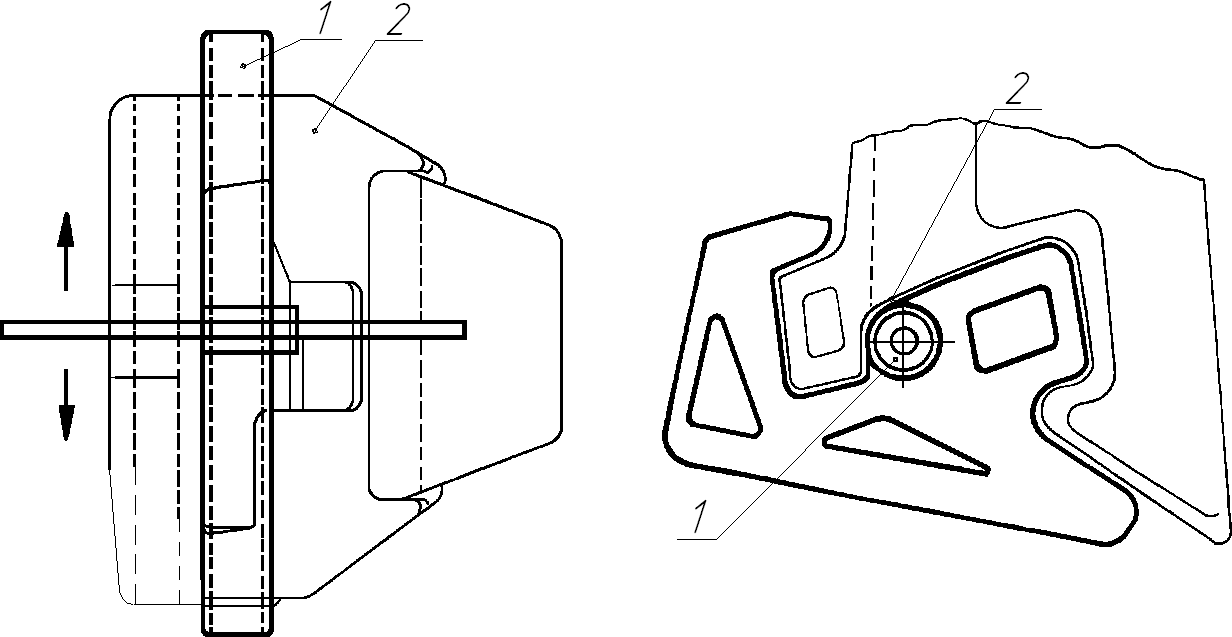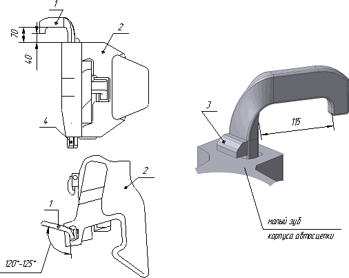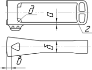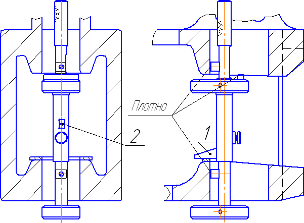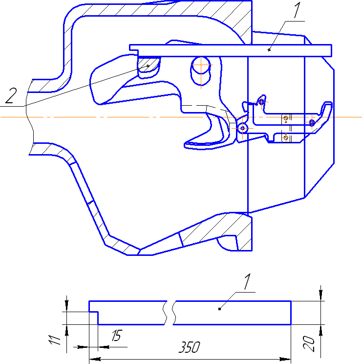 (рисунок 2.3), который перемещают в контуре зацепления по всей высоте так, чтобы направляющая труба 1 шаблона располагалась по закруглению в месте перехода малого зуба в ударную стенку 2 зева, а плоская часть проходила через зев и охватывала малый зуб. Контур годен, если шаблон свободно проходит через него по всей высоте головы корпуса.