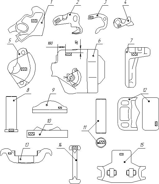 (приложение N 2). Проверку выполняют в средней части по высоте зубьев на расстоянии 80 мм вверх и вниз от продольной оси корпуса. При этом зону тяговой поверхности большого зуба, находящуюся напротив окна для лапы замкодержателя, не проверяют, так как ударная стенка зева имеет литейный уклон.