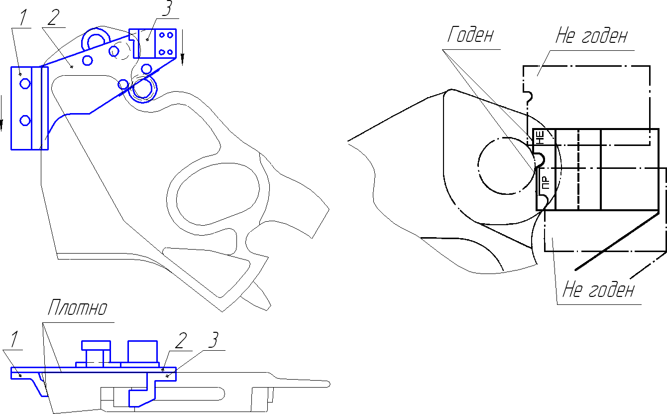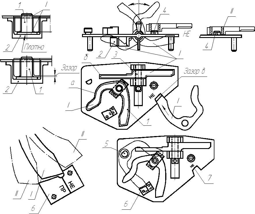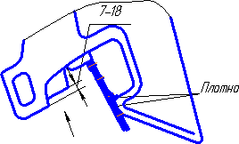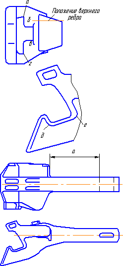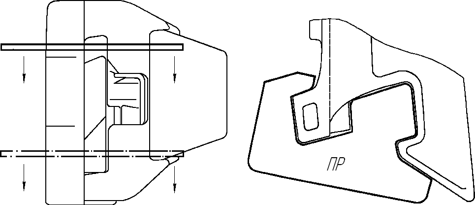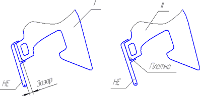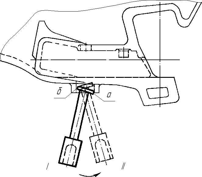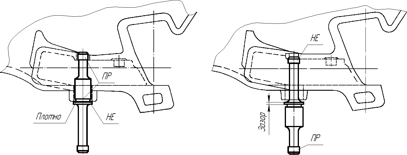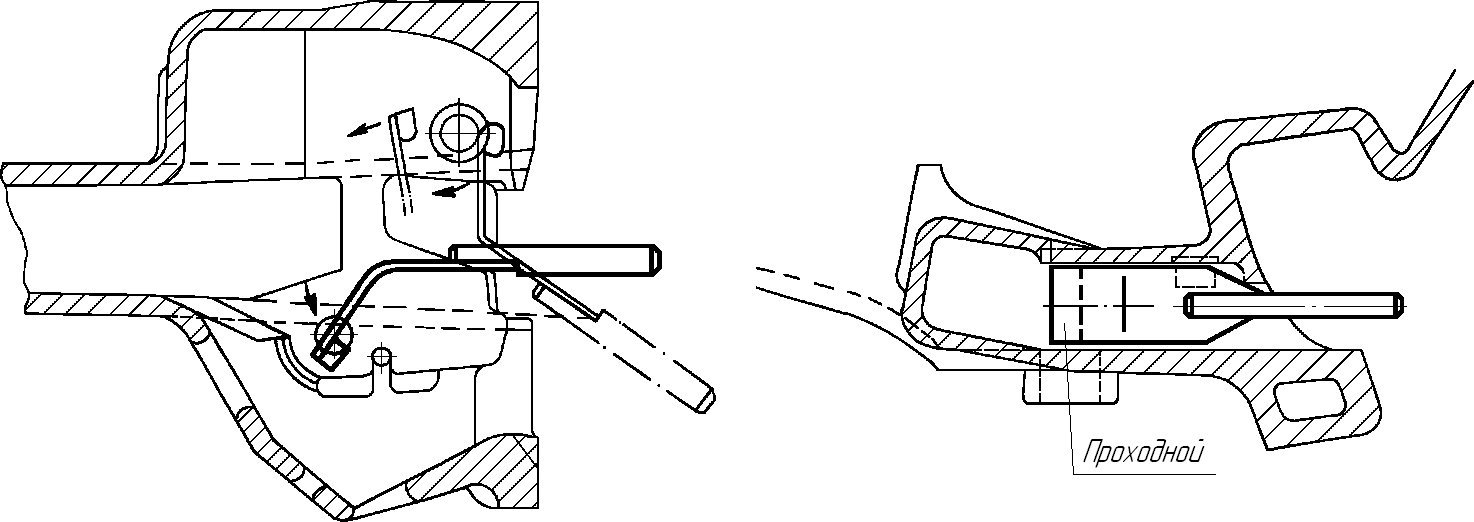 Корпус автосцепки бракуют, если непроходной щуп по всей своей ширине проходит до упора в прилив рукоятки в зазор между профильной планкой, плотно прижатой по концам к контурным листам шаблона, и проверяемой поверхностью (поз. II).