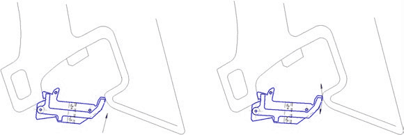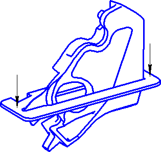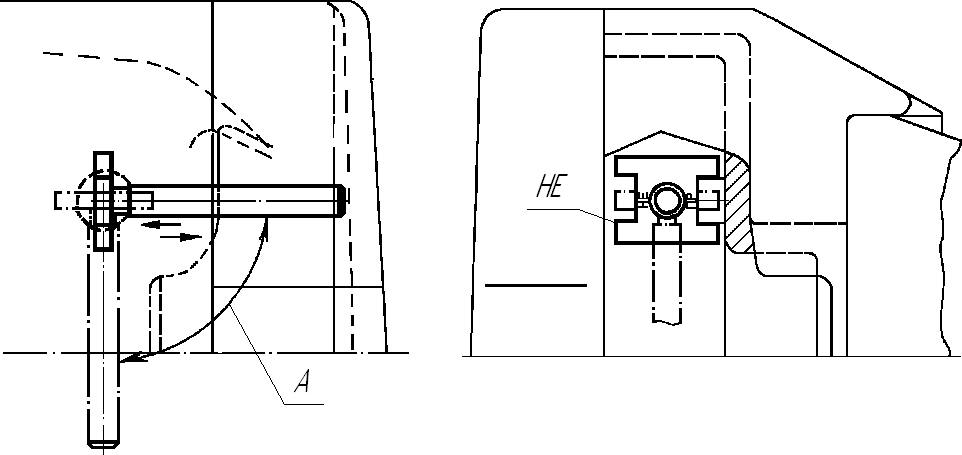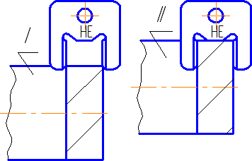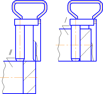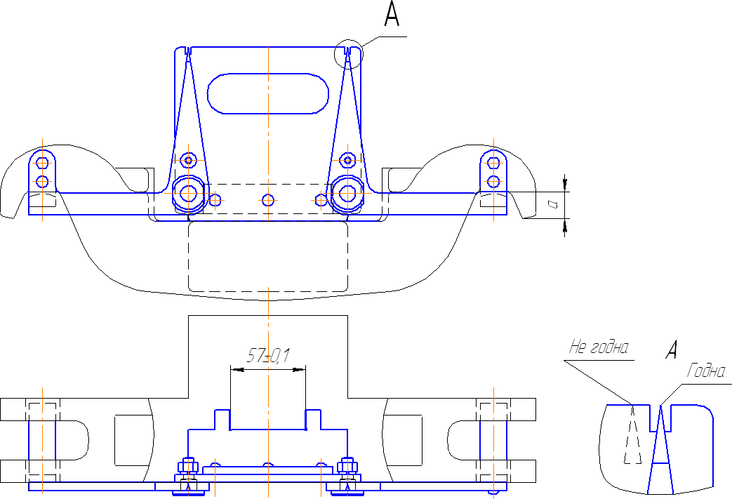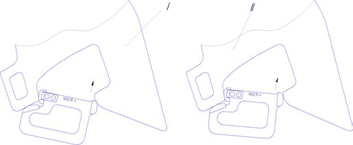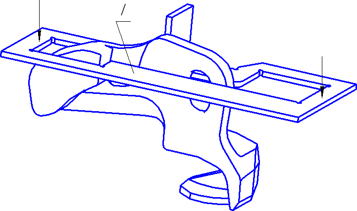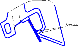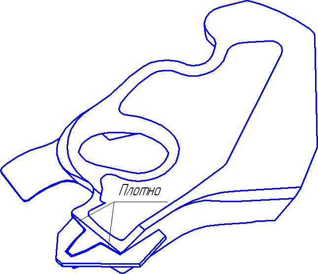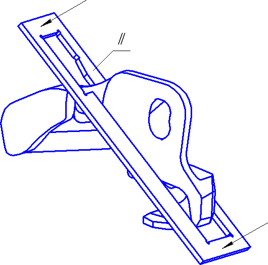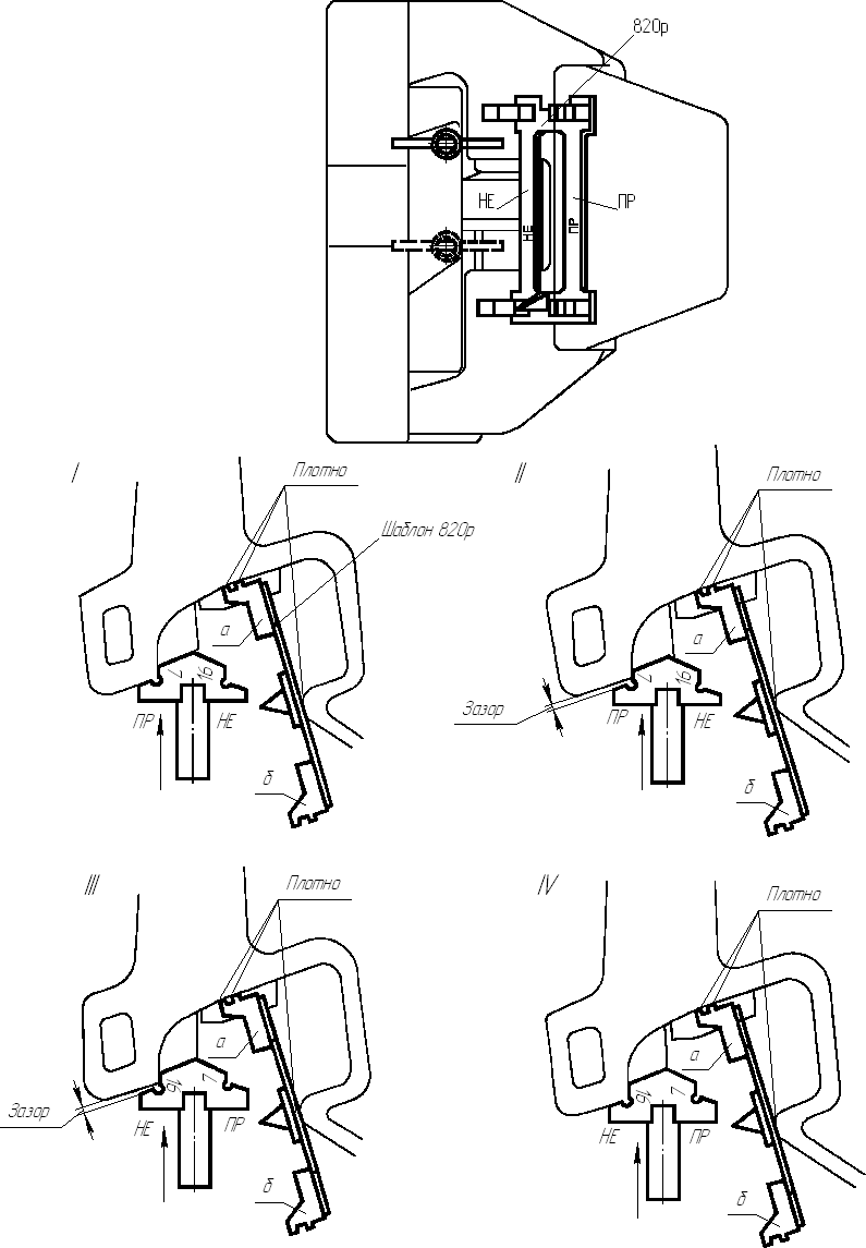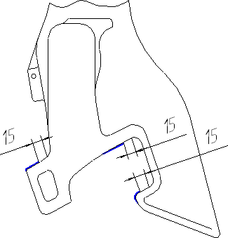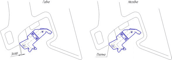 Корпус автосцепки бракуют, если непроходной щуп по всей своей ширине проходит до упора в прилив рукоятки в зазор между профильной планкой, плотно прижатой по концам к контурным листам шаблона, и проверяемой поверхностью (поз. II).
