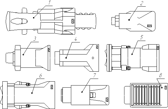 Рисунок 2.72. Детали автосцепного устройства. Поглощающие аппараты (заштрихованы места расположения клейм): 1 - Ш-6-ТО-4У-120; 2 - Ш-1-ТМ, Ш-2-В, Ш-2-Т; 3 - РТ-120, РТ-130; 4 - АПЭ-95-УВЗ; 5 - АПЭ-120-И, АПЭ-90-А, 73ZW12; 6 - 73ZW, 73ZWy, 73ZWy2; АПЭ-90-ЖДТ; 7 - ПМК-110-К23, ПМКП-110, АПМК-120-Т1, КМТ-118С, АФП-110; 8 - Р-2П, ЦНИИ-Н6