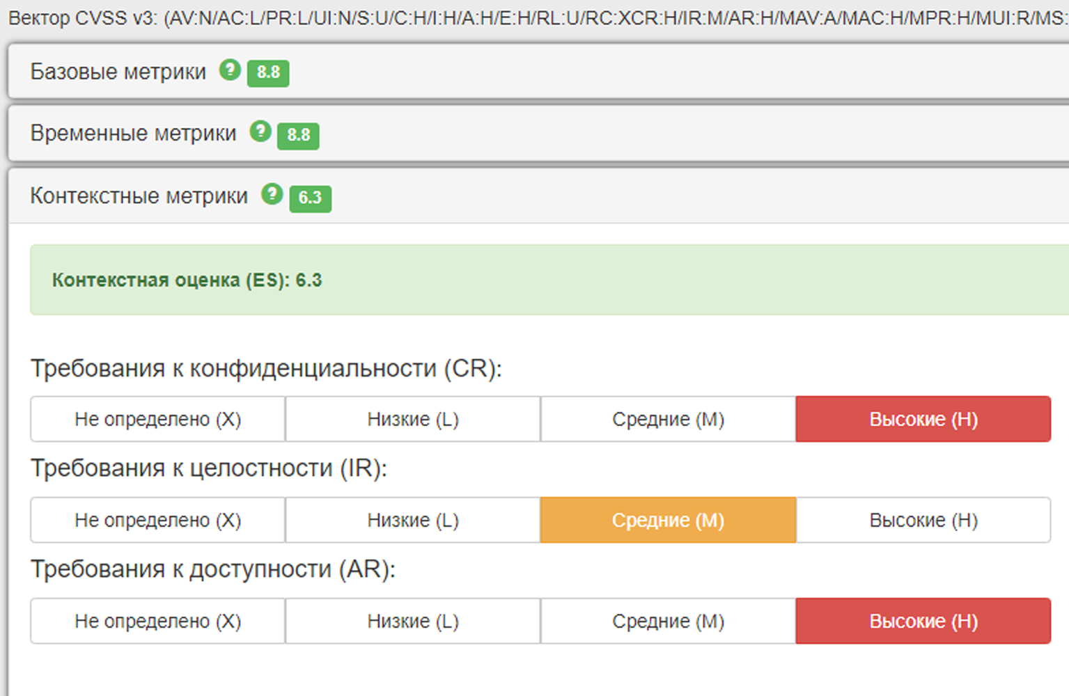Уровень опасности уязвимости применительно к конкретной информационной системе при задании оператором различных метрик в калькуляторе рассчитывается автоматически и отображается в поле "Контекстные метрики" (рисунок 4).