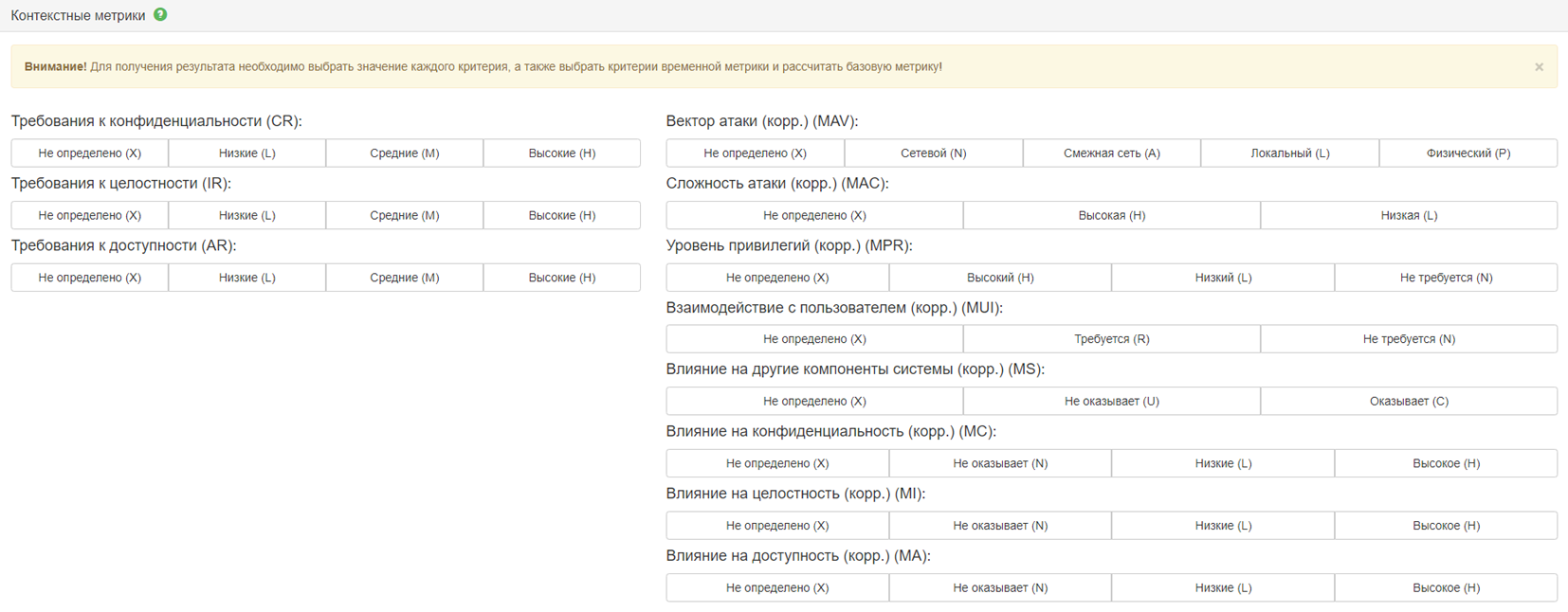 В калькуляторе необходимо определить (уточнить) базовые, временные и контекстные метрики применительно к конкретной системе и сети (рисунки 1, 2, 3).