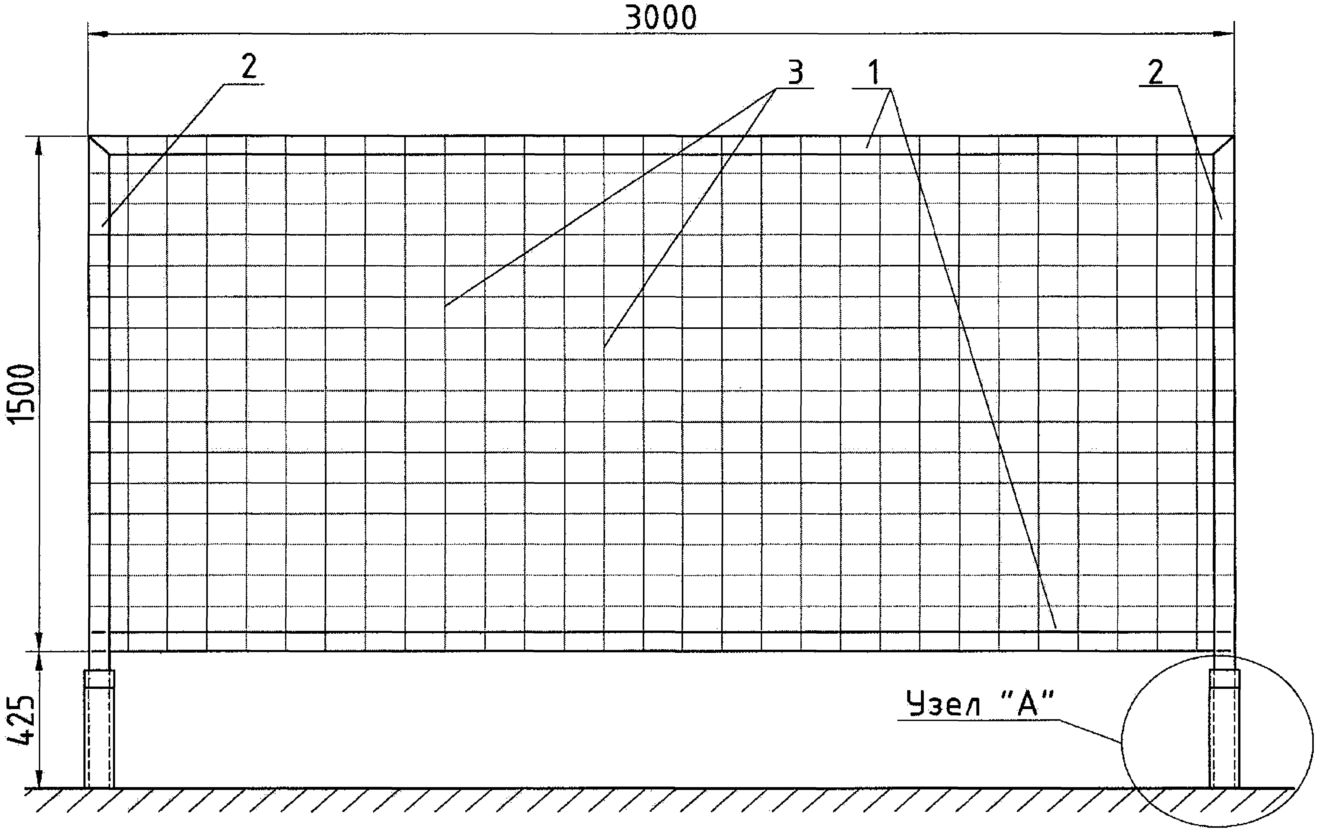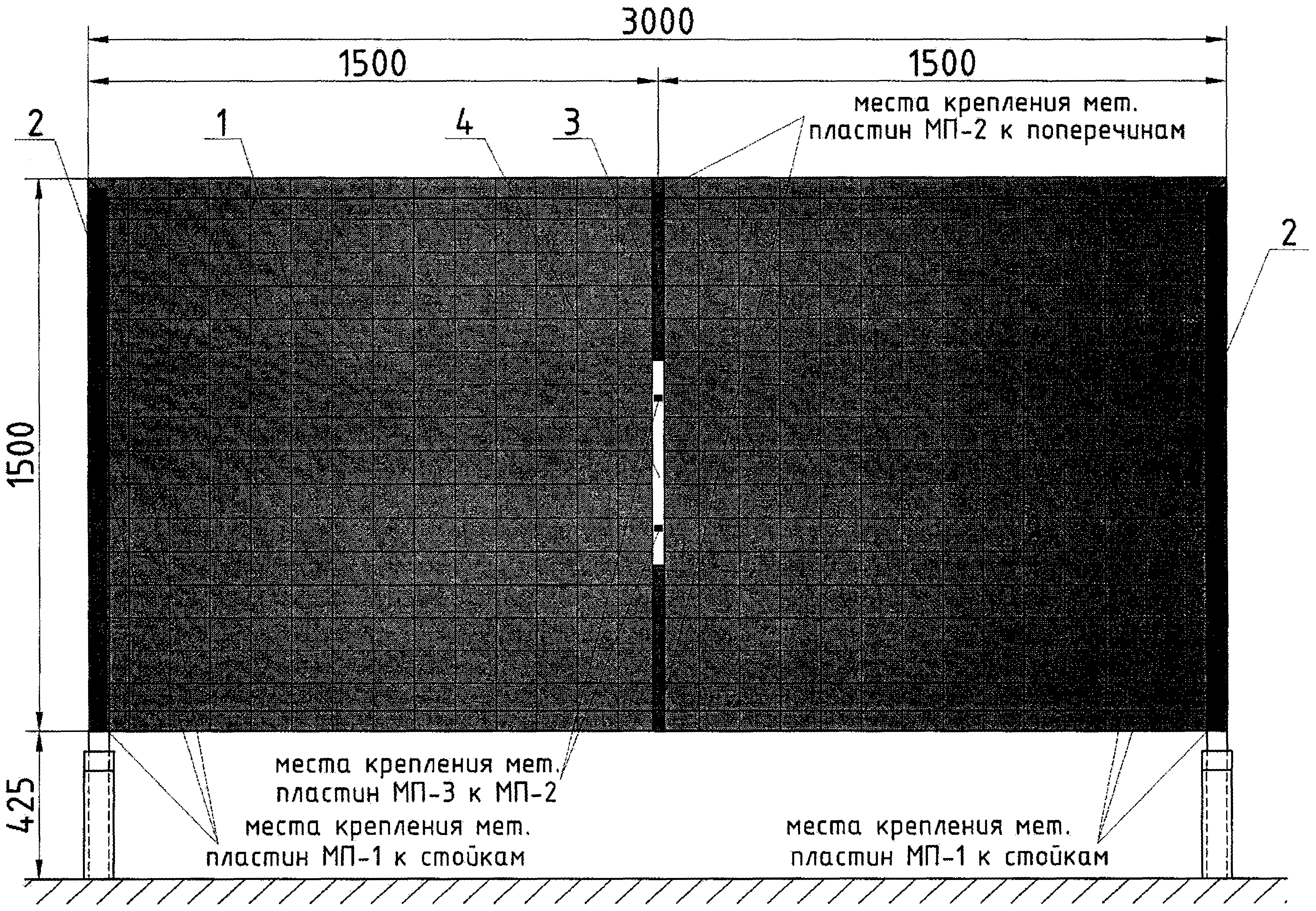 <**> Мет. пластина МП-3 крепится к МП-2 с внутренней стороны сетки по центру 2 болтами М8.