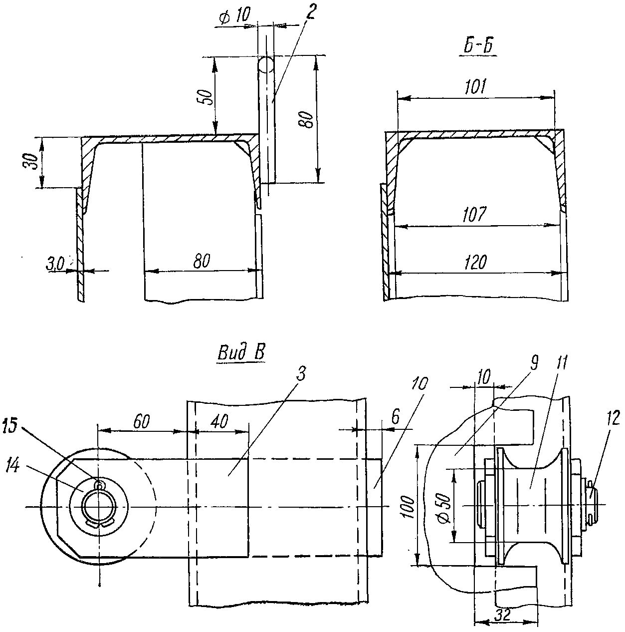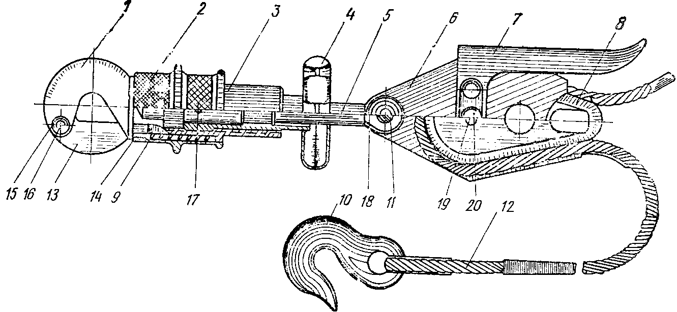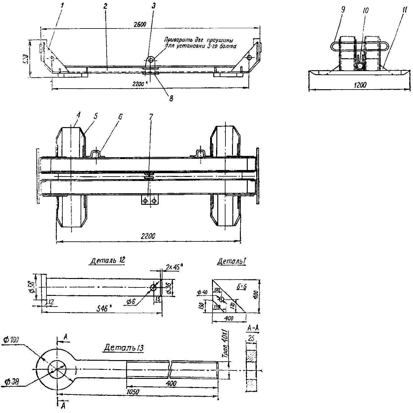 Примечание. Дет. 11 и 12 на чертеже не показаны. Палец дет. 12 вставляется в отверстие косынки дет. 1 и швеллера дет. 2. Болт специальный надевается на палец дет. 12.