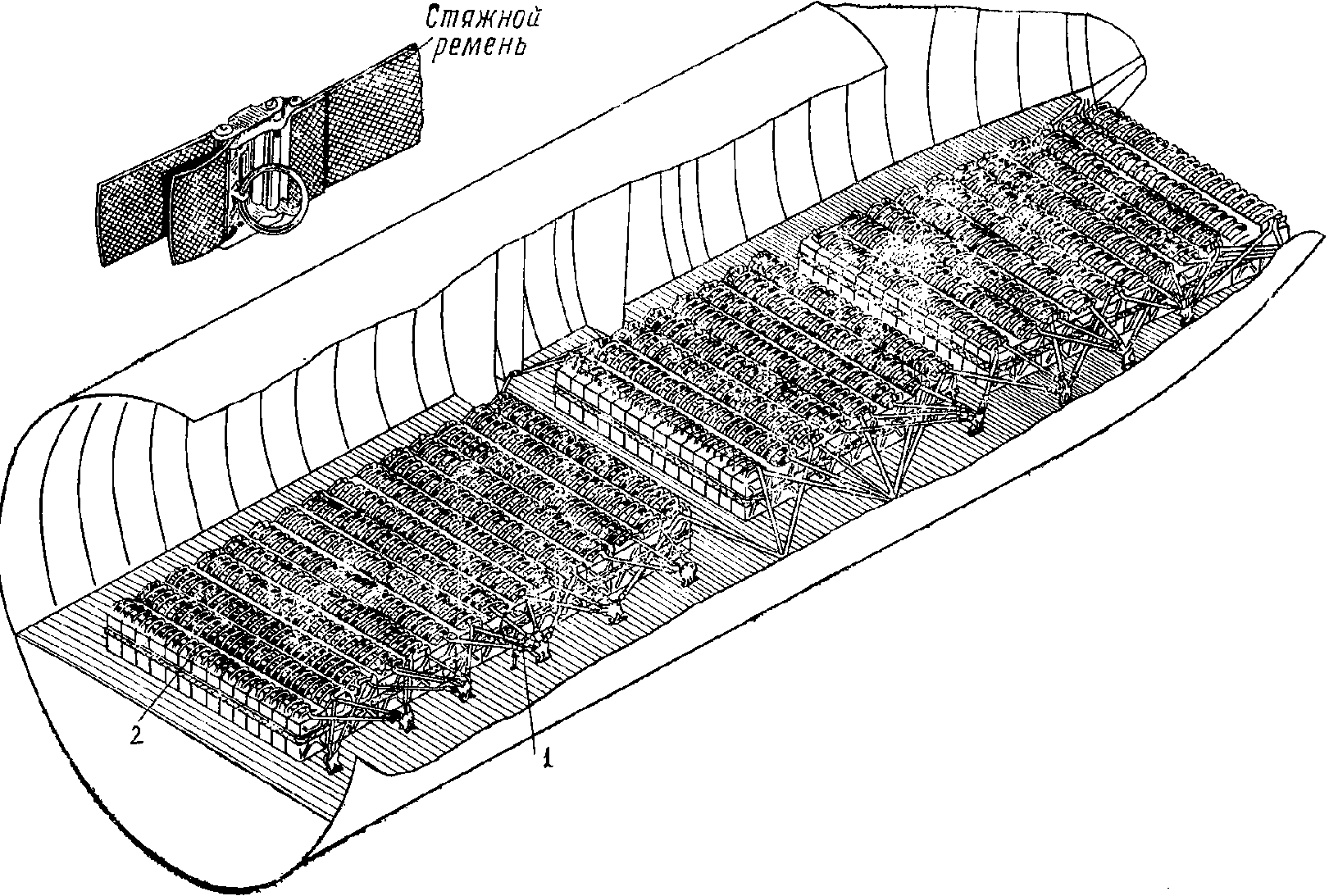 - подсоединить швартовочные замки сетки к швартовочным узлам, швартовочные ремни к сеткам, предварительно натягивая последние. Эту операцию выполняют одновременно шесть человек: по двое спереди и сзади и по одному человеку по бокам;