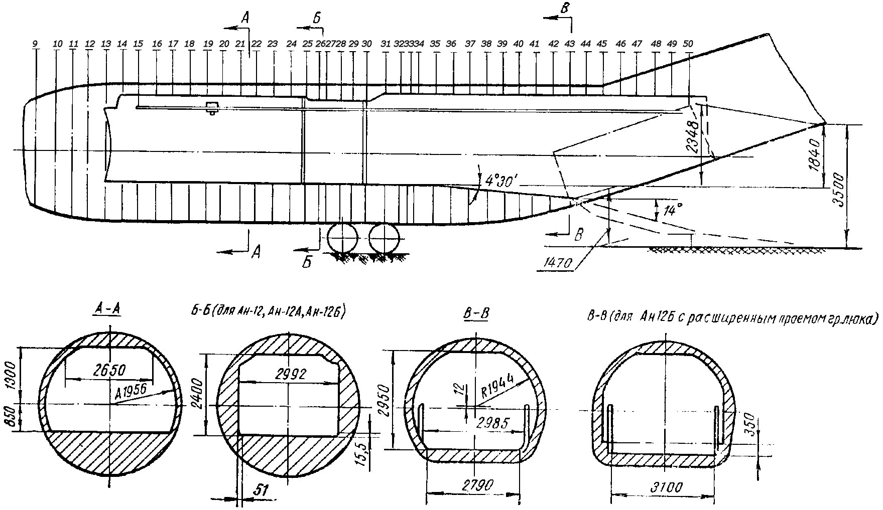 Примечания: 1. Разрешается прикладывать нагрузку Gосев = 8000 кГ на оси шпангоута N 33 и Gосев = 10000 кГ по осям шпангоутов N 25, 27 и 30 при транспортировке колесной техники с колеей не менее 1900 мм и при условии обеспечения передачи нагрузки непосредственно по осям перечисленных шпангоутов.