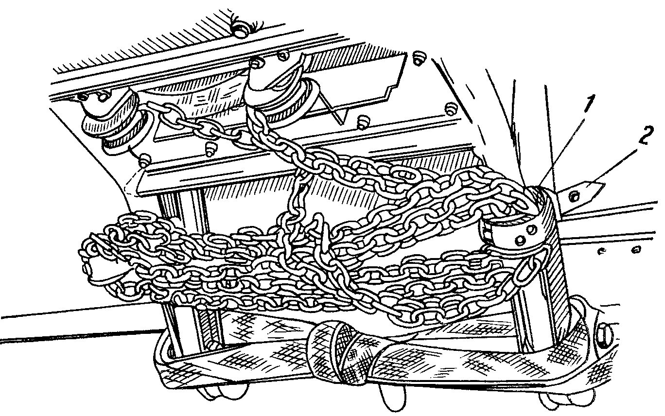 - подсоединить швартовочные замки к швартовочным узлам, а крючки рамочных замков ремней - к ячейкам сеток, предварительно натягивая последние. Эту операцию выполняют четыре грузчика: по двое с боков групп бидонов;