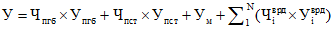 где: У - причиненный вред (ущерб) (млн. руб.); Чпгб - число погибших; Упгб - ущерб от утраты среднестатистической жизни (млн. руб.); Чпст - число пострадавших; Упст - ущерб от утраты среднестатистического здоровья (млн. руб.); Ум - материальный ущерб (млн. руб.); | ||